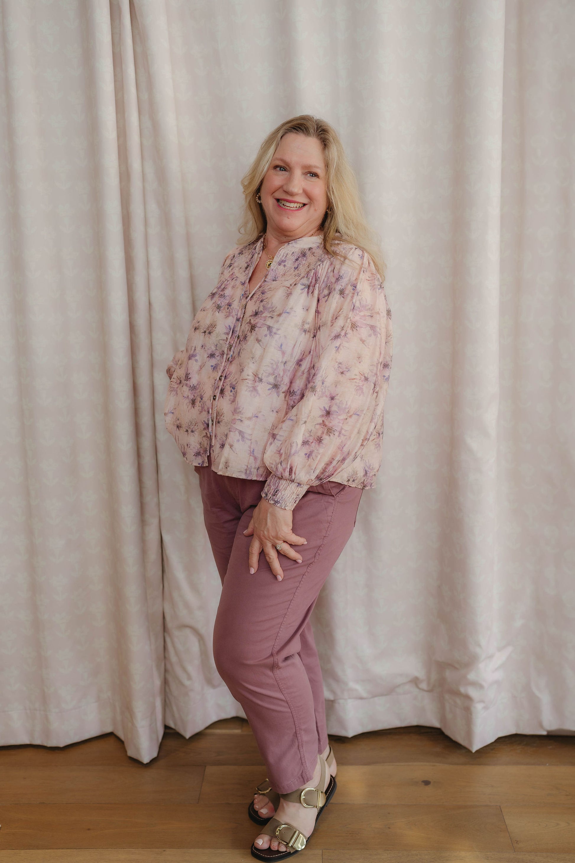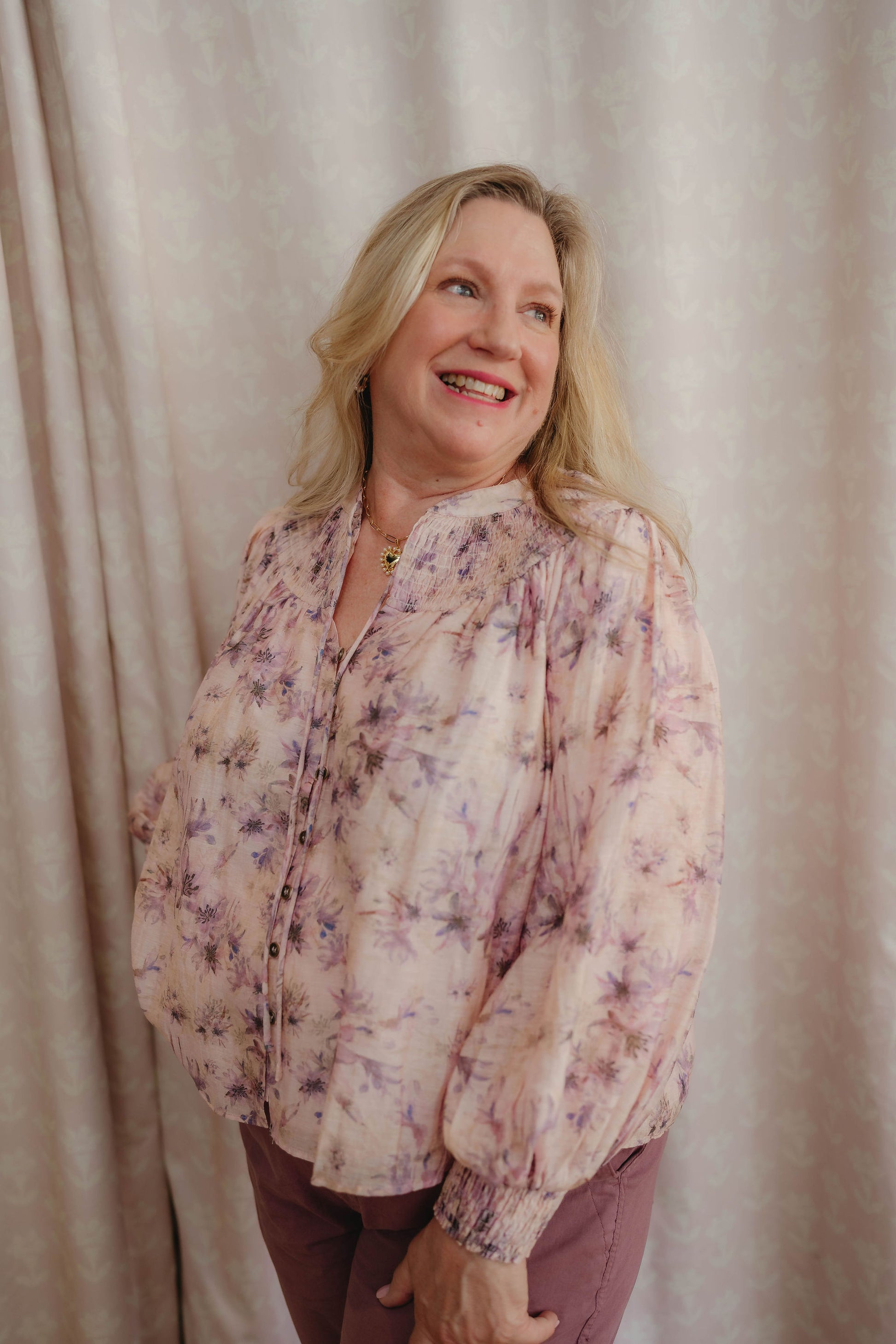The Tammy top is a lightweight, longsleeve, lilac floral top! Fit is true to size & flowy!