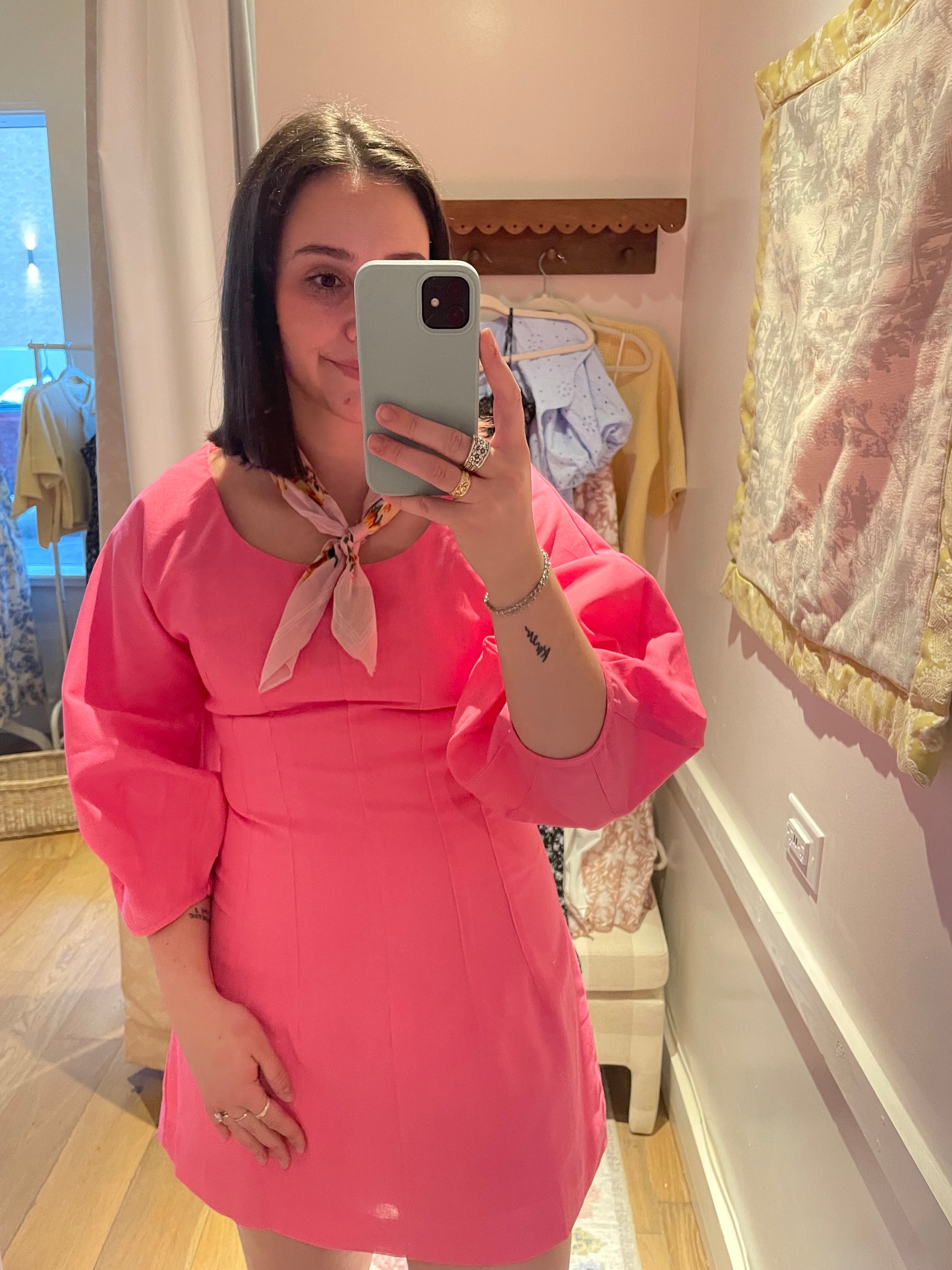 The Larissa dress is a bright pink boat neck dress with 3/4 puff sleeves. The bodice is more fitted with a flare towards the bottom. If in between sizes, size up!