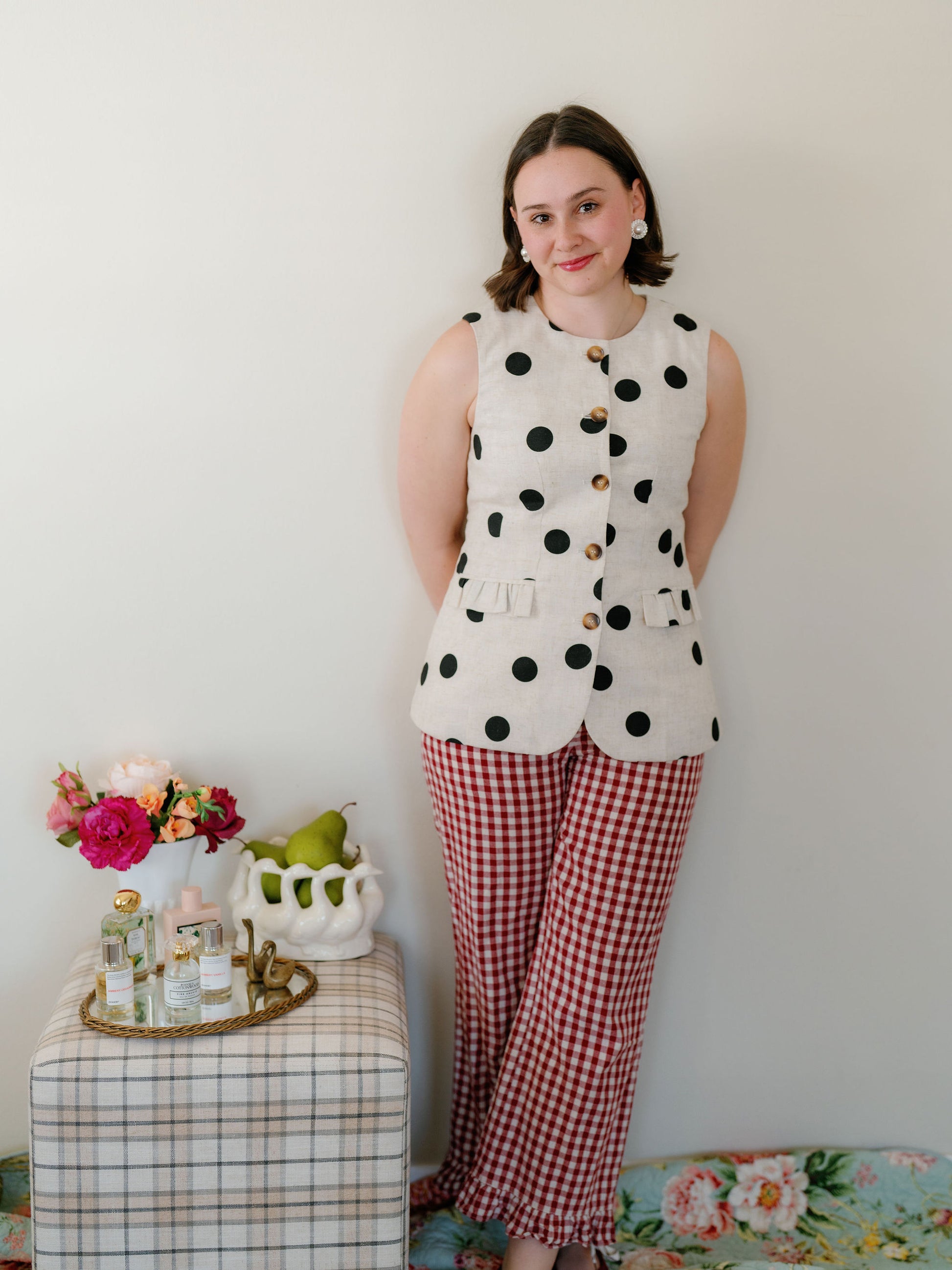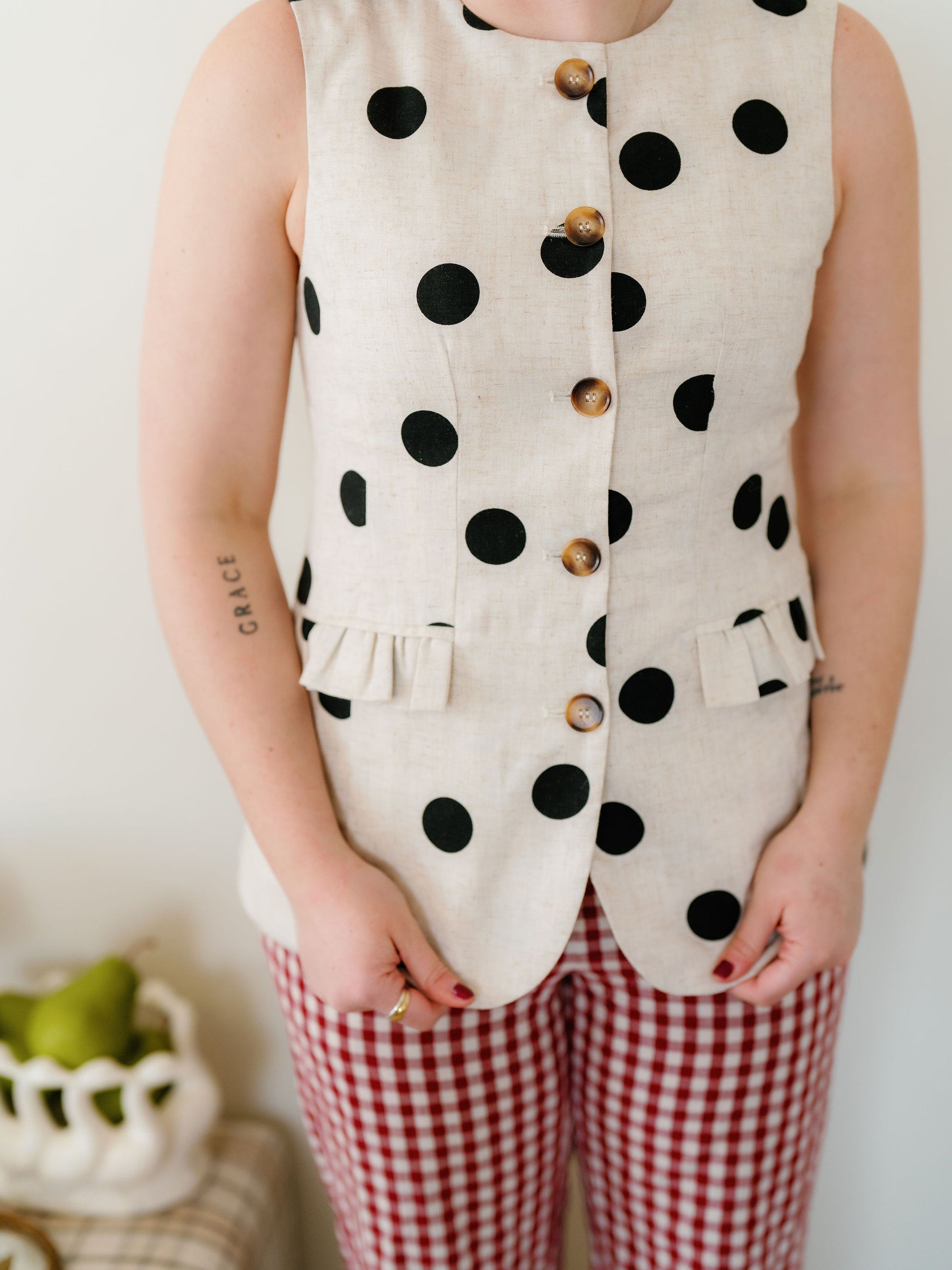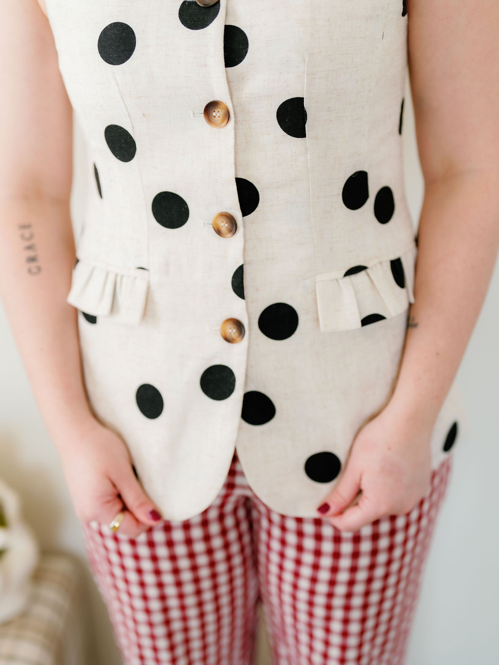 Selma is the prettiest little blazer top with polka dots throughout, precious pocket details and an option to adjust the back. I sized down in this one but you could stay true to size & adjust the back!