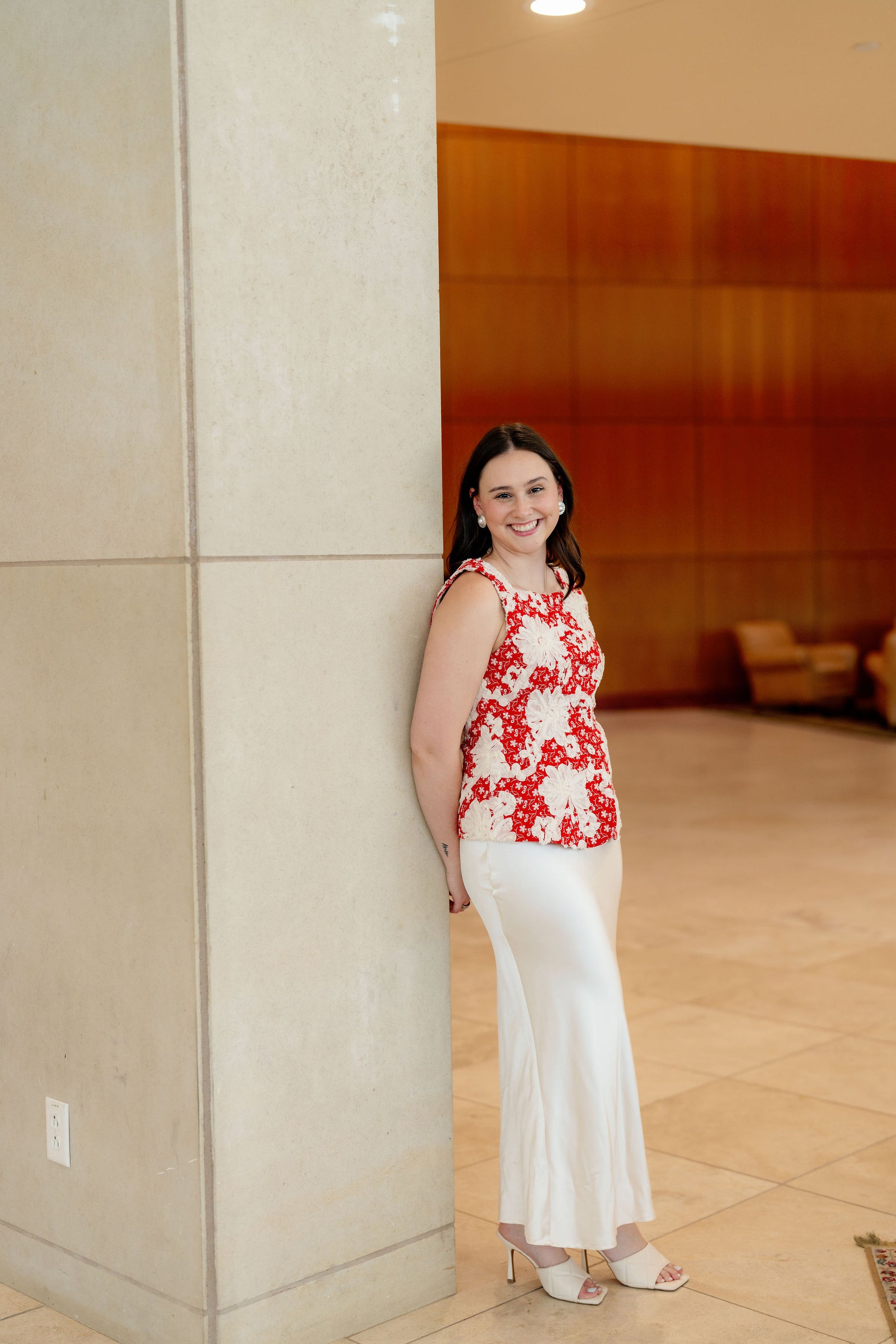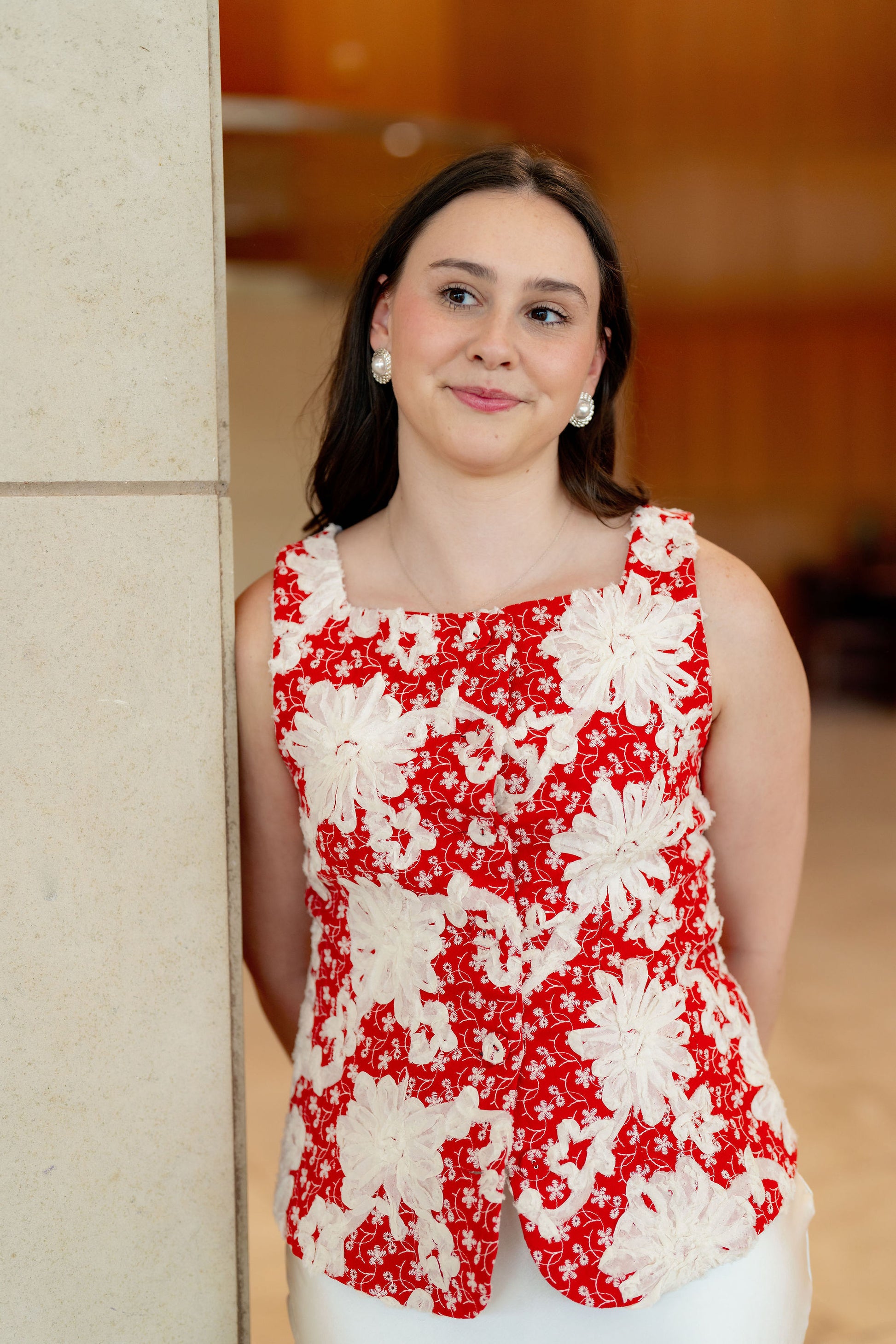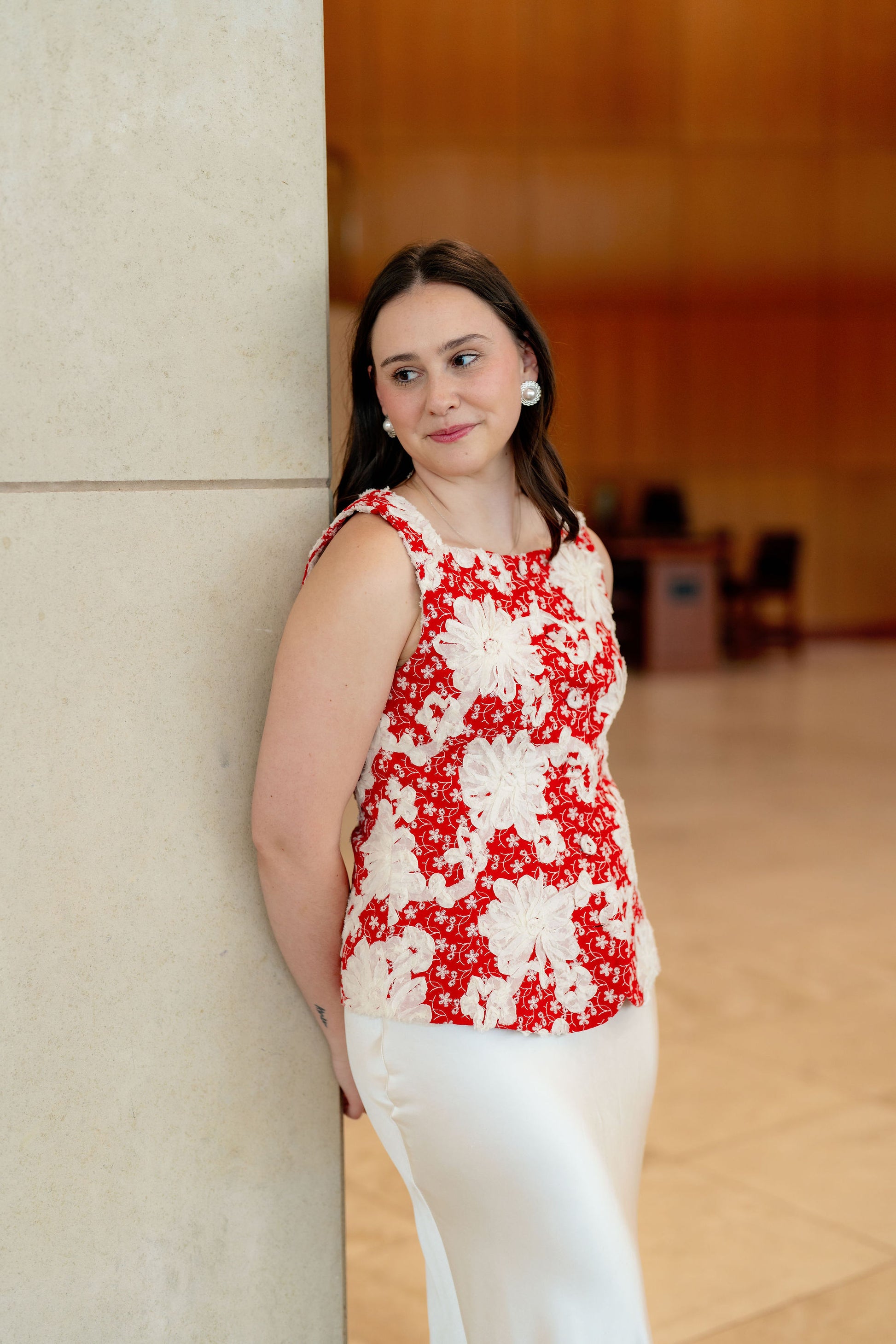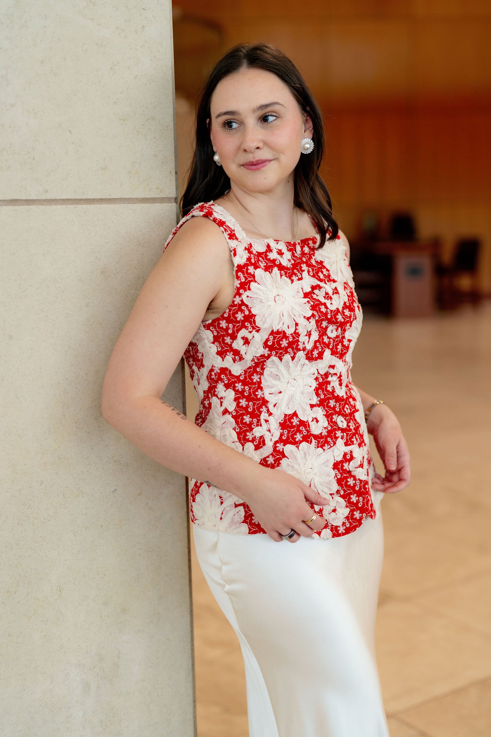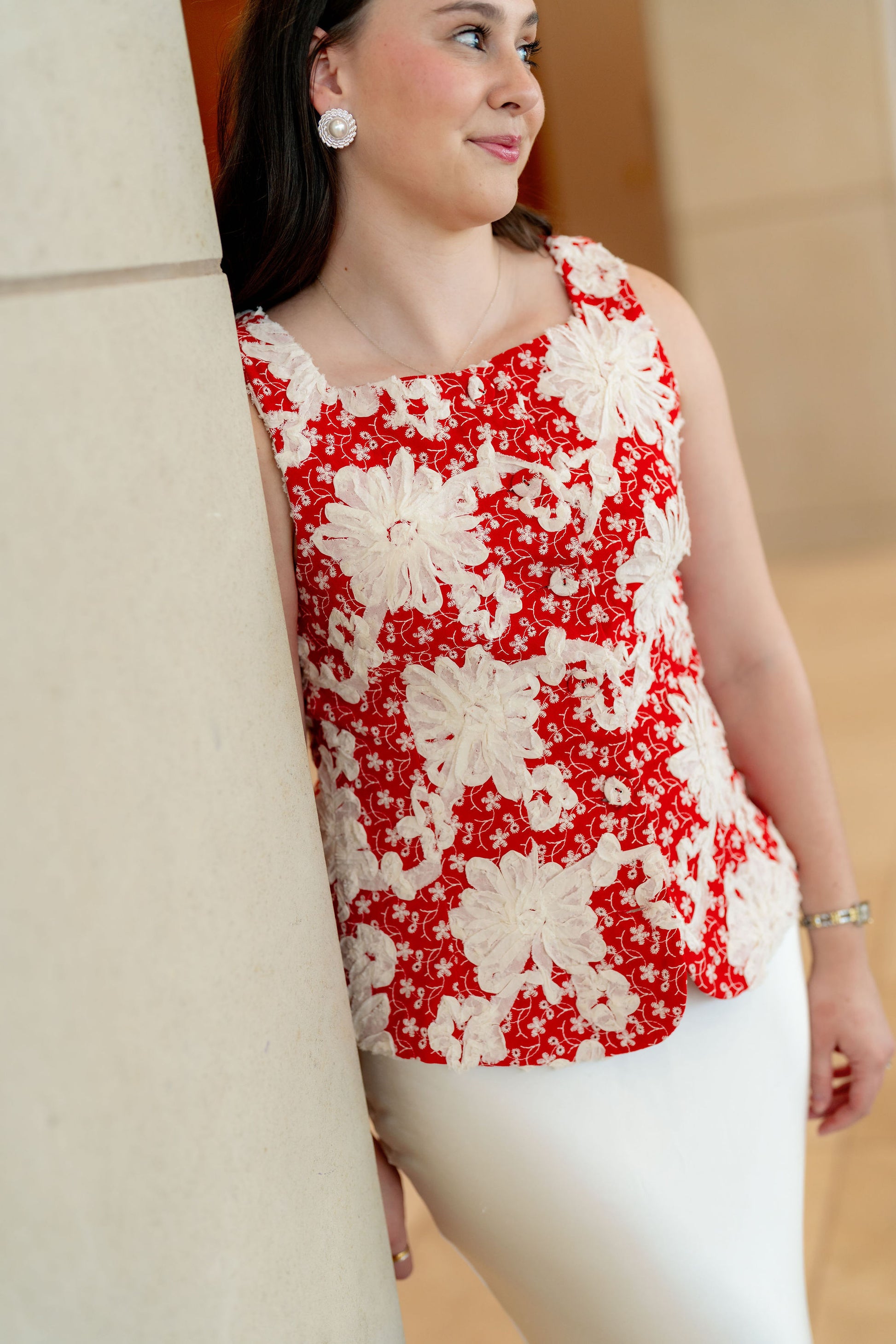The Ayanna top is a red and cream appliquéd vest that fits beautifully! I love that this one can be worn all year in so many ways! Fit is true to size.