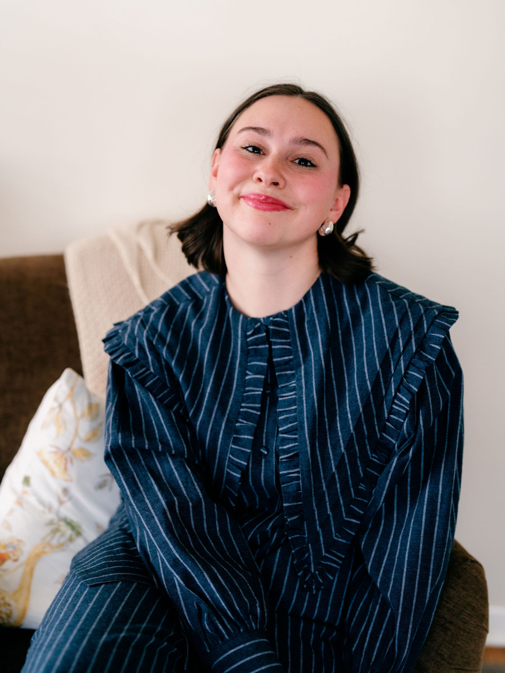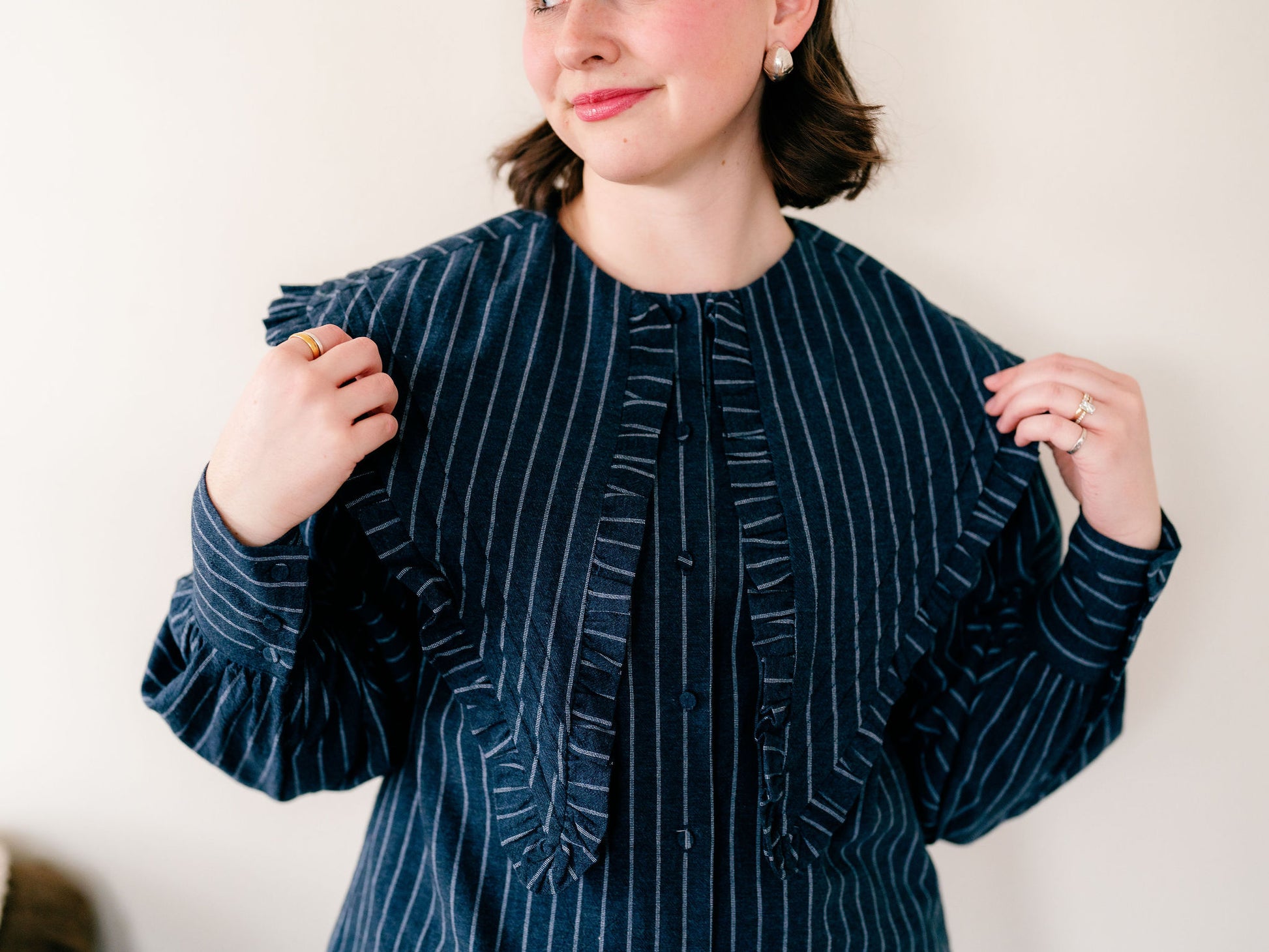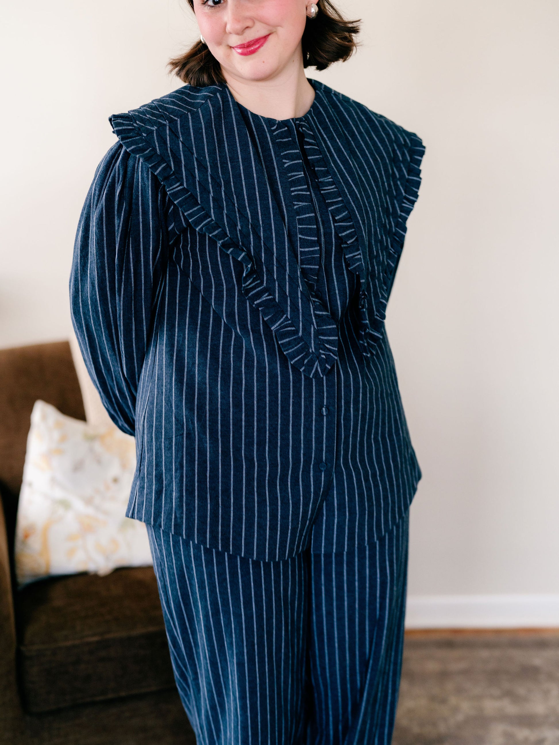I don’t have much to say except that I really love this top! The Fran top has the sweetest sleeve details, fun stripes, dainty buttons and the coolest collar! Fit is true to size. Add the Fran pants for a fun set!