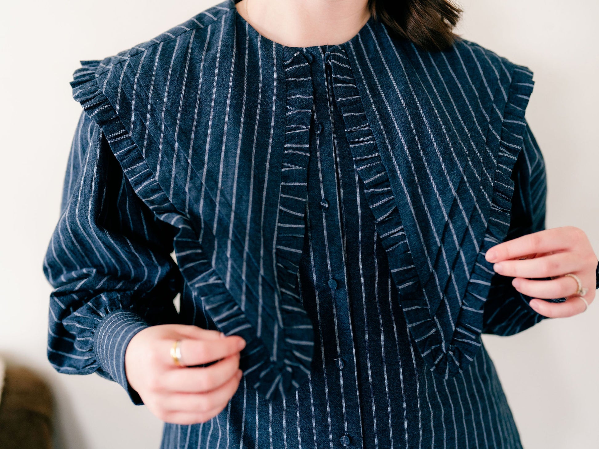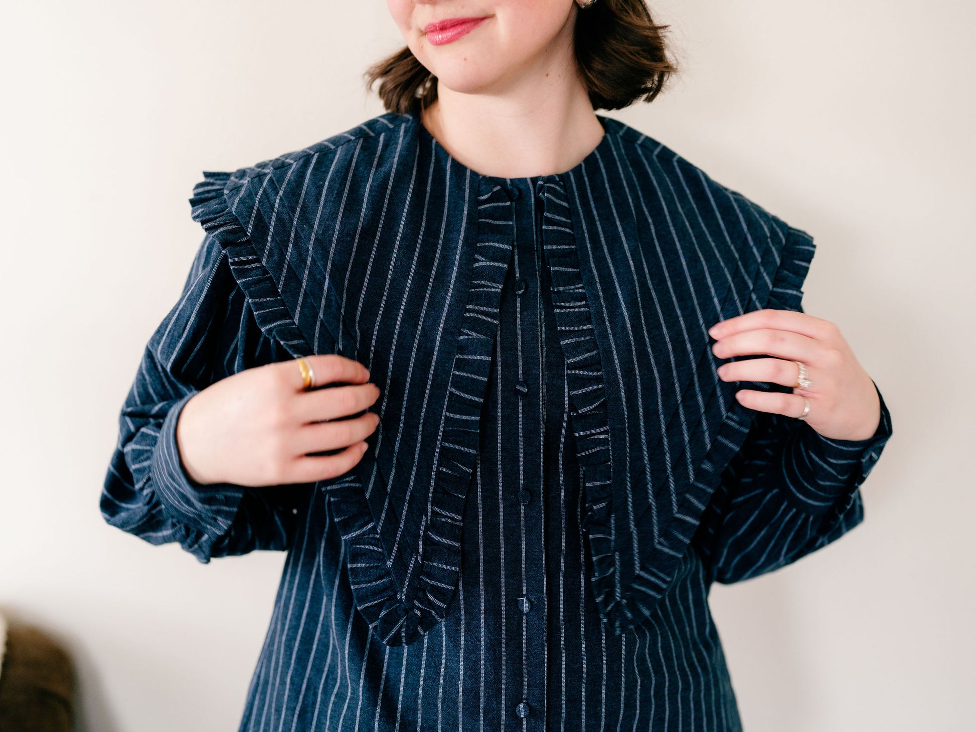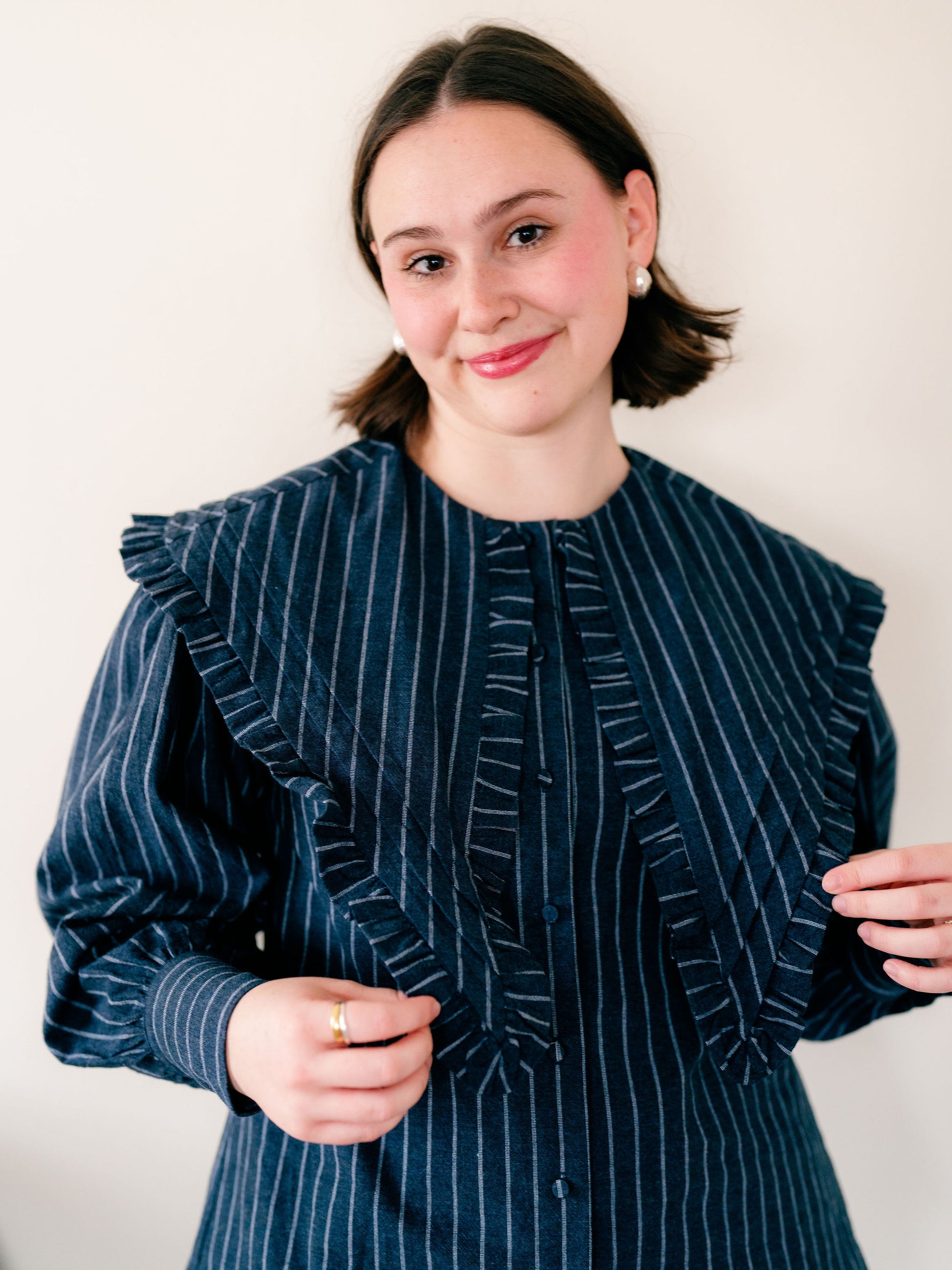 I don’t have much to say except that I really love this top! The Fran top has the sweetest sleeve details, fun stripes, dainty buttons and the coolest collar! Fit is true to size. Add the Fran pants for a fun set!