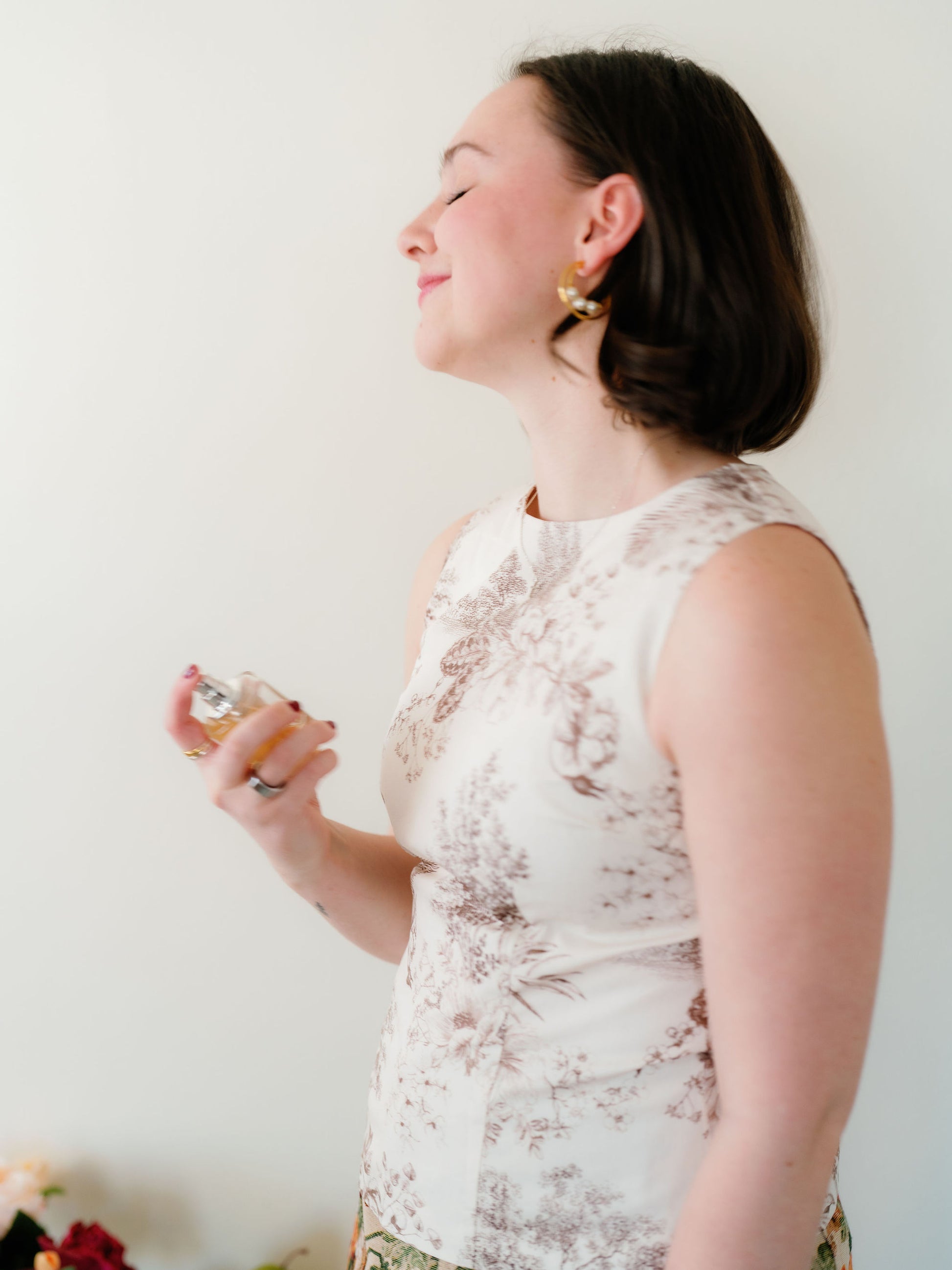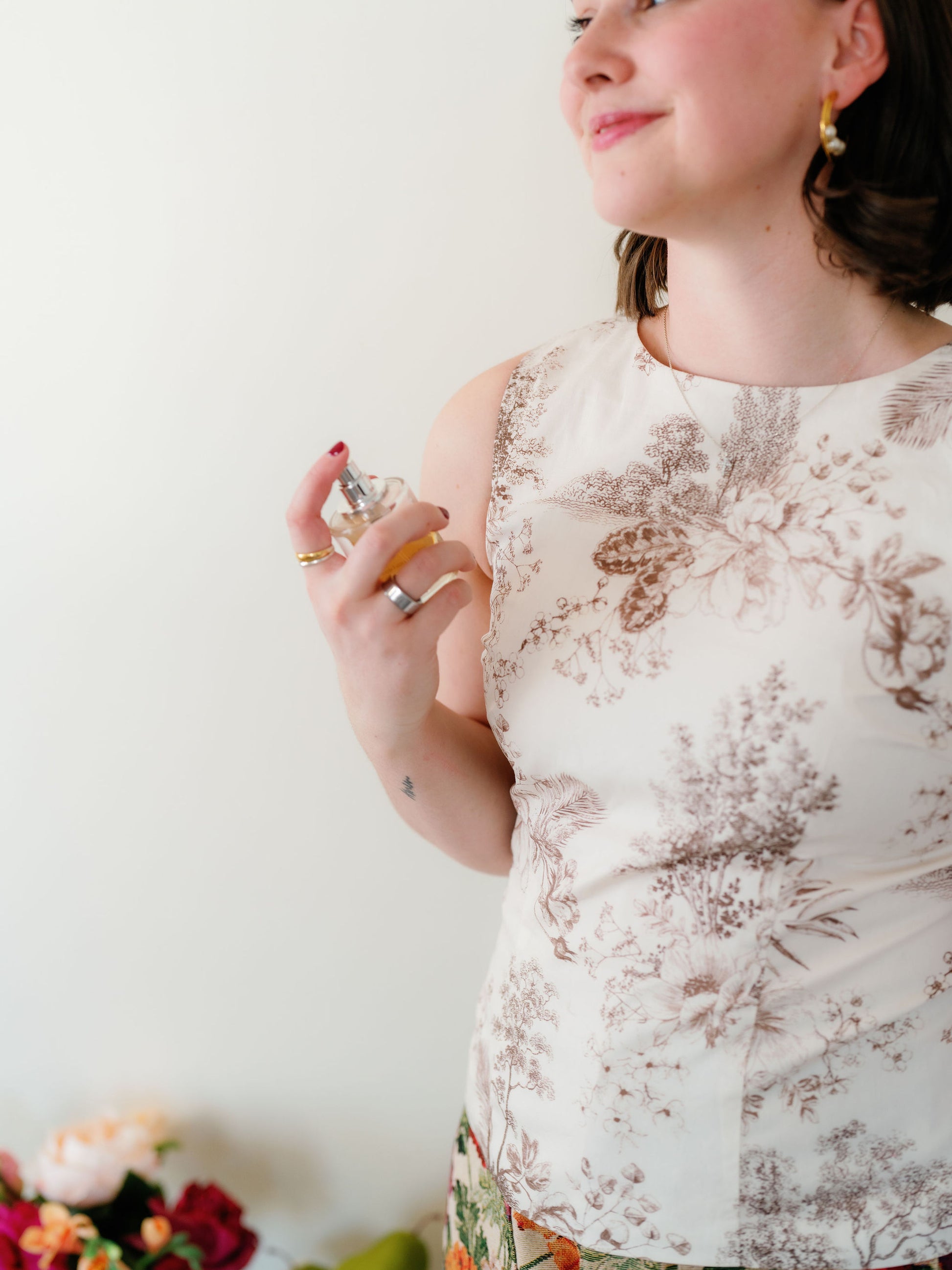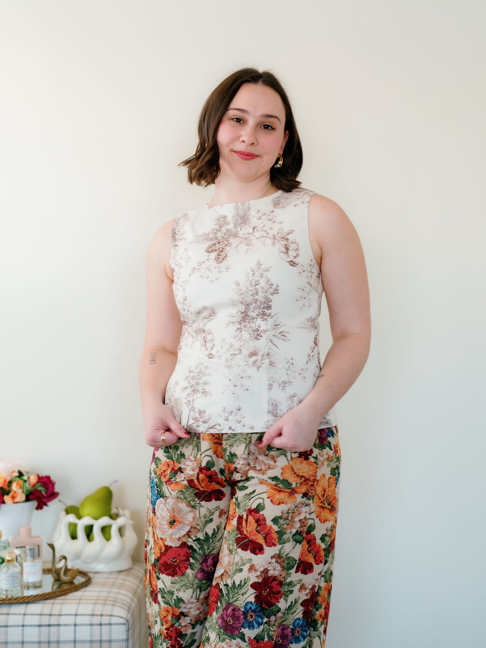 The Ambrose top is a sleeveless, zipper back peplum top with the prettiest toile print! The fit is *chef’s kiss* and it can pair with so many outfits. Size up if in between sizes or if you have a larger chest!