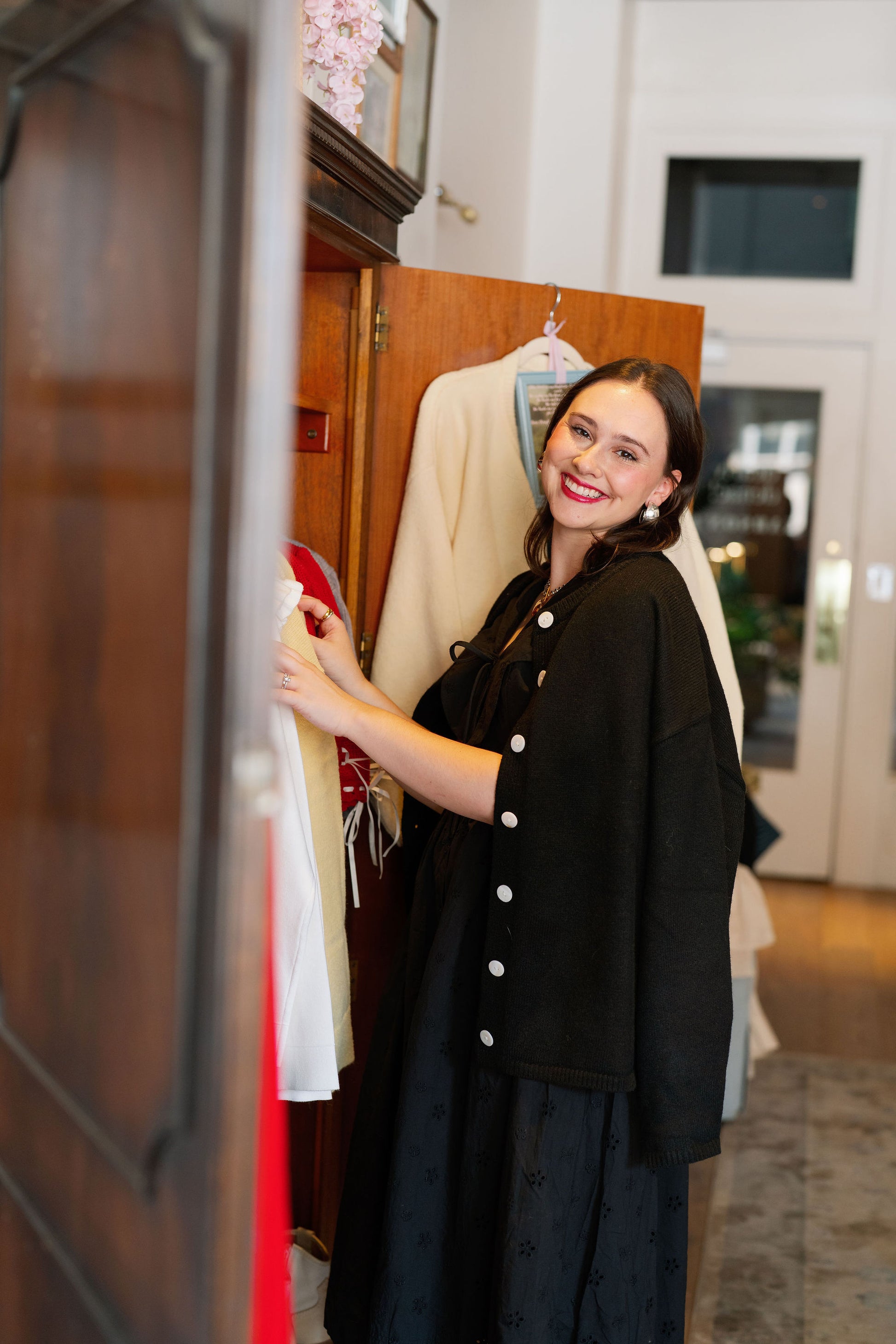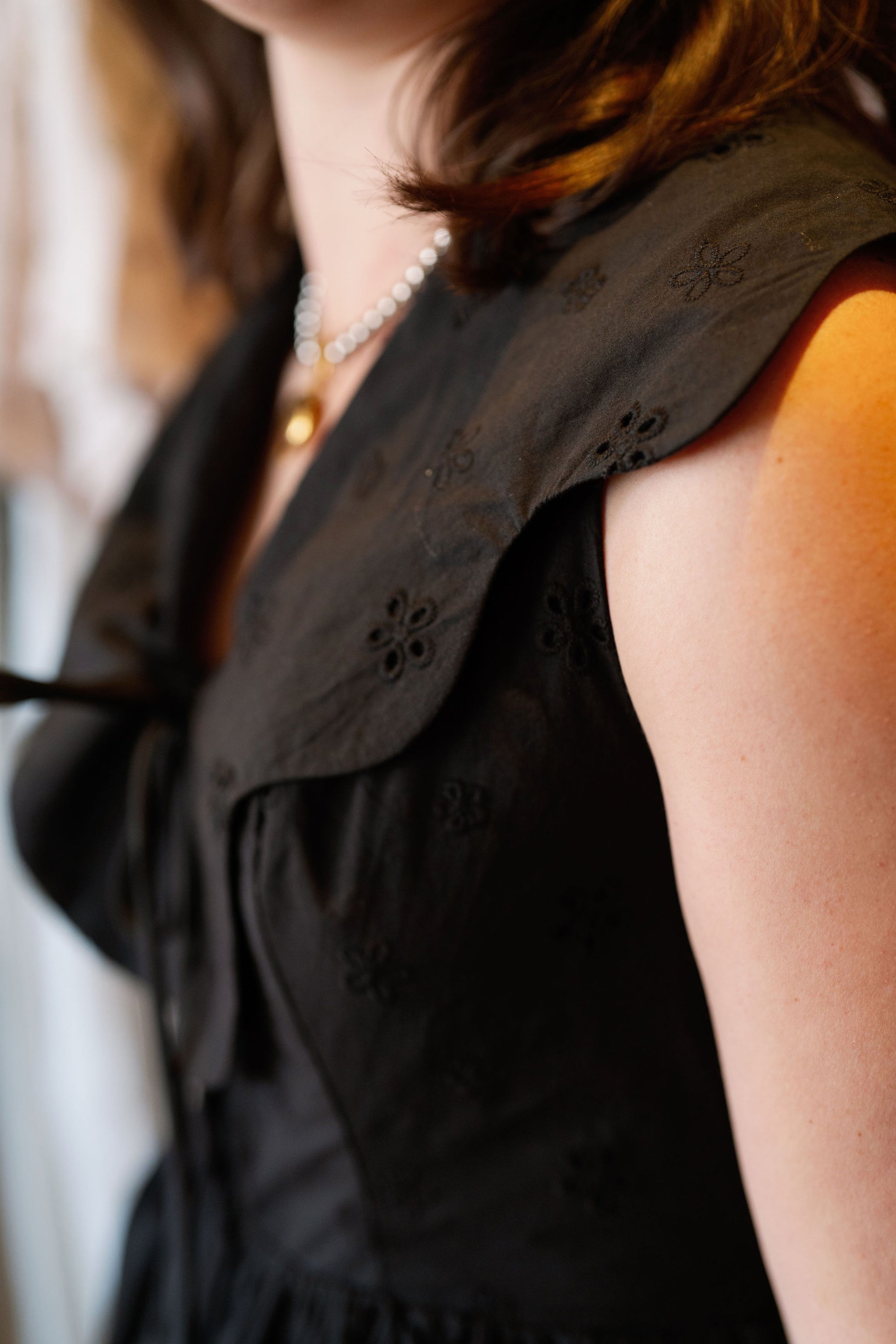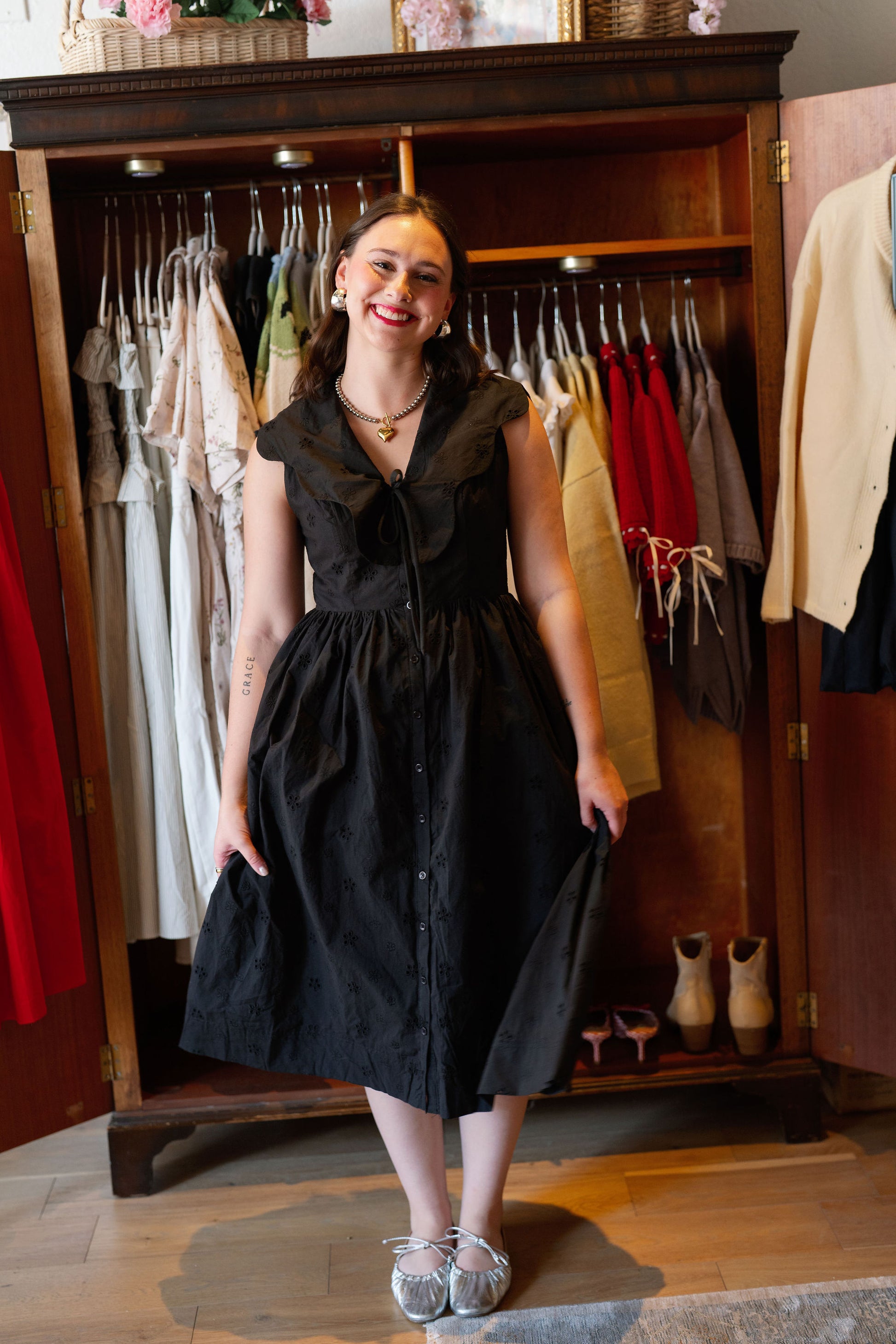 The Honor dress is a black, embroidered, sleeveless midi dress with a scalloped collar and tie. I love the beautiful simplicity of this one and how easy it is to throw on with a cardigan or sweater. If in between sizes, size up!