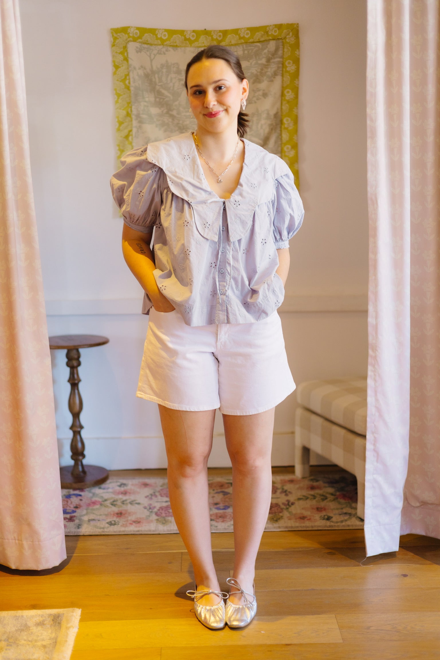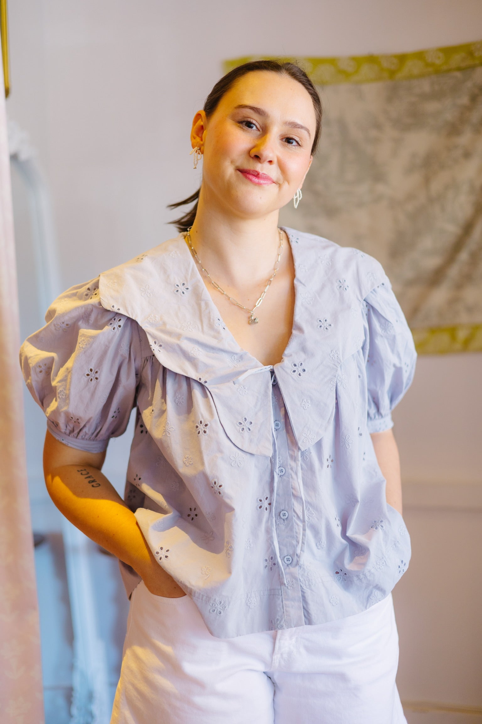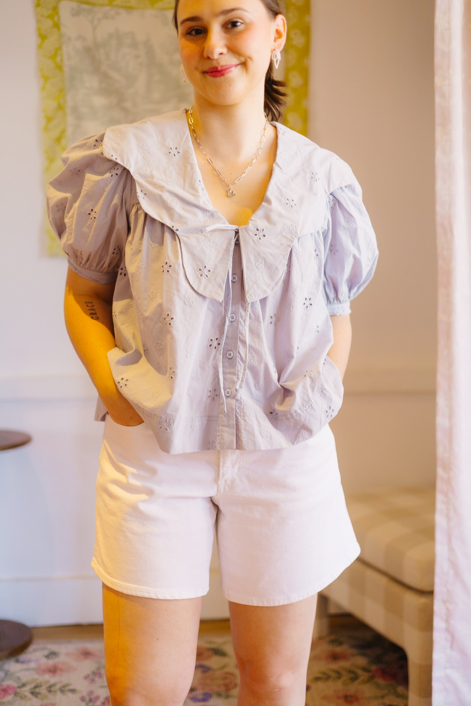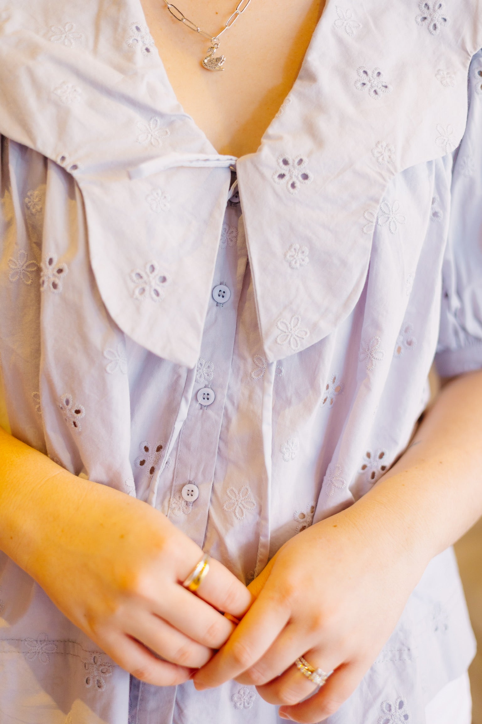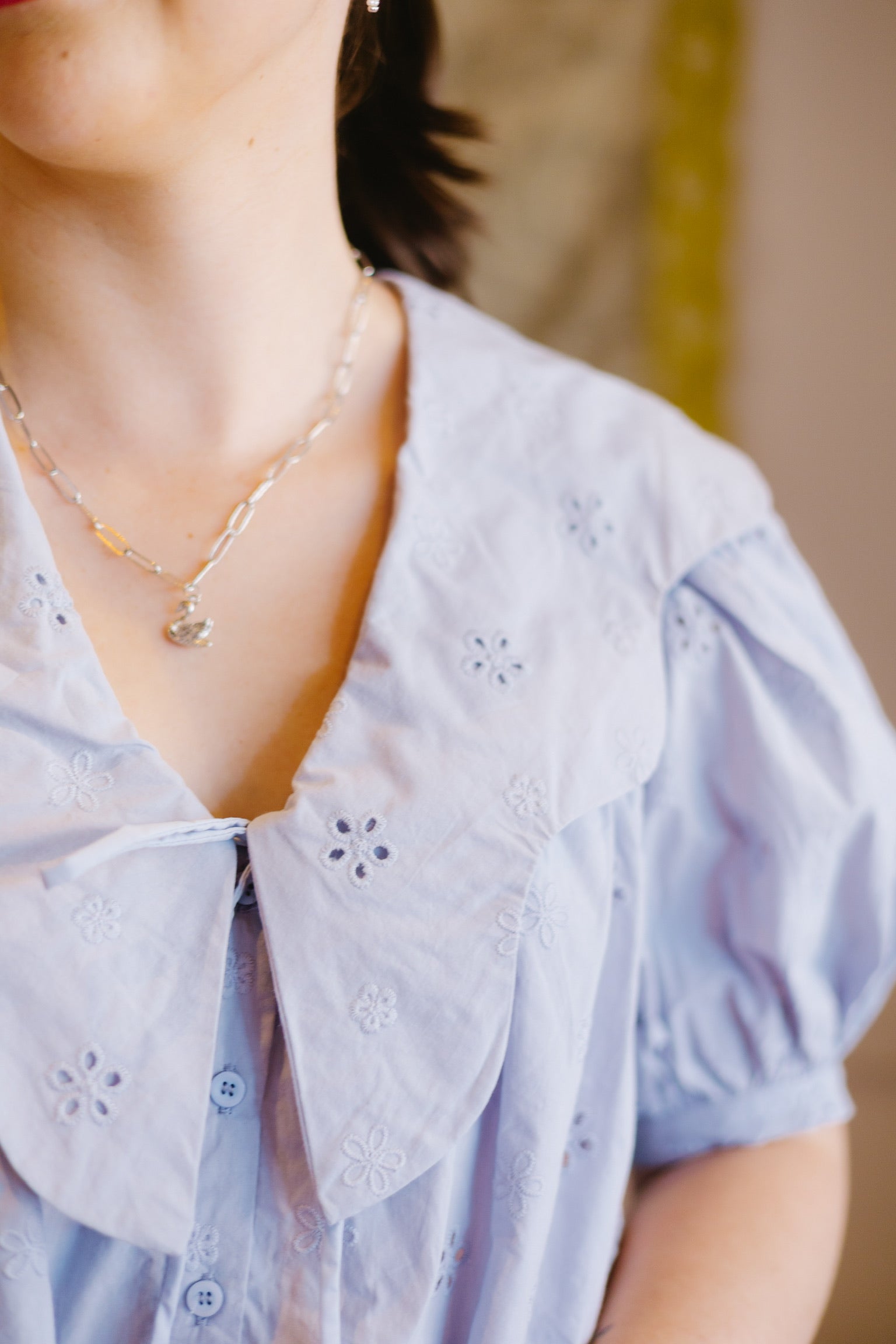 Total sweetness from this top! A soft blue that is perfect as we transition to fall! Flowy bodice, collar with a tie, and short puff sleeves make the Dulcia top the cutest little top!