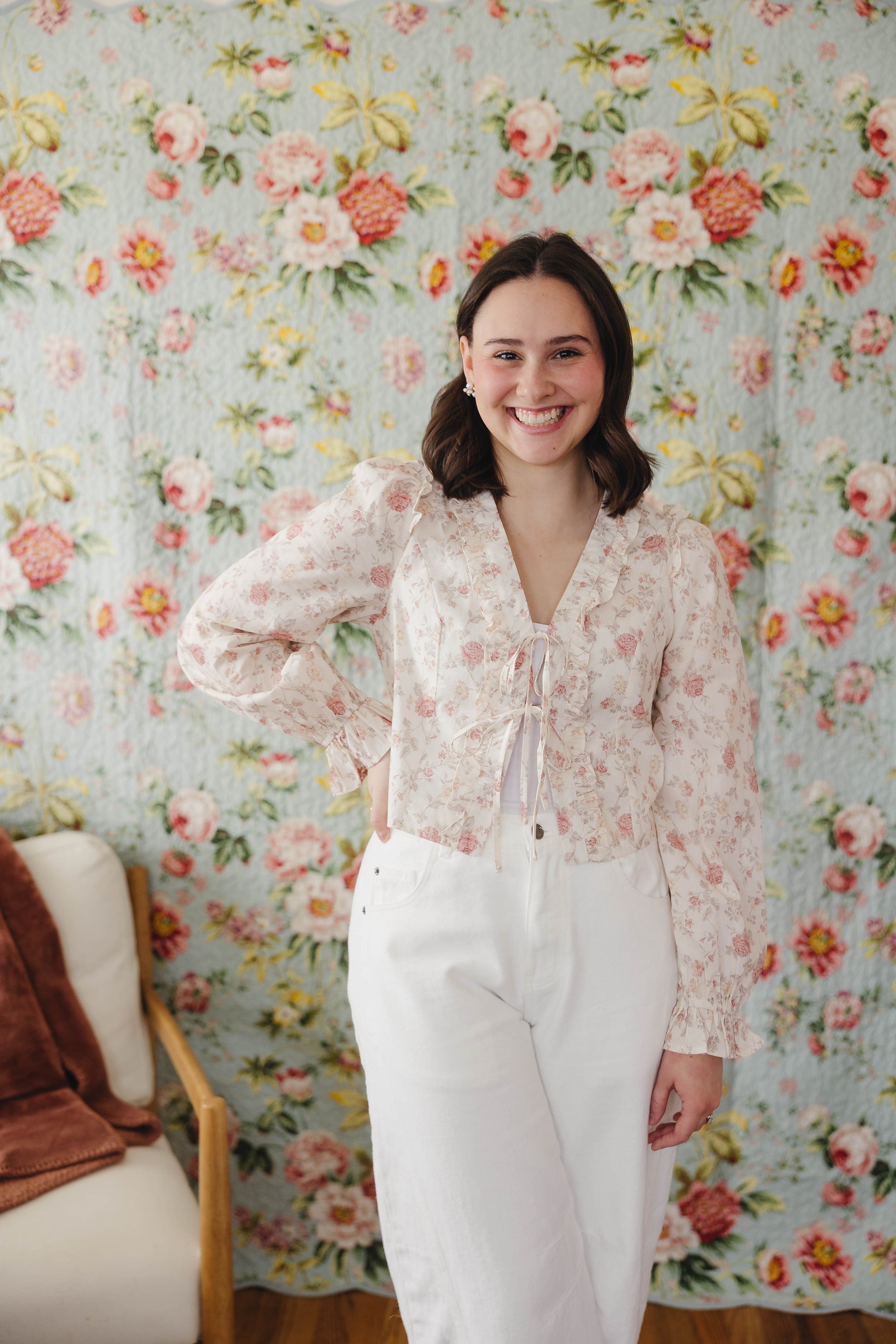 The Rhoda top is a cream and mauve tie top with long sleeves. This top is lightweight and perfect for transitioning into the spring. Fit is true to size.