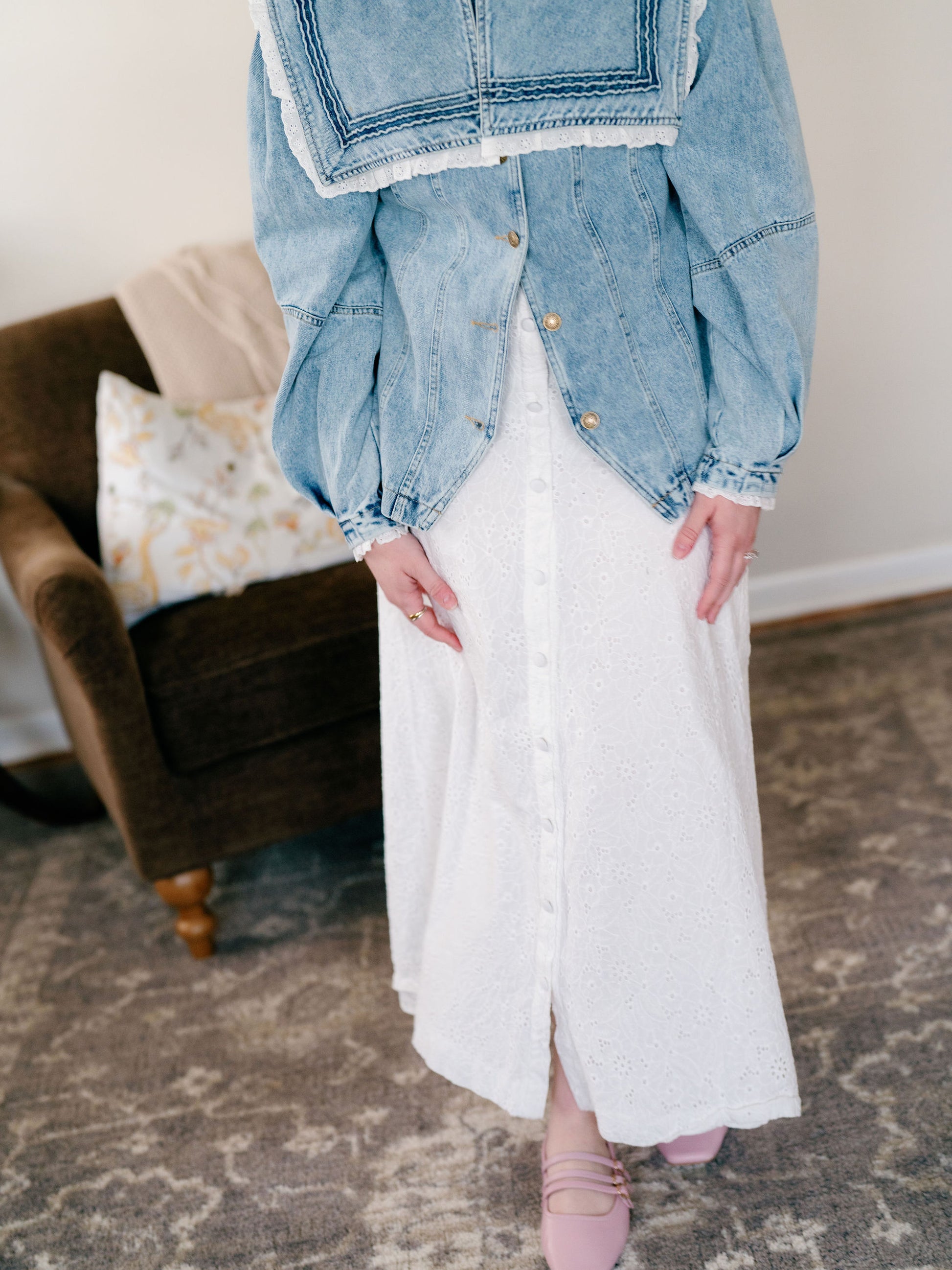 The Phoebe denim jacket is such a versatile piece with the perfect touch of femininity. I absolutely love the collar and sleeve details on this one. The Phoebe can be worn as a top or as a jacket thrown over a dress, sweater or top. Fit is true to size or slightly oversized especially around the arms!