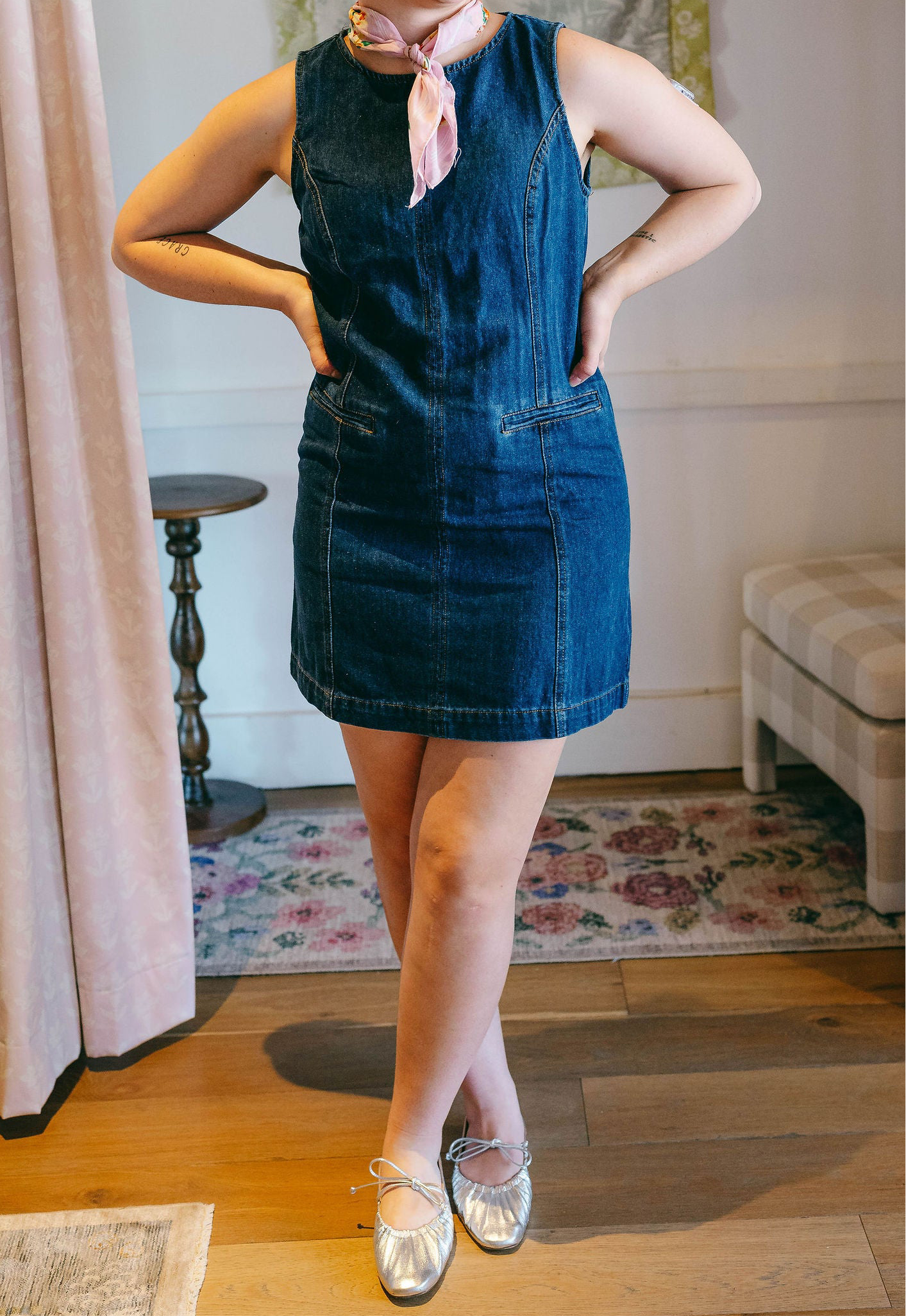 The Elizabeth dress is a high neck, denim mini dress with a zipper back. The fit of this one is so fun & I love imagining all the ways to style! So cute with a ballet flat but would be adorable with riding boots and a sweater in the fall! Fit is on the smaller size! I sized up to give me a more comfortable fit!