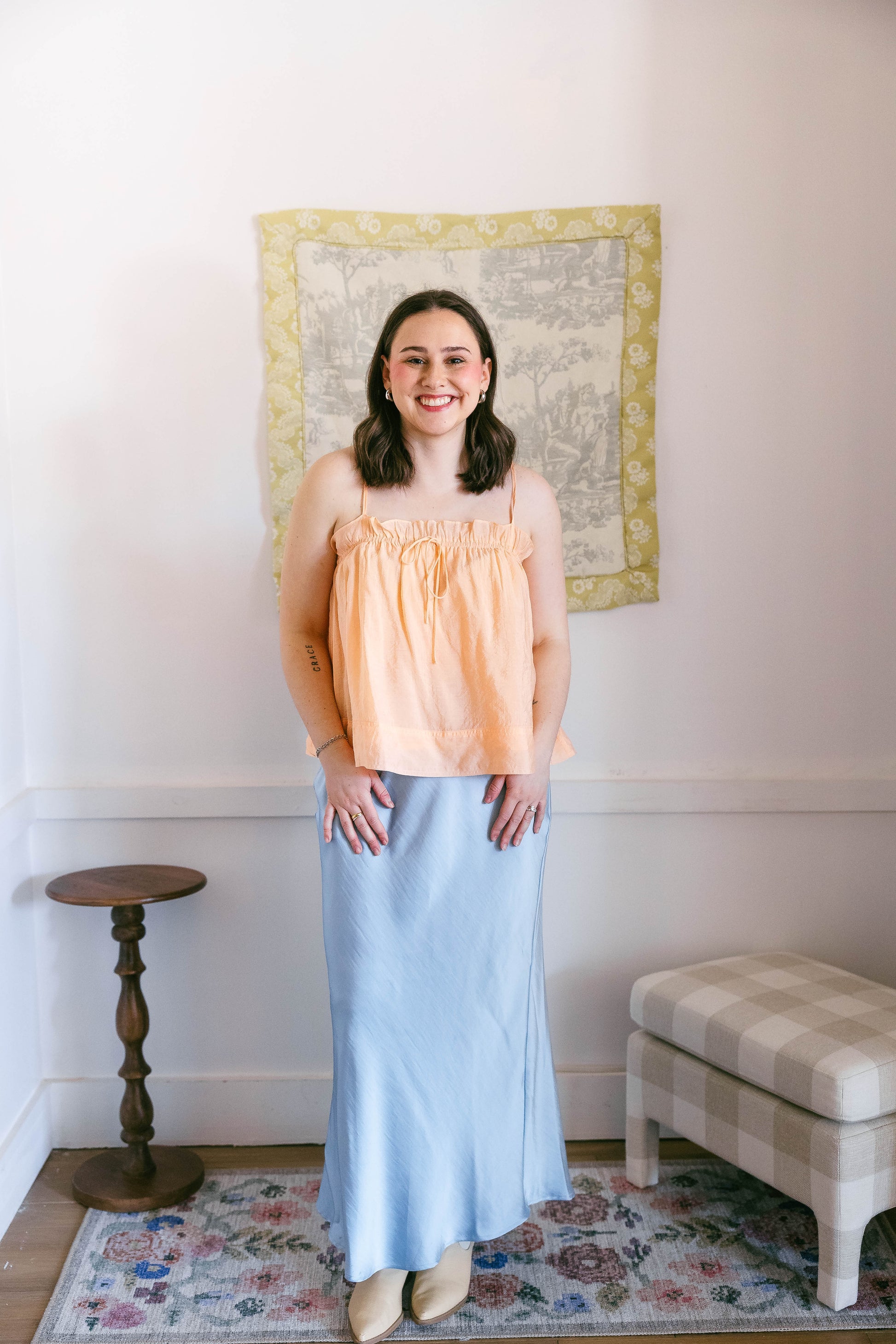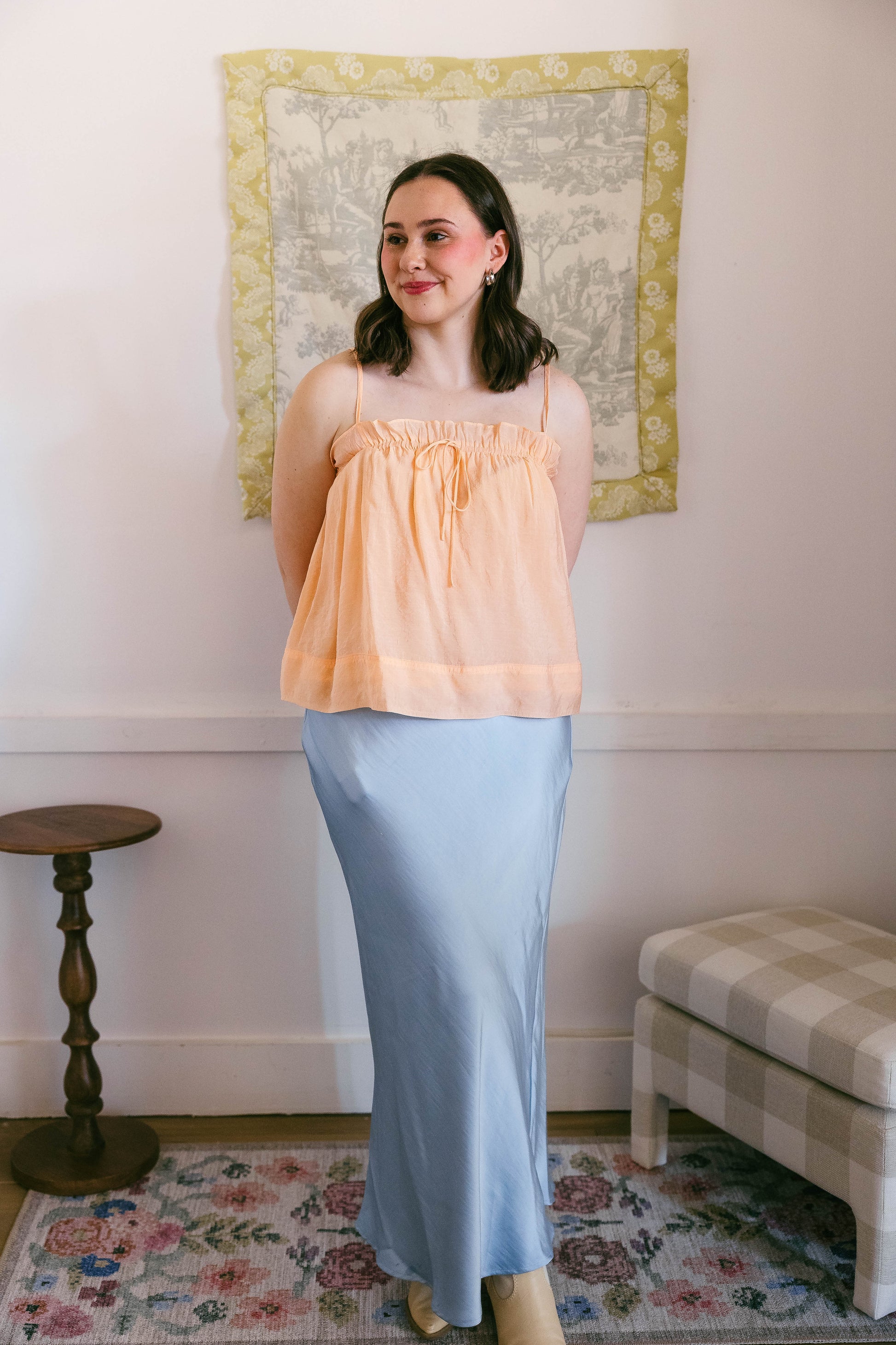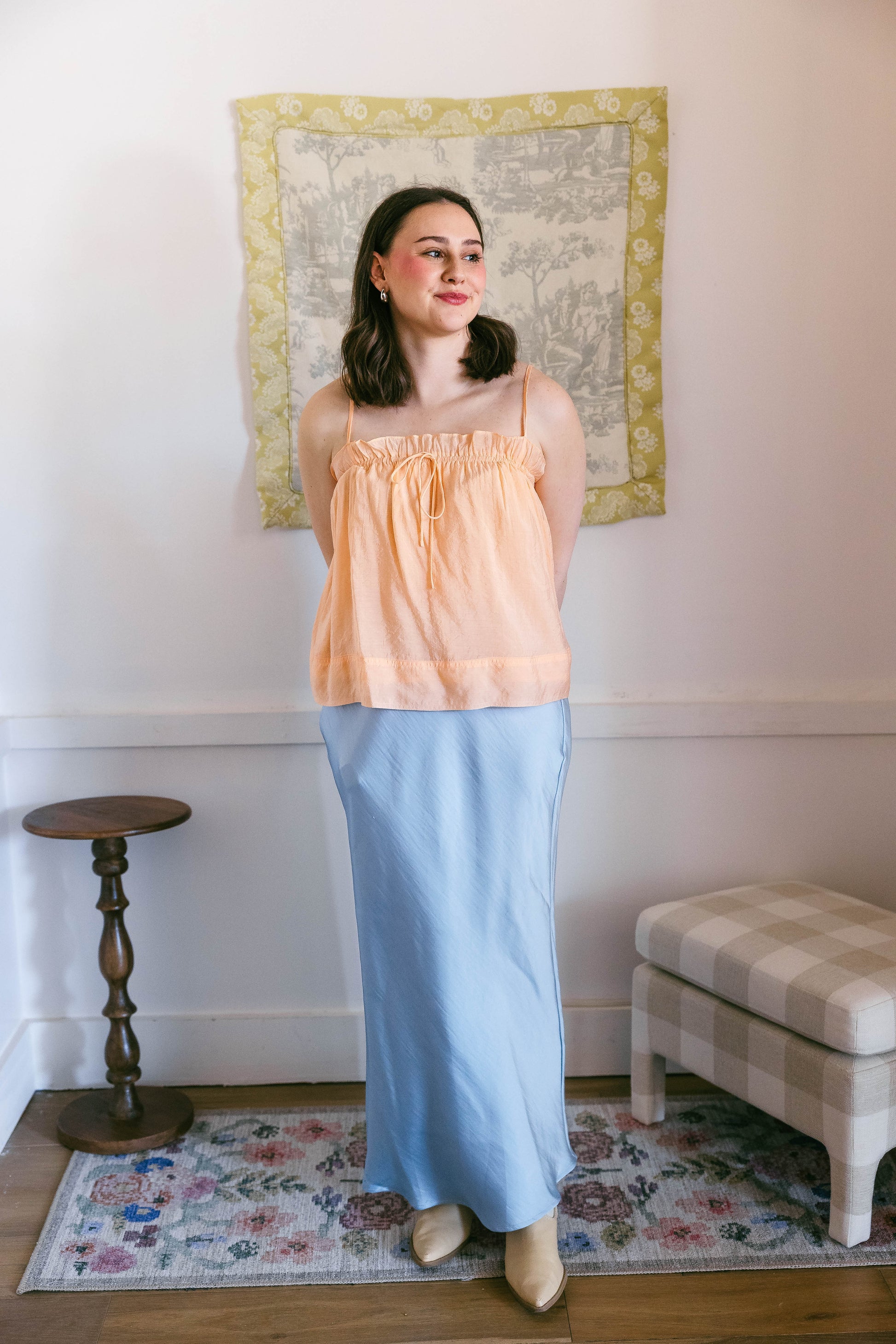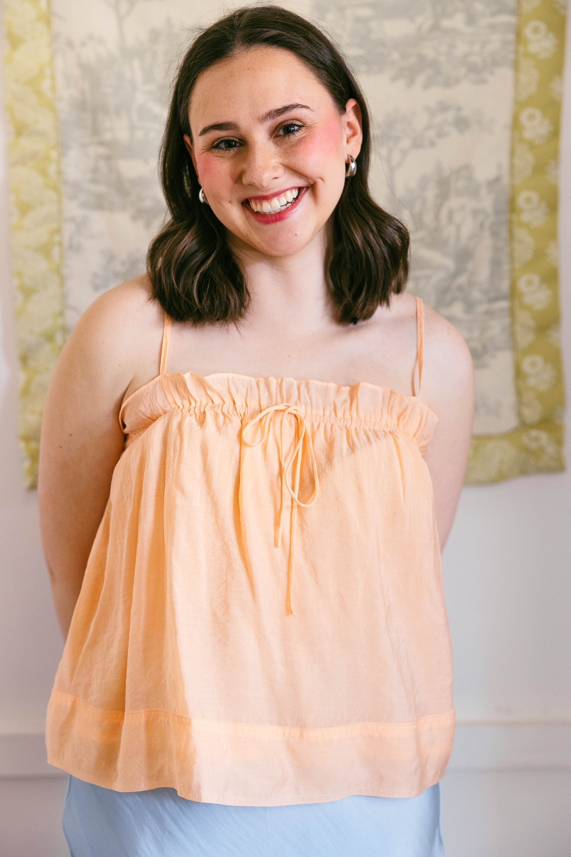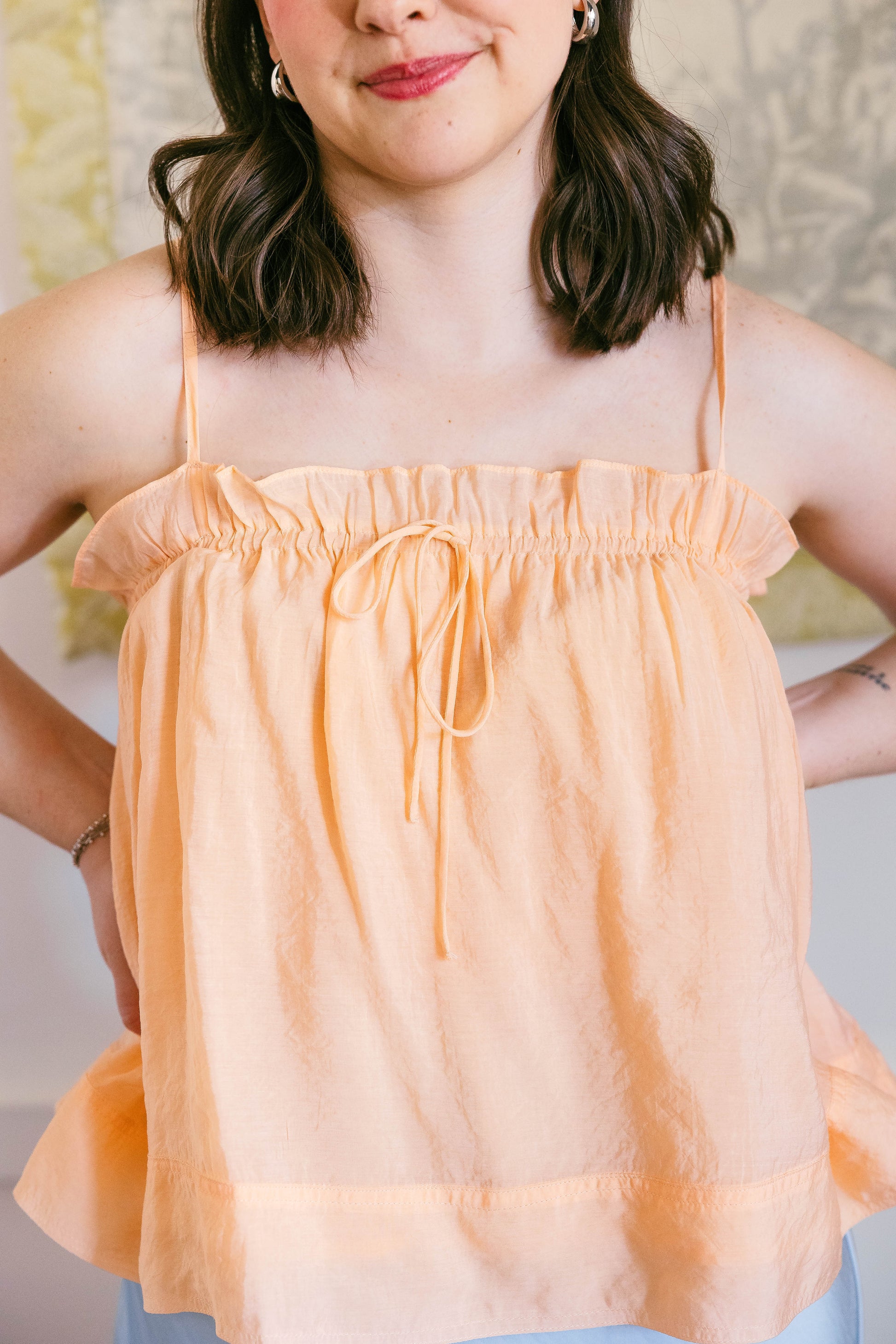 The Trix top is an orange, spaghetti strap, flow top. Towards the bust is an elastic band that allows for a stretchy fit with adjustable straps. Fit is true to size.