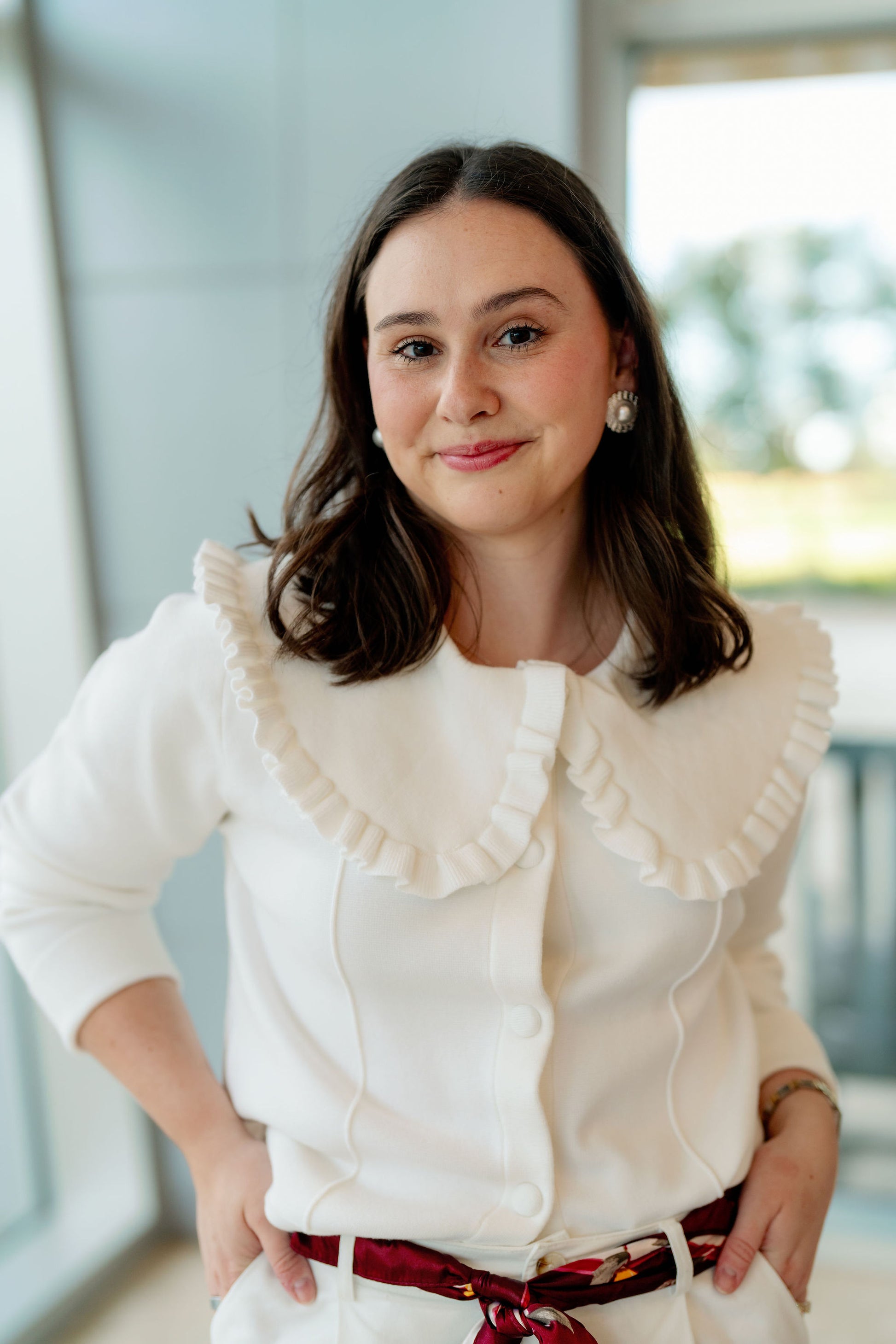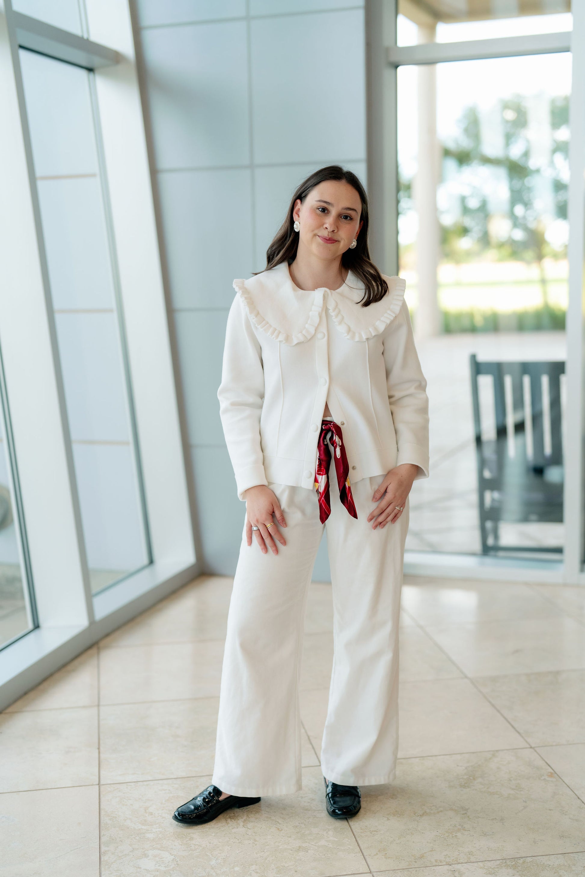 The Kameela cardigan is an unbelievably soft, white, peter pan cardigan that you can wear open or closed. I love that this one is such a classic look with a little unique flare! Fit is true to size!