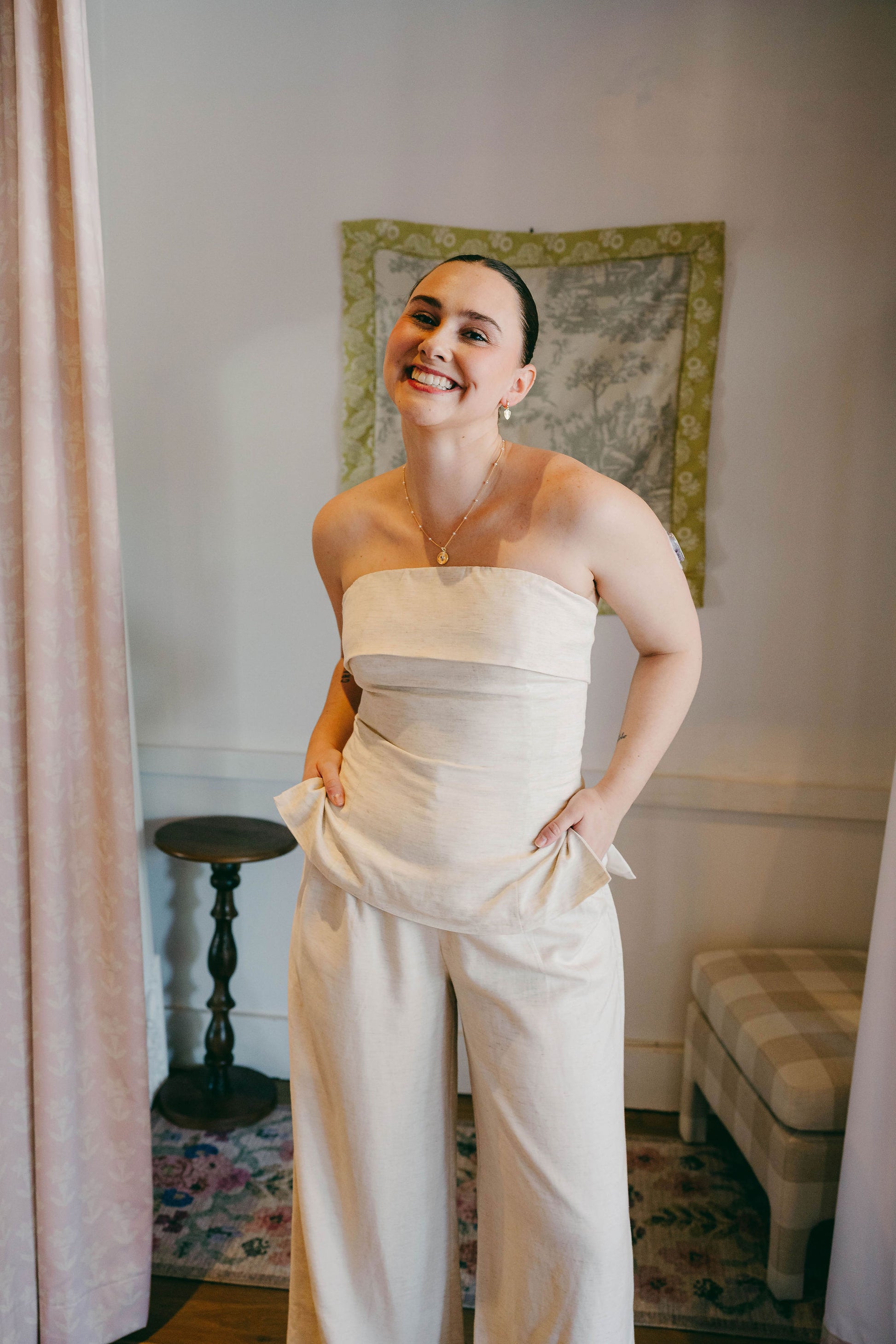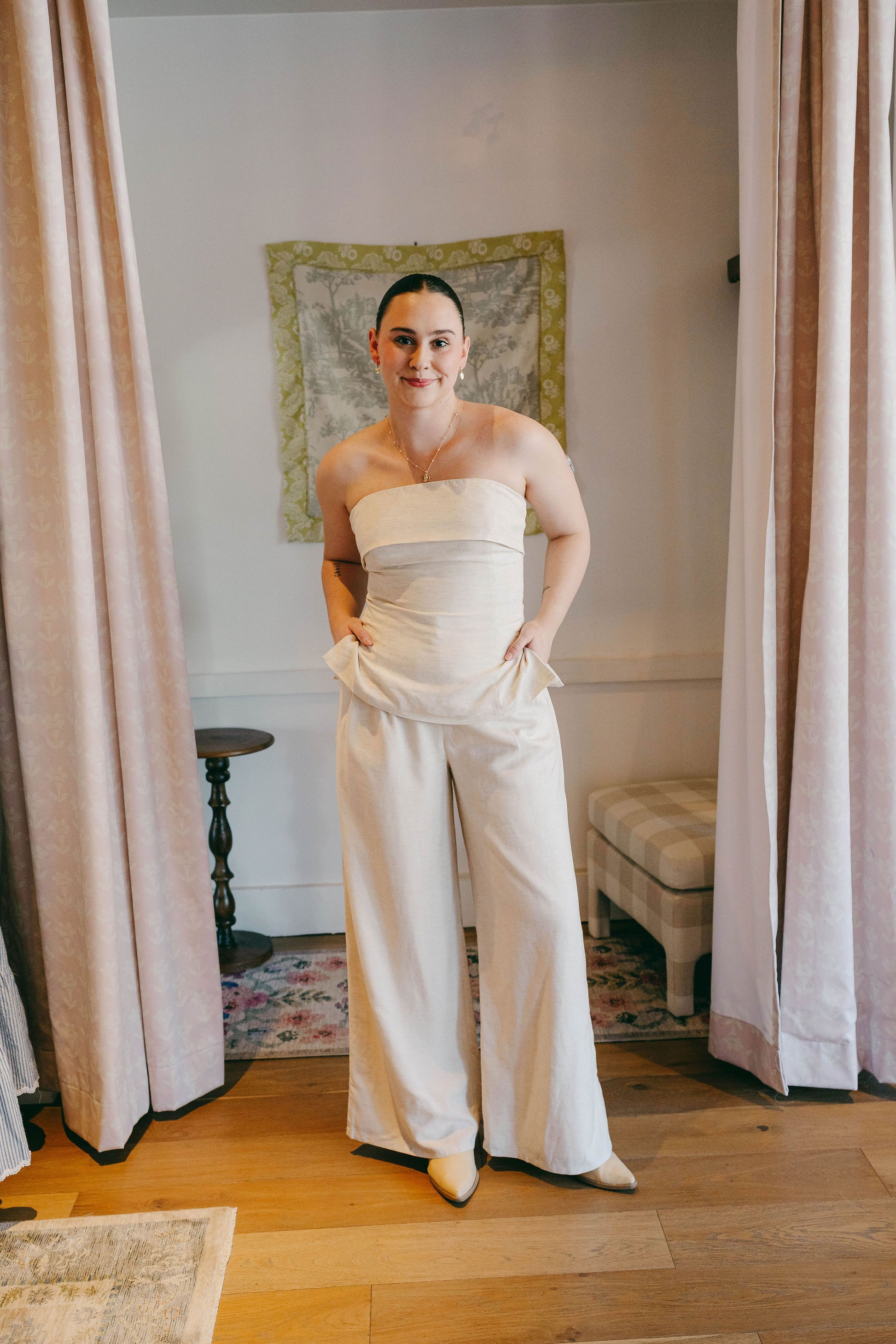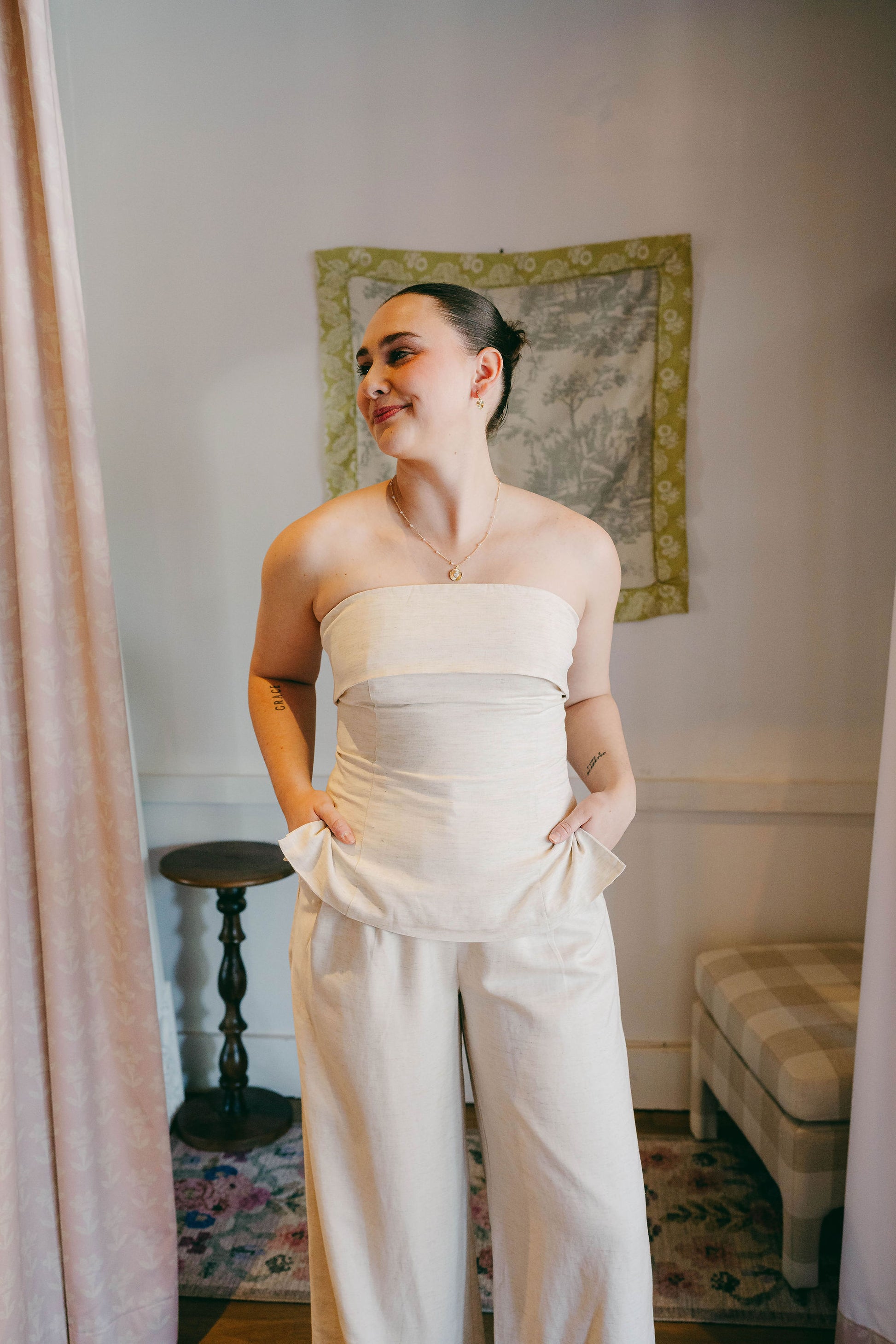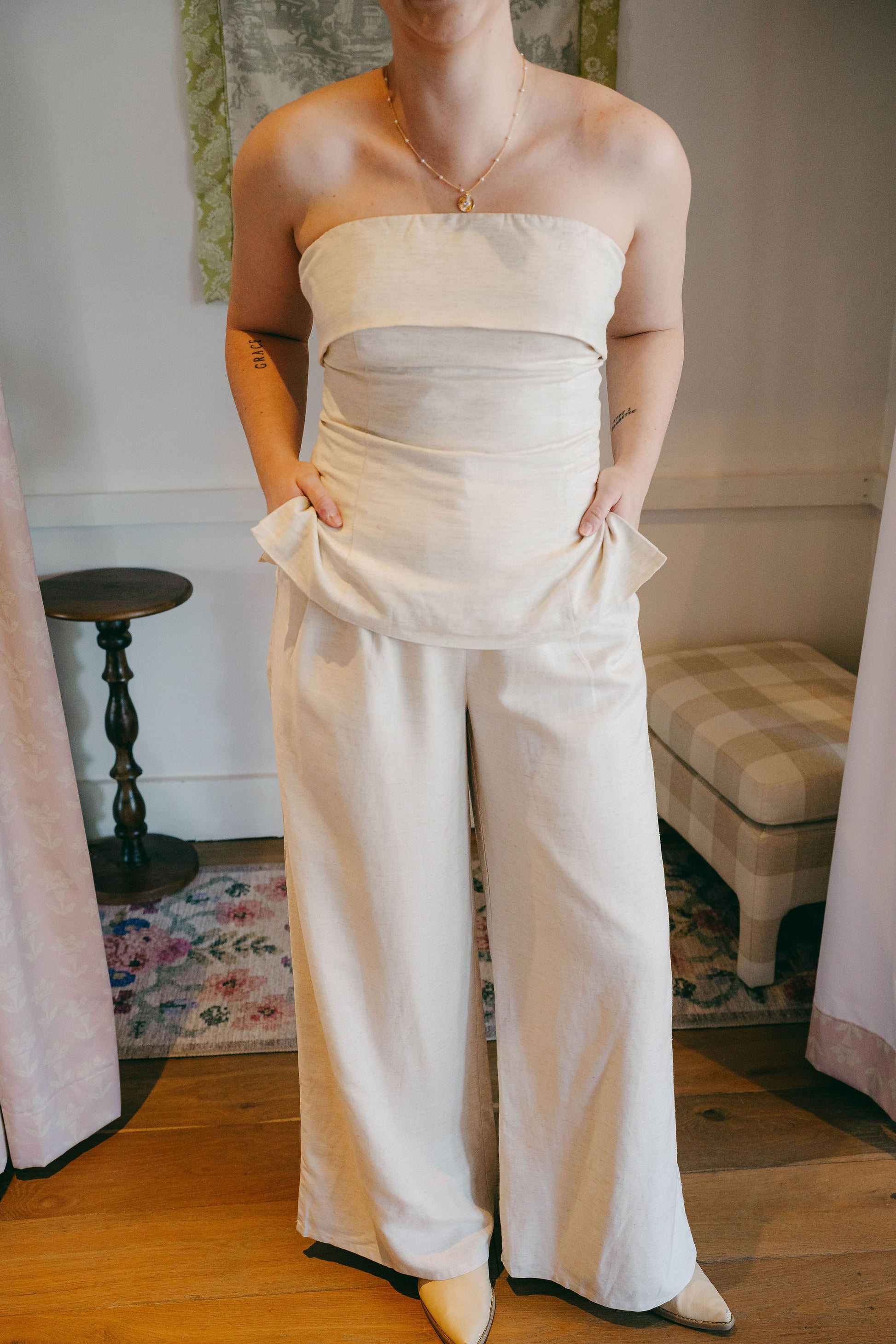 The Juniper set is a beige strapless pant set that I am absolutely obsessed with! The top has a zipper back with small slits on the sides and the pants have the most flattering & comfortable wide leg fit. Would be so cute for the beach or to throw on for work with a cardigan and ballet flats! I normally wear a small and sized up to a medium in this one!