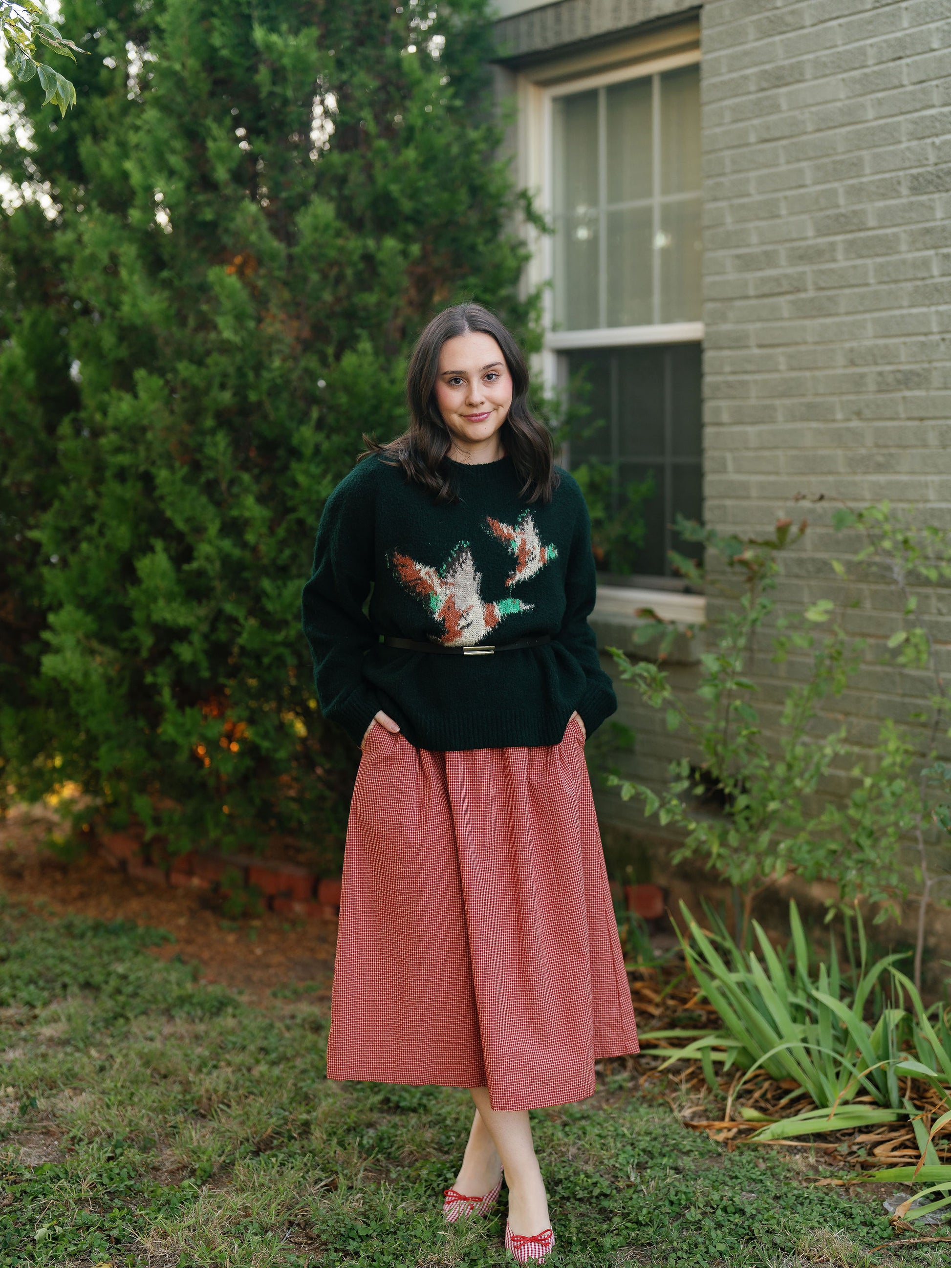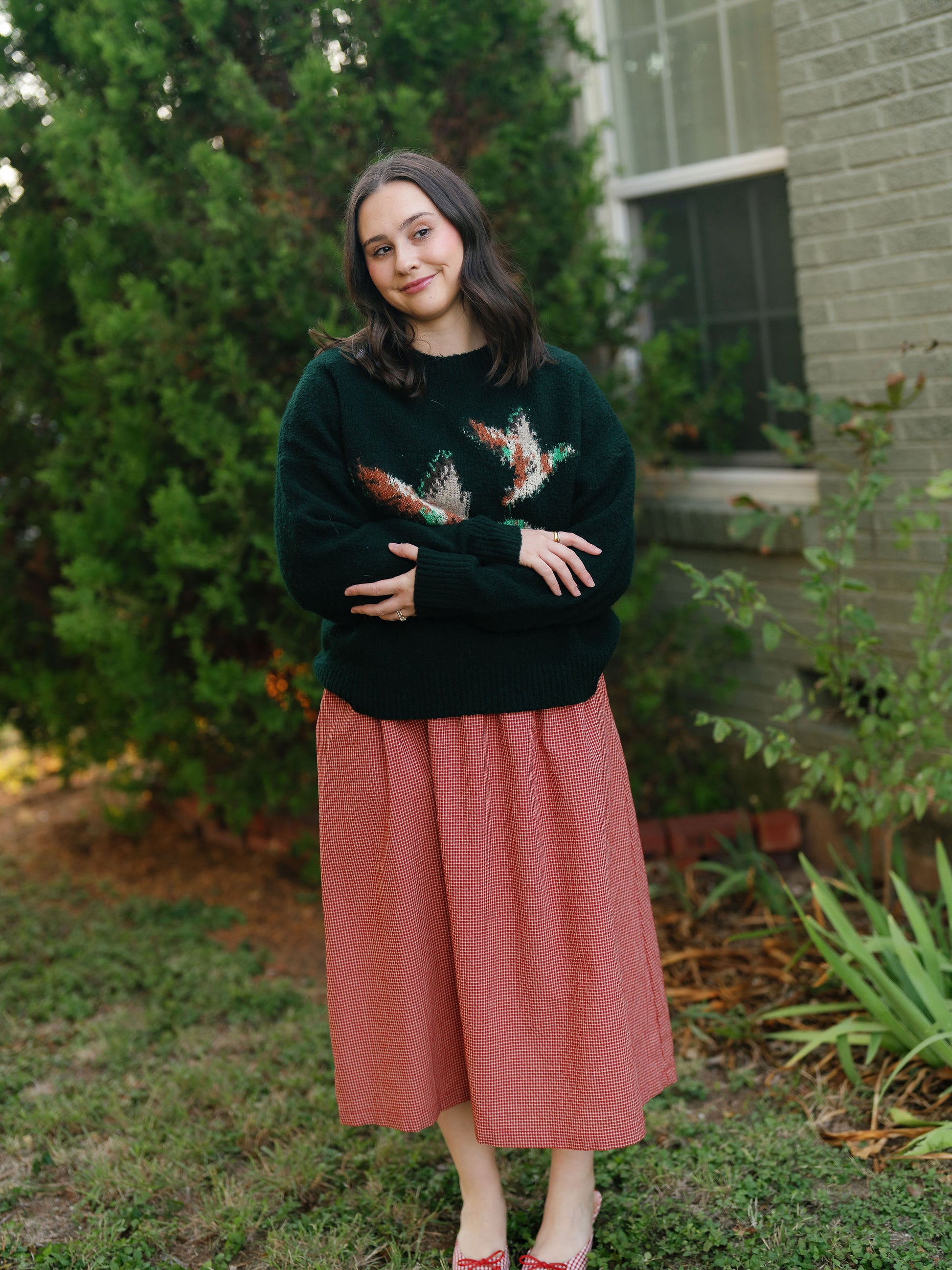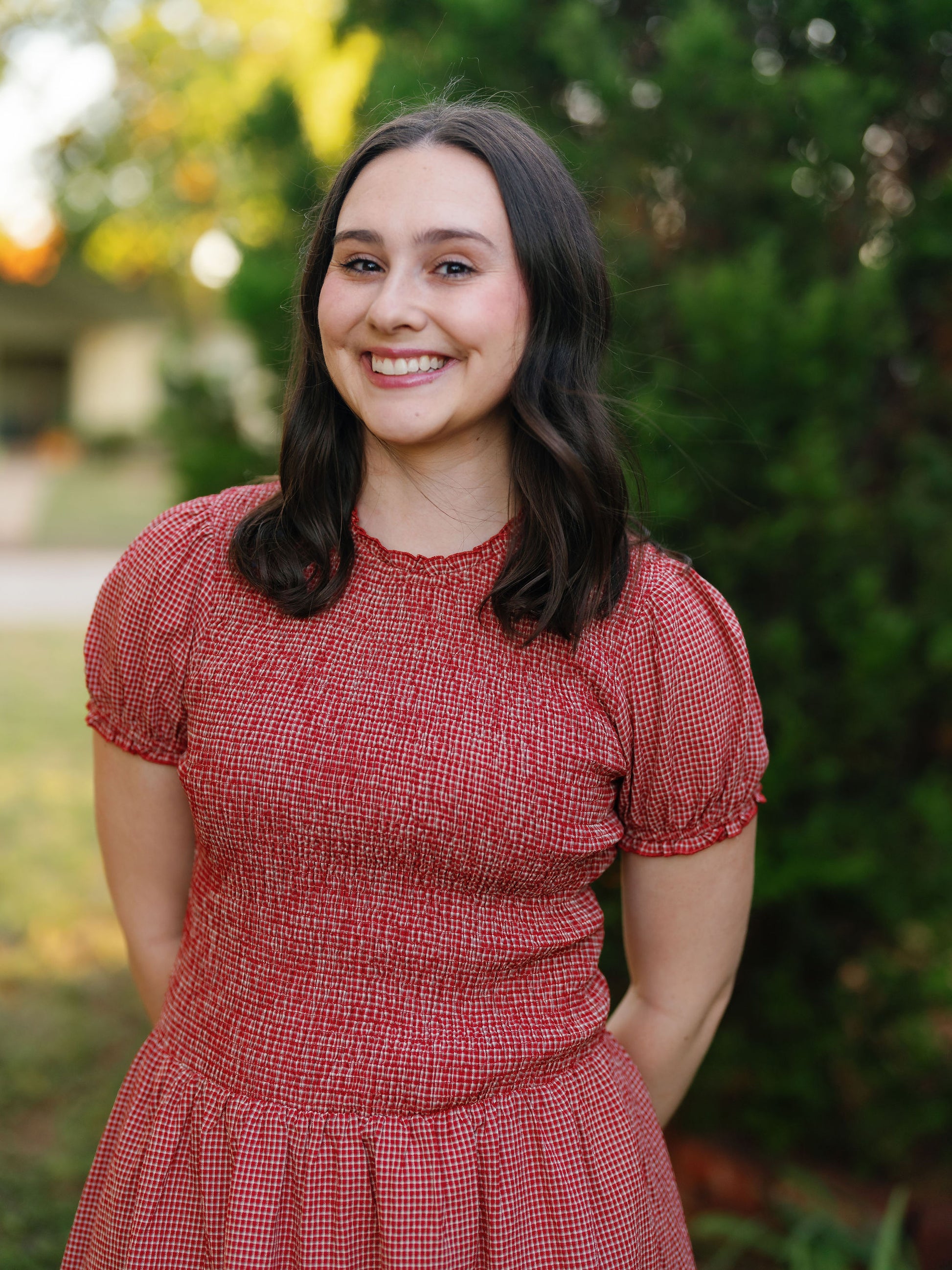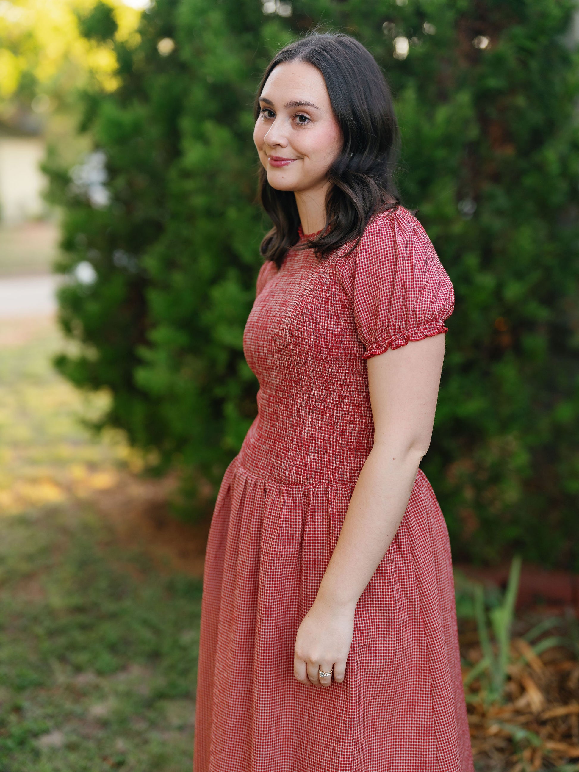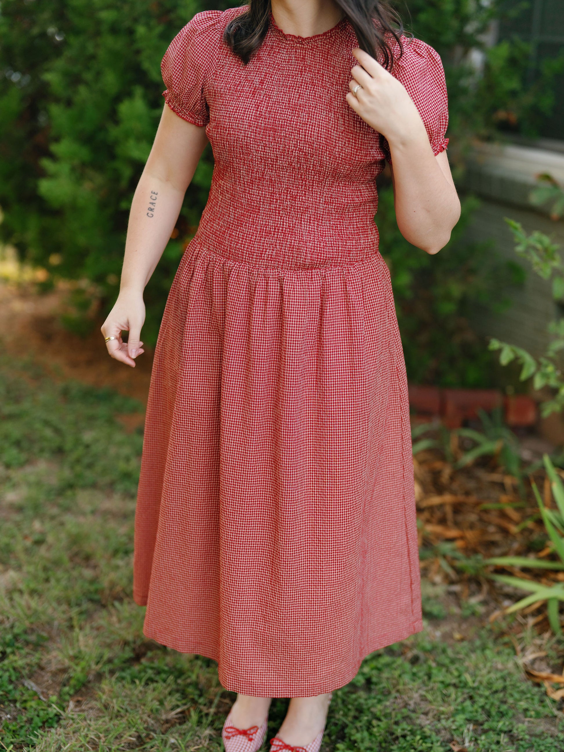 The Colette dress is a red gingham midi dress with puff sleeves and a smocked drop waist. Fit is slightly oversized so size down if in between!