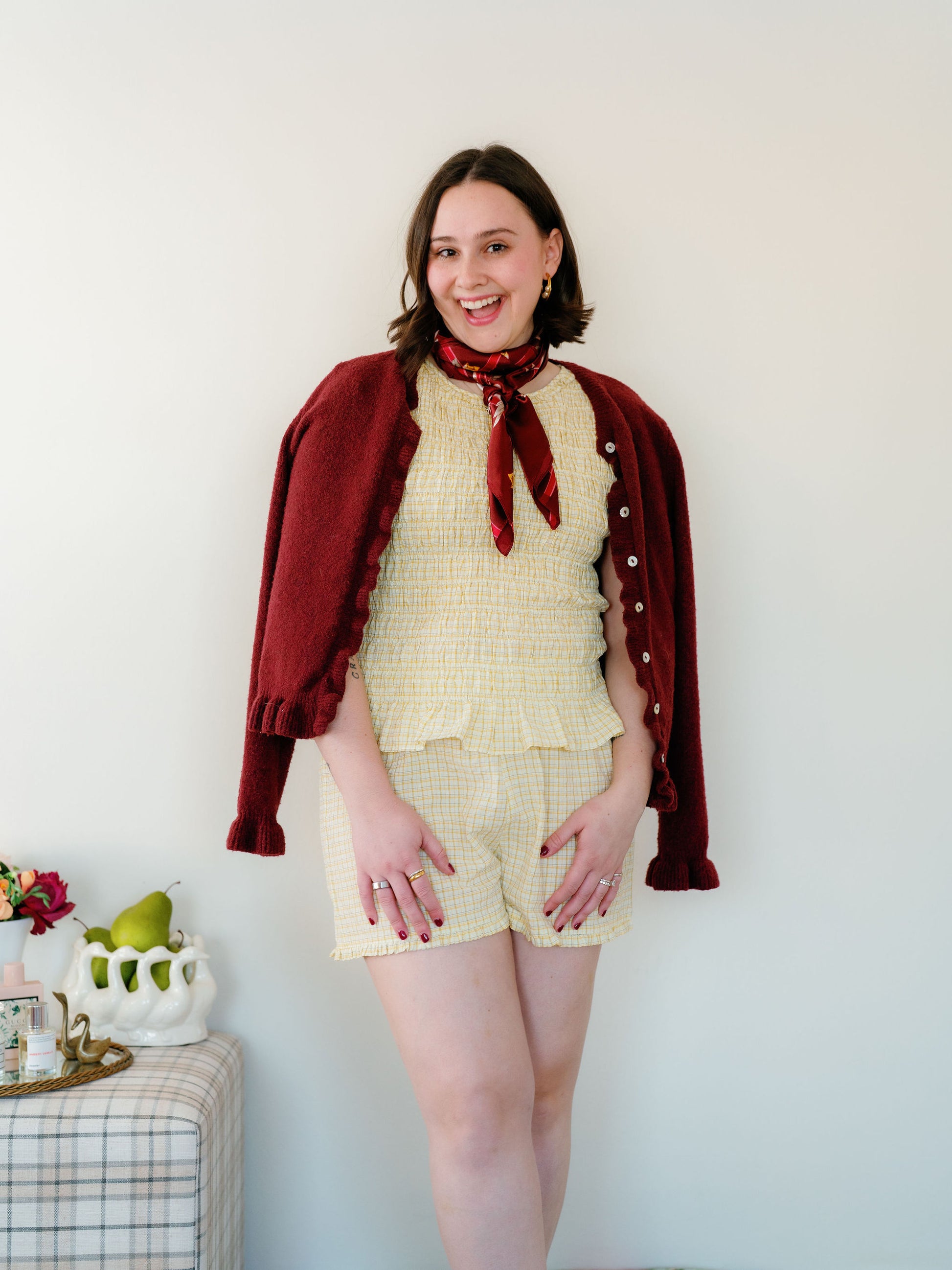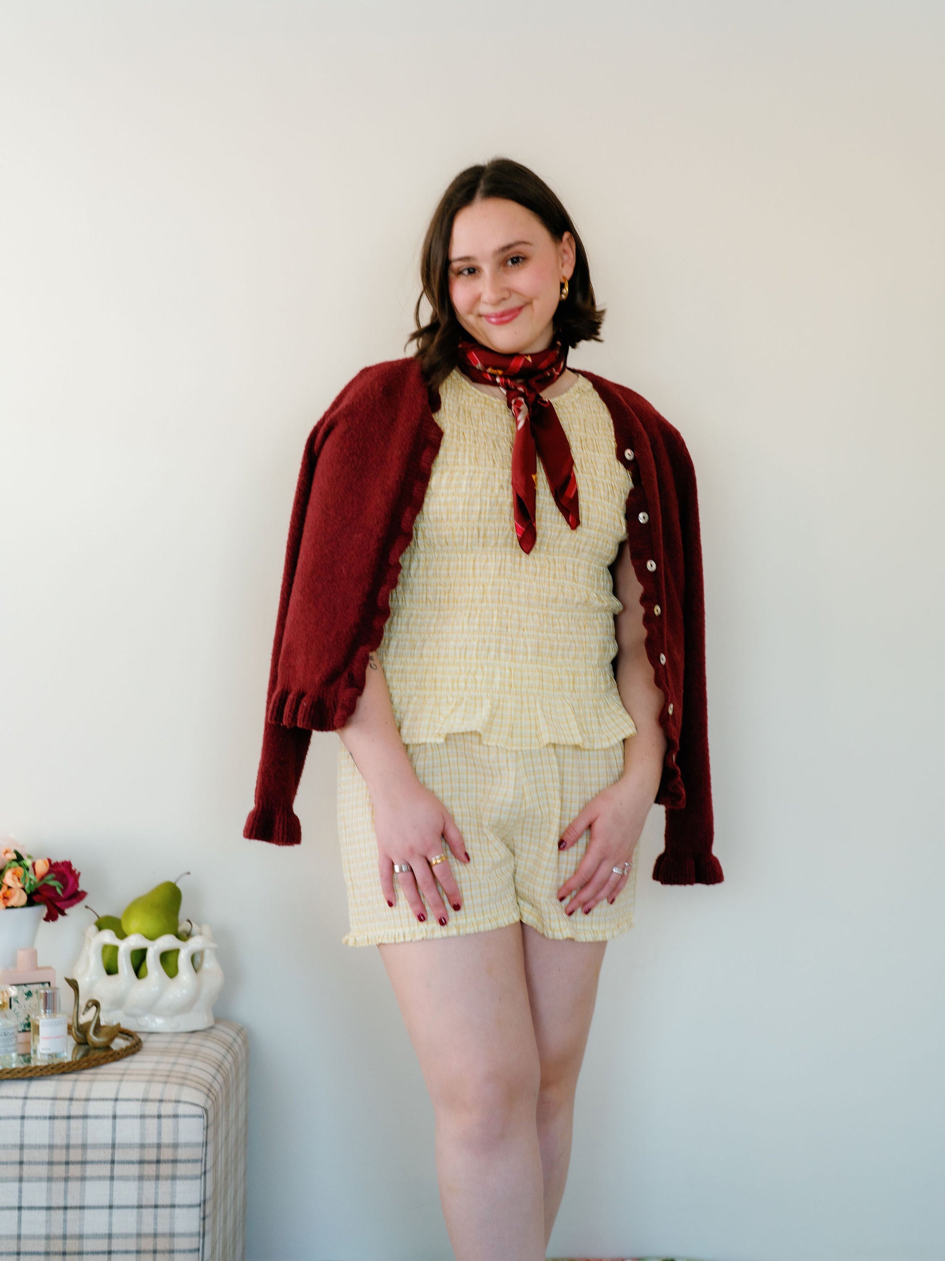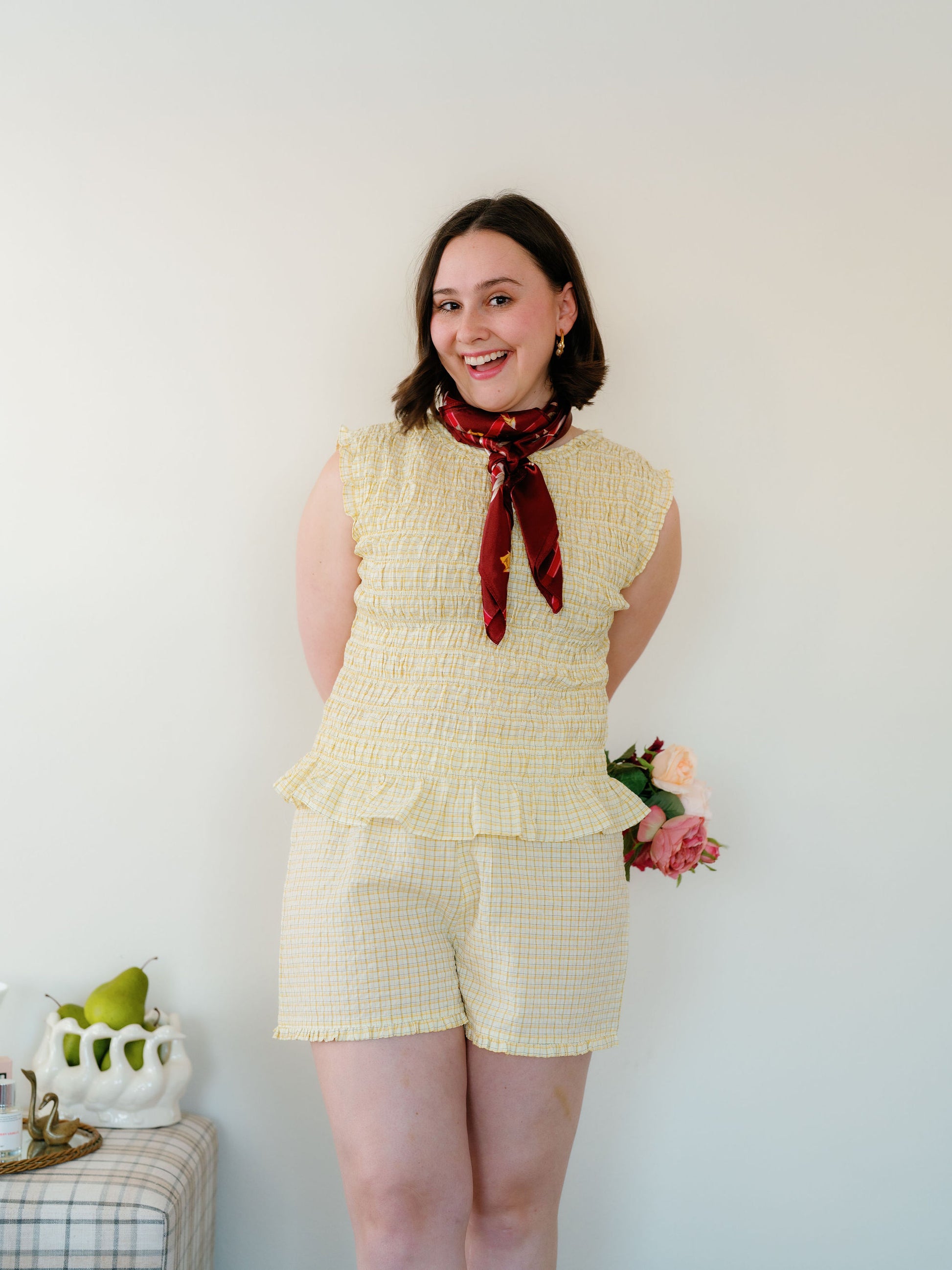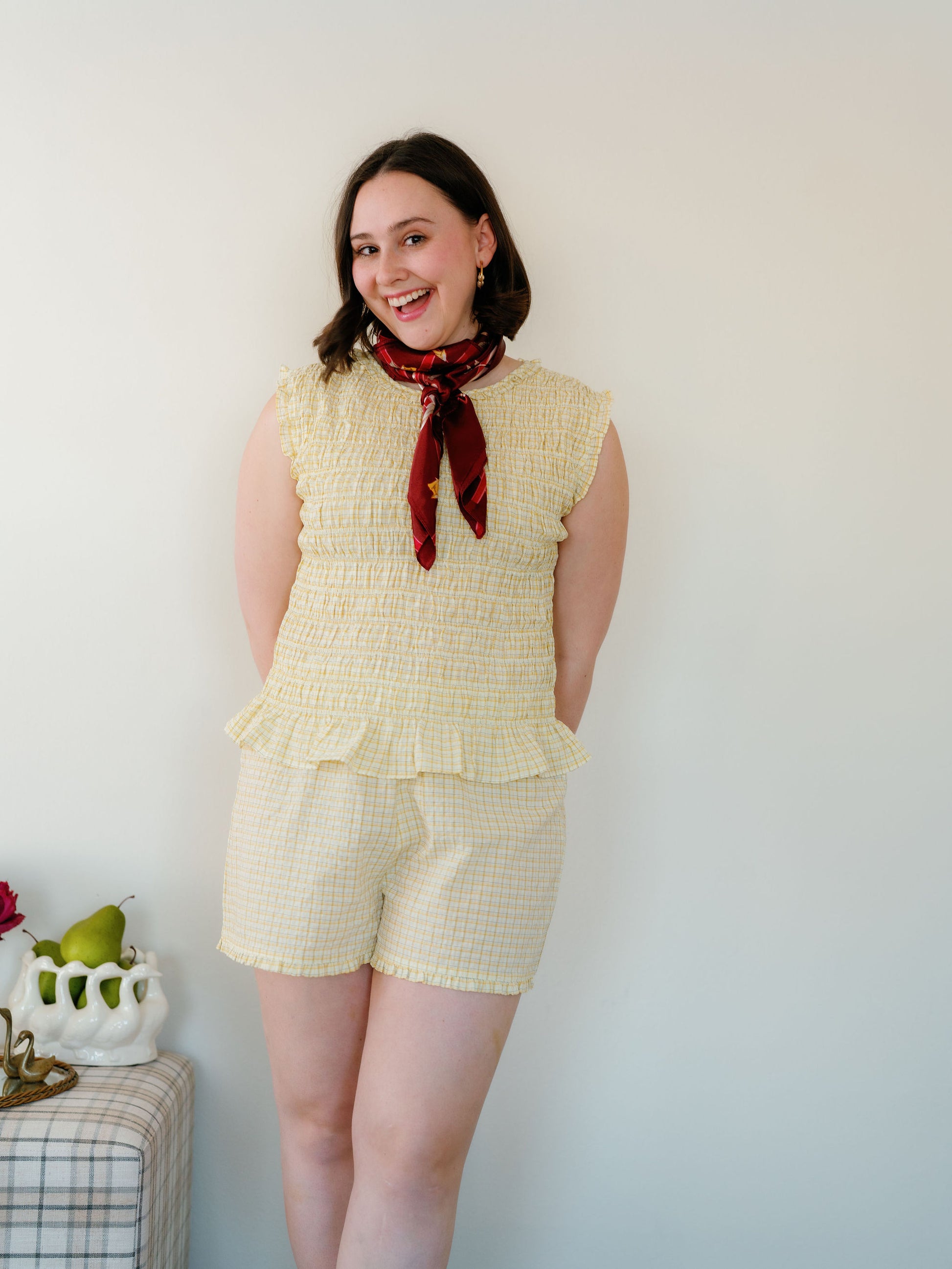 The Otis bottoms are elastic waist, boxer style shorts with the cutest ruffle hem. Love them paired with the Otis top and I would size up if you’re in between sizes!
