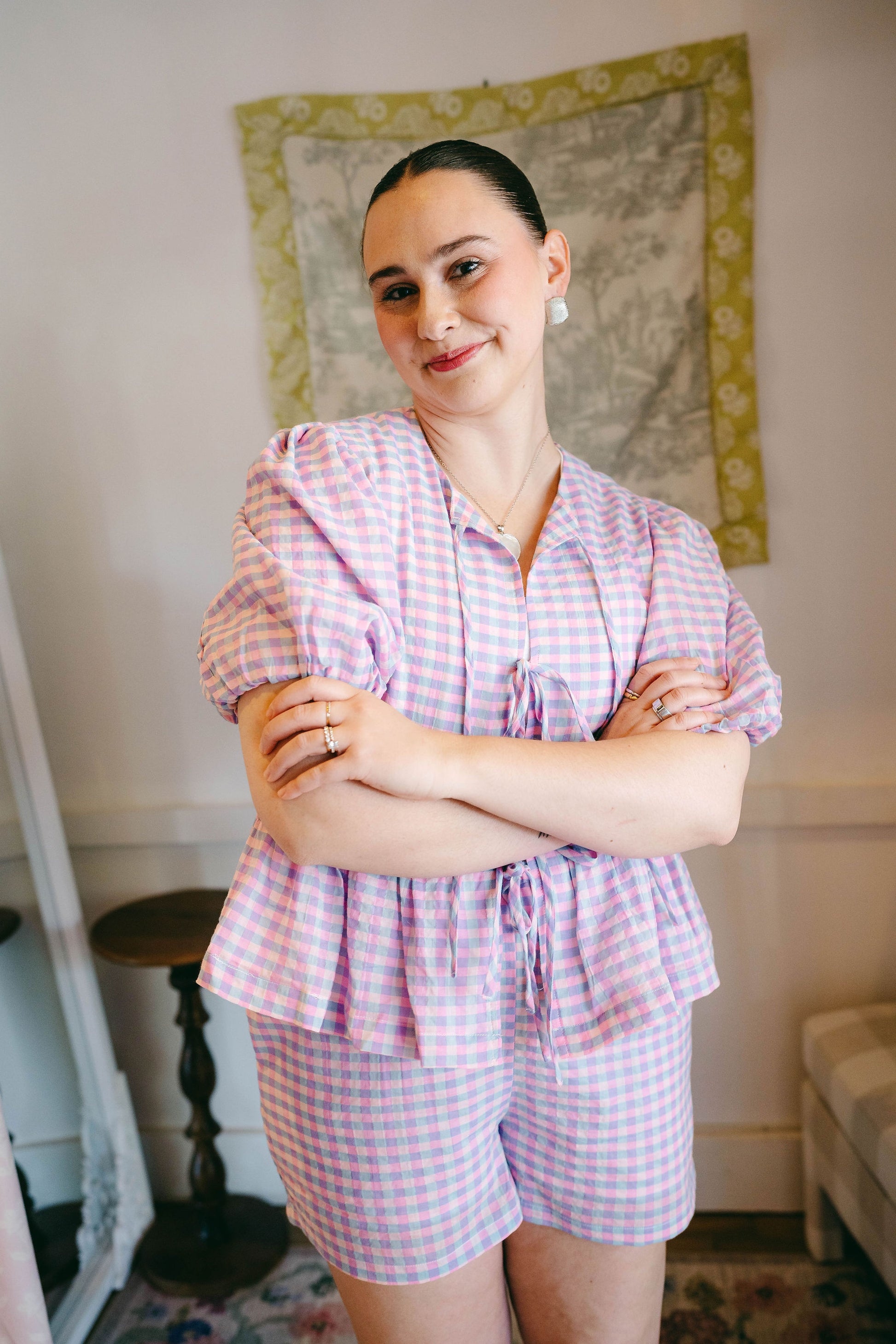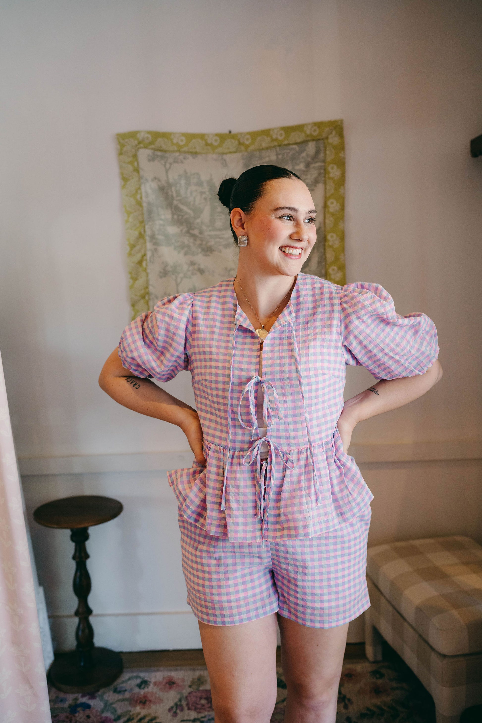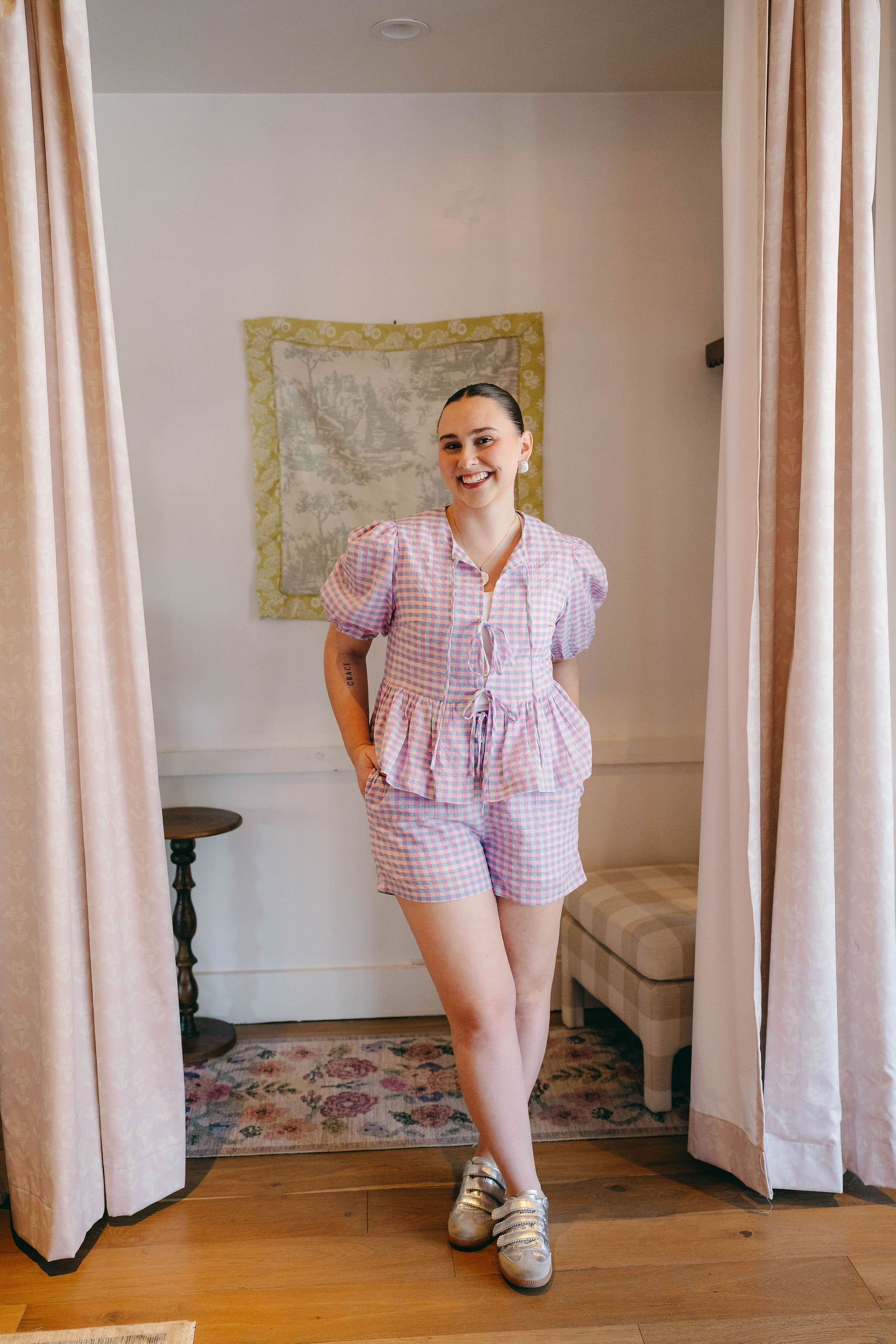 The Rhodes set is a blue and pink gingham set with puff sleeves and tie closure. Love how easy this one is to throw on in the summer & as a bonus you can wear the pieces separately -- automatically 3 outfits in one! Fit for this one is true to size!