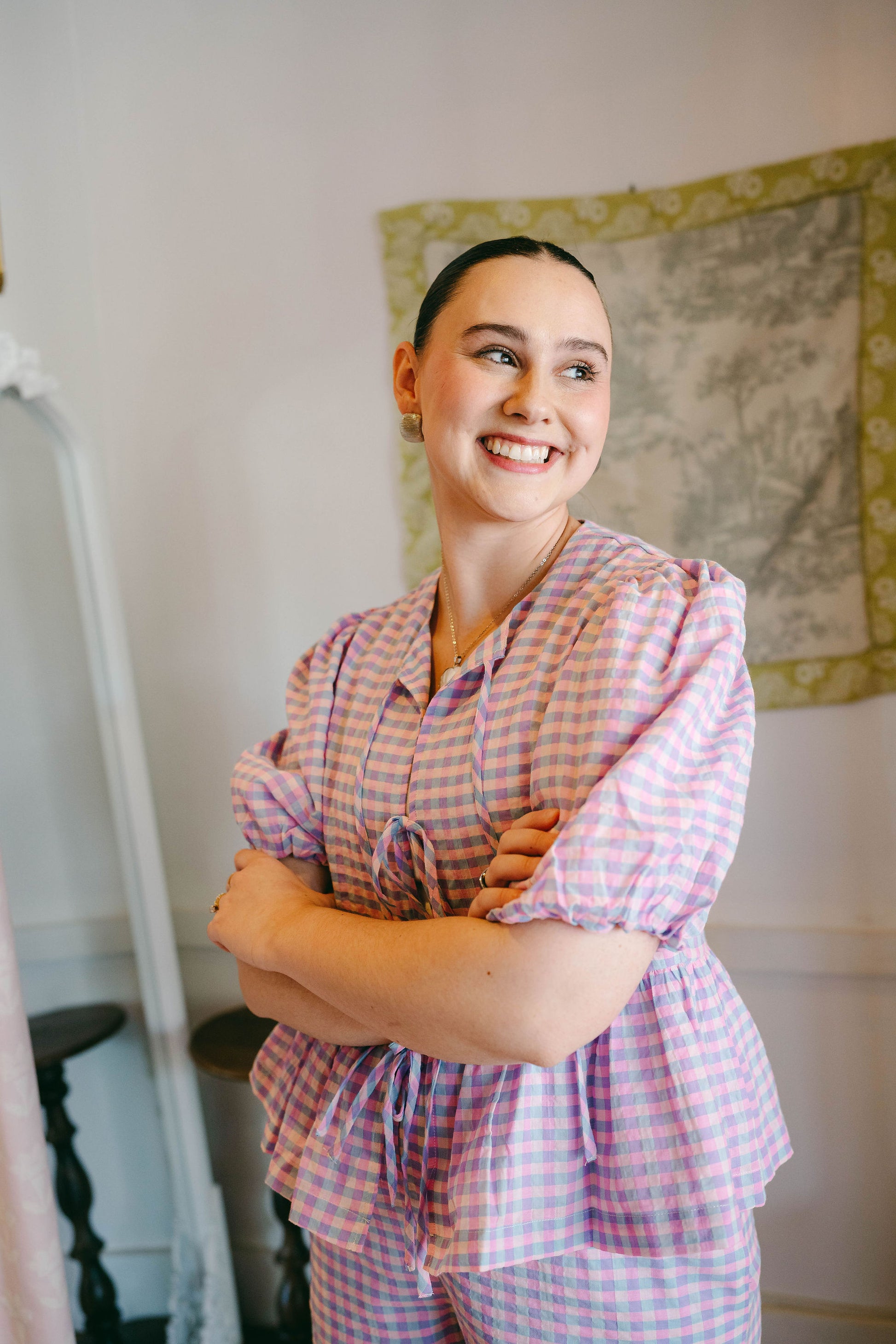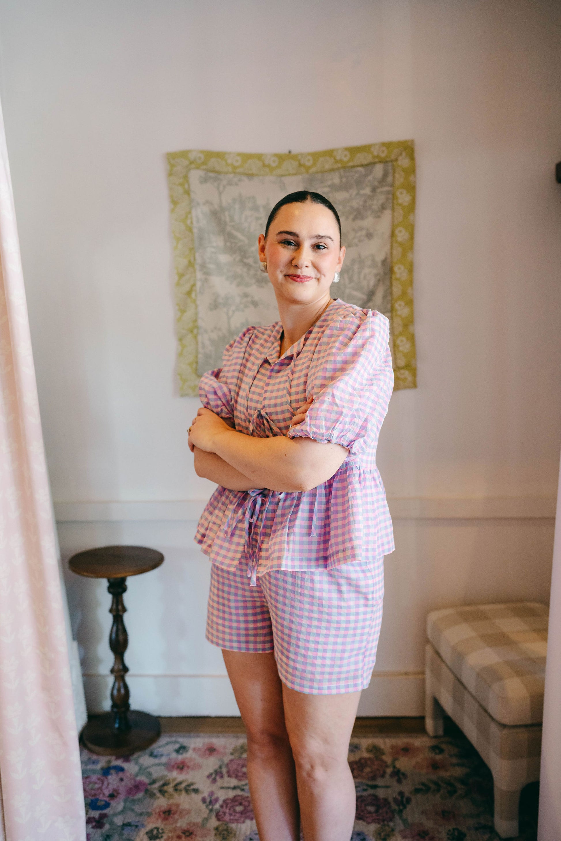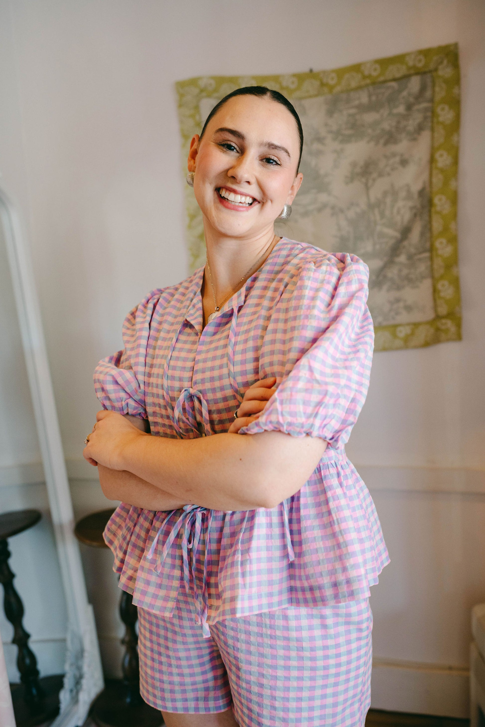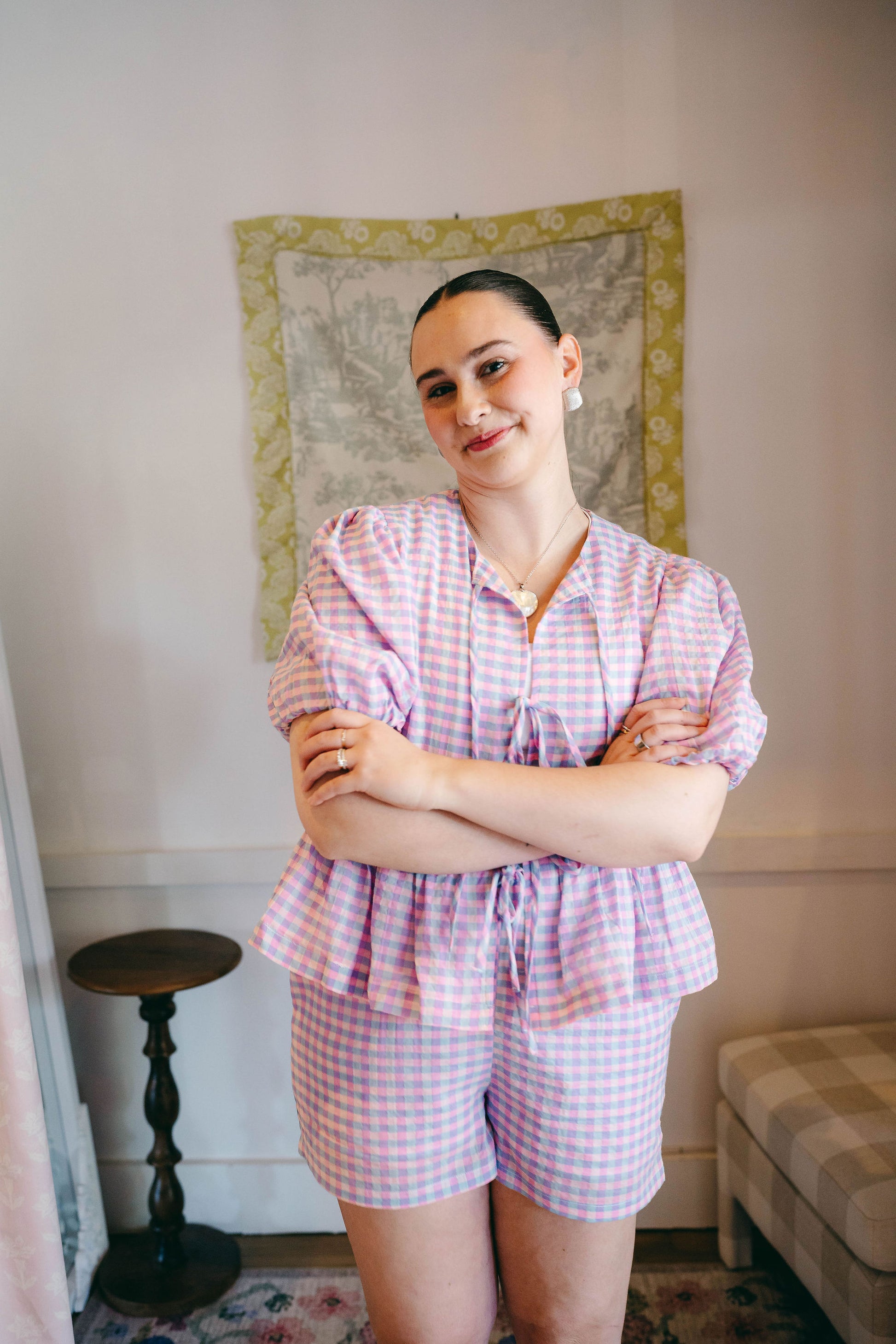 The Rhodes set is a blue and pink gingham set with puff sleeves and tie closure. Love how easy this one is to throw on in the summer & as a bonus you can wear the pieces separately -- automatically 3 outfits in one! Fit for this one is true to size!