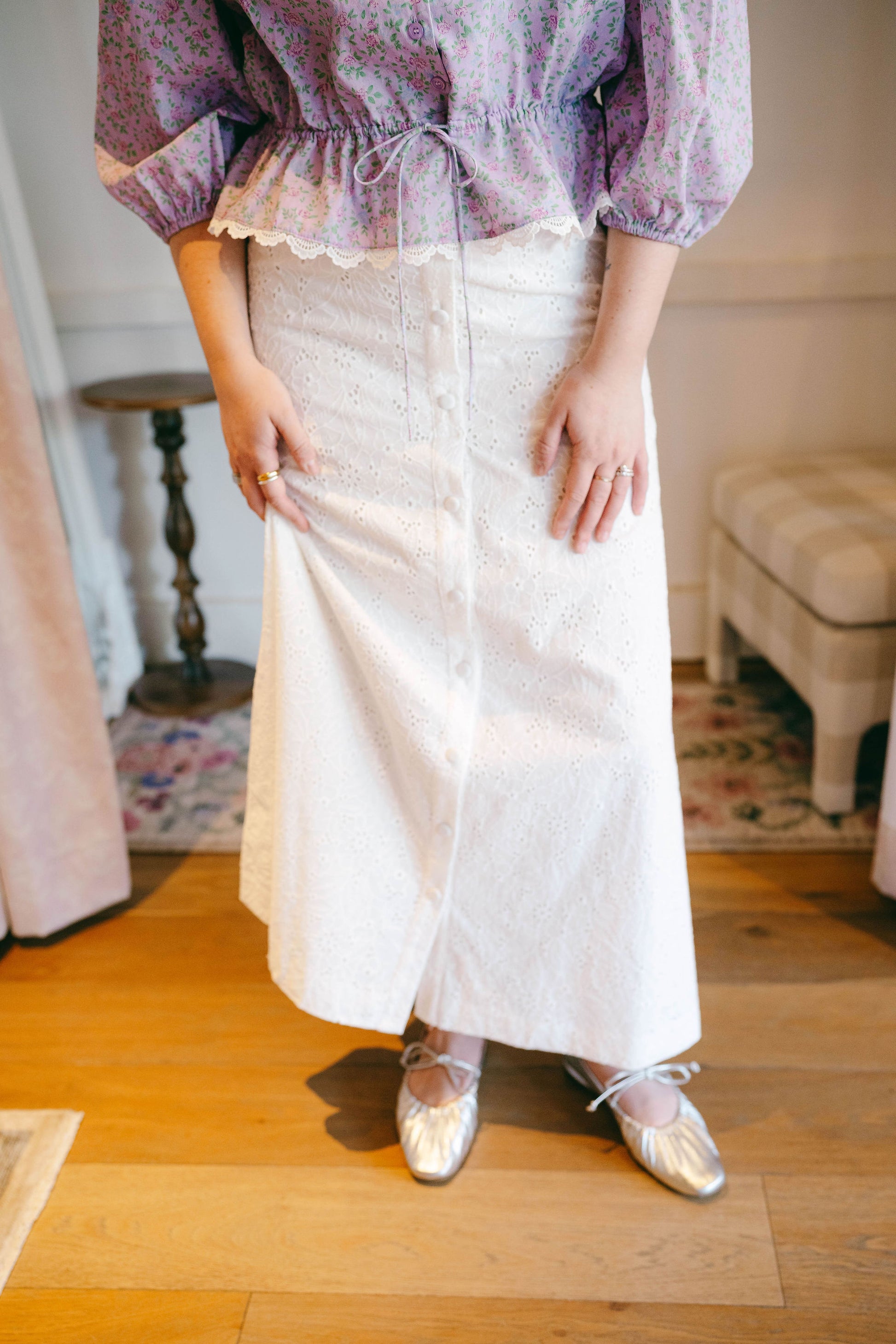Another skirt I love a whole lot! The most flattering A-Line white eyelet skirt perfect for summer. I can just see myself frolicking through a field in this one. High waisted & a zipper closure! Fit is true to size!