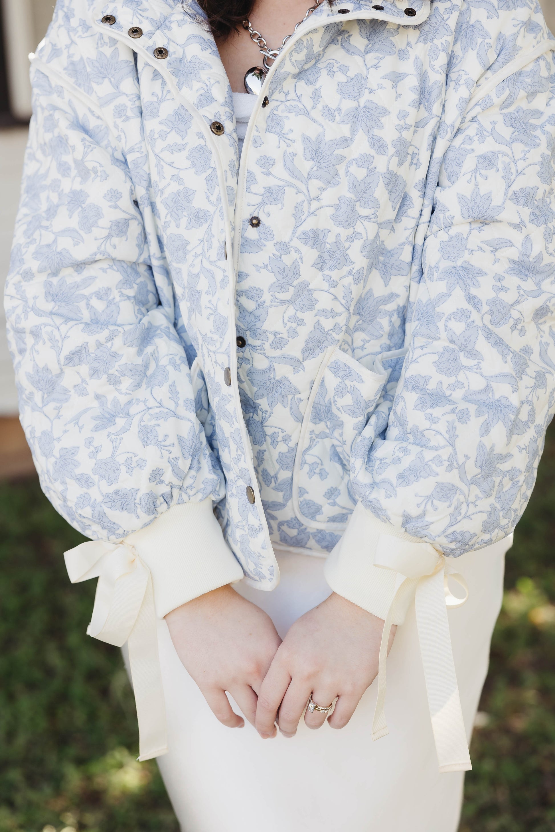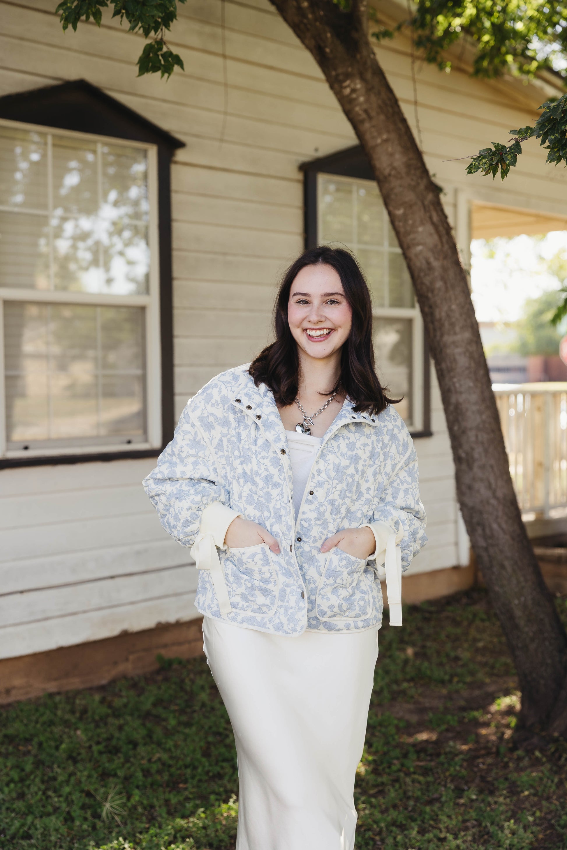 The Sinclair jacket is a light blue and cream floral jacket with bows on the sleeves. This jacket is quilted, light weight and is the perfect jacket to transition into fall! Fit is true to size and model is wearing a small.
