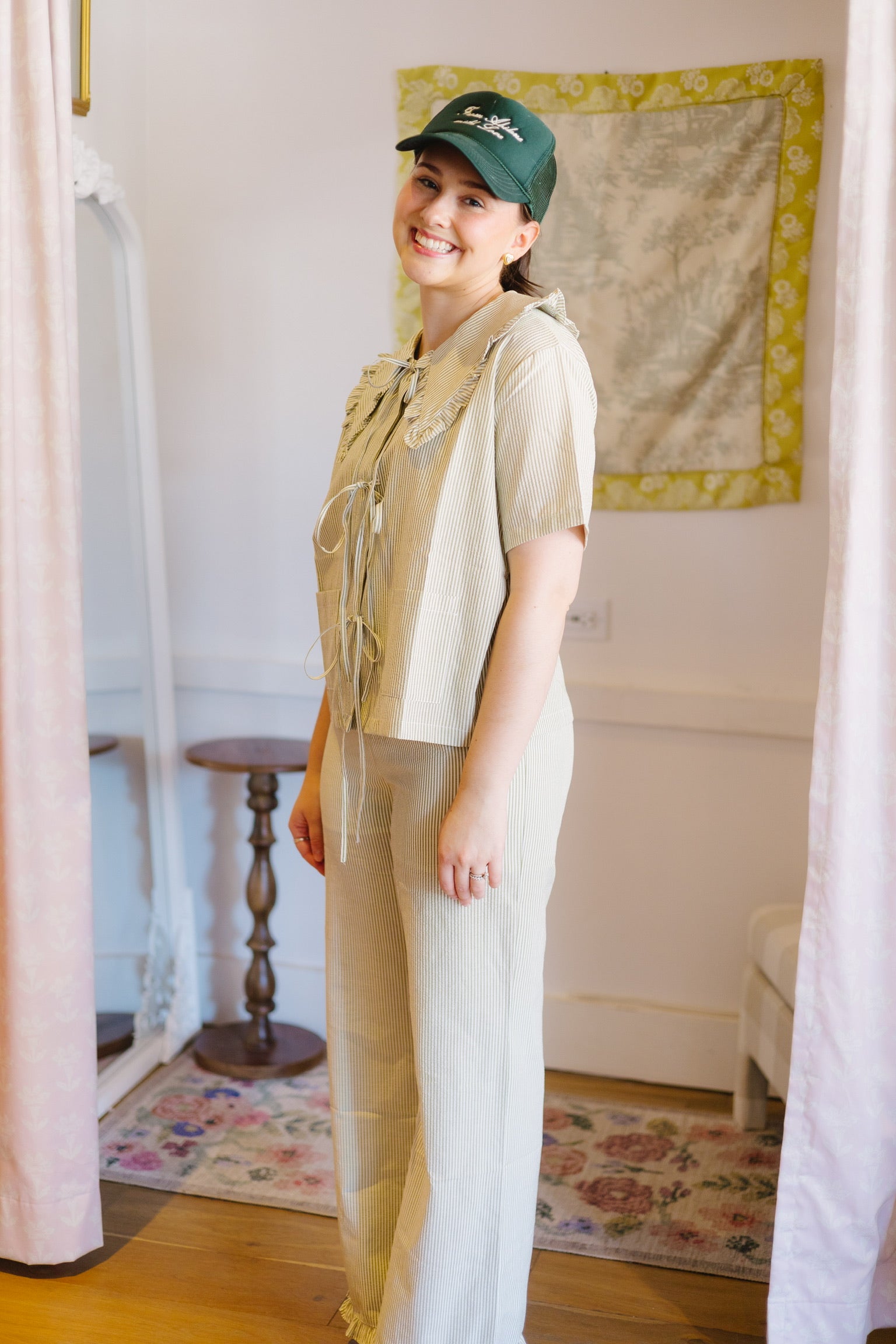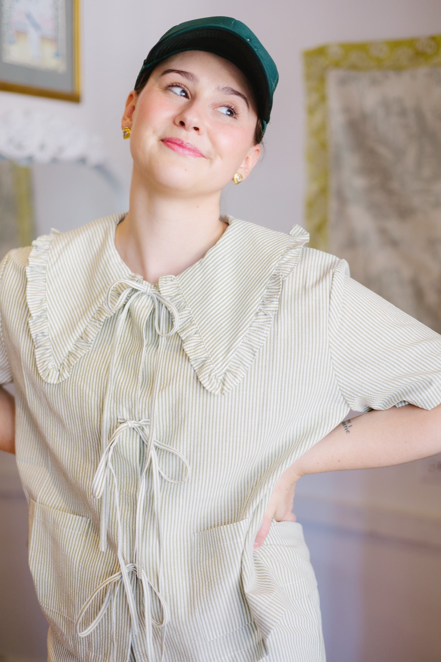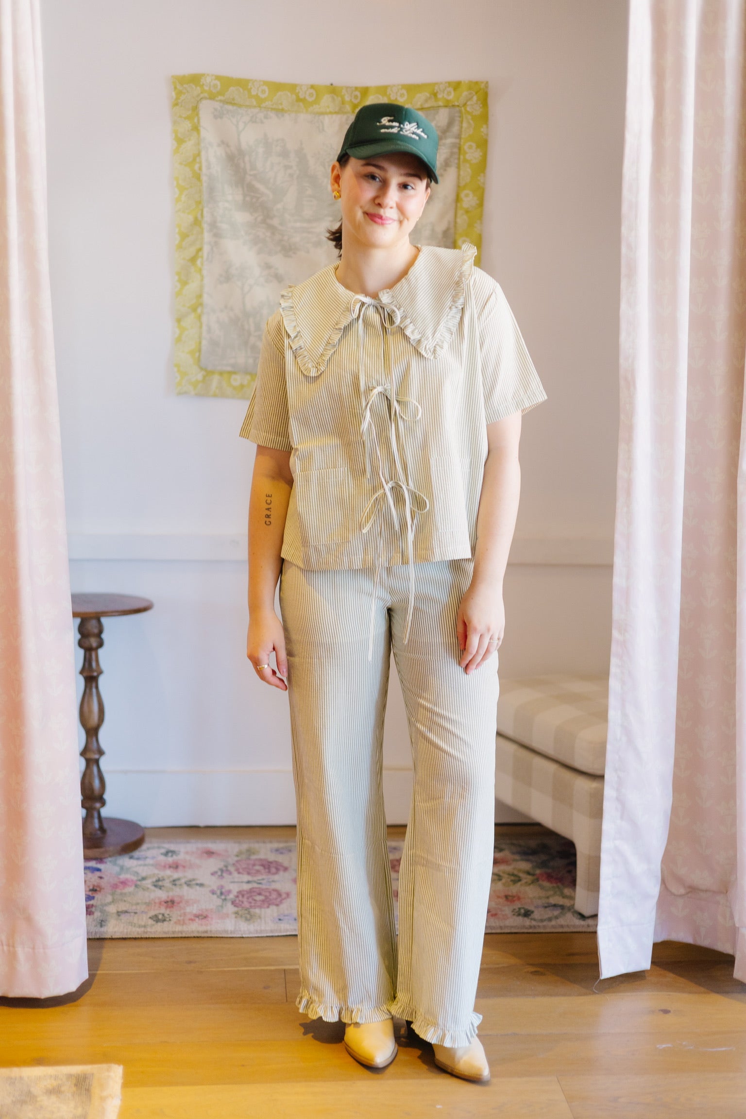 The Chan Set is a sage green striped top and pant set with functioning buttons and ties. I love how easy this set is to throw on for the office or for a fun weekend look! I sized up to a medium in this one!