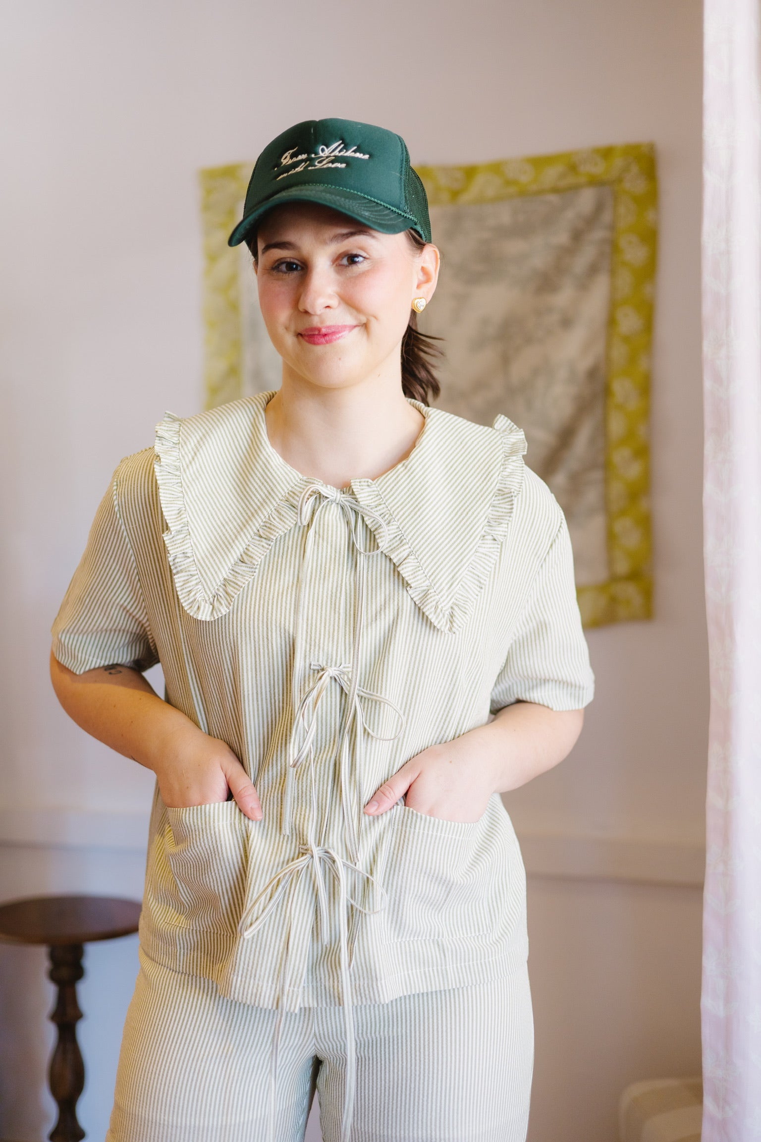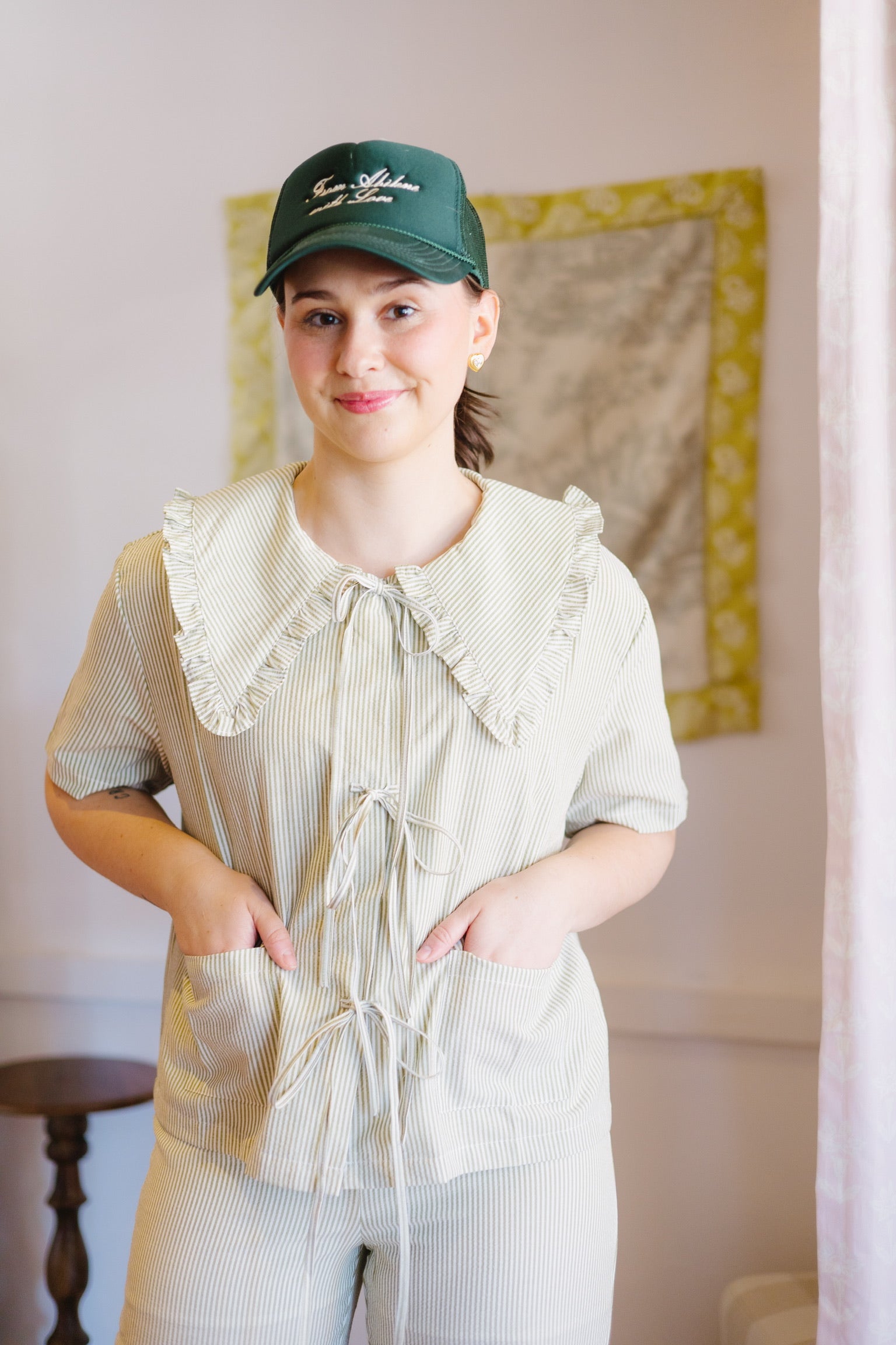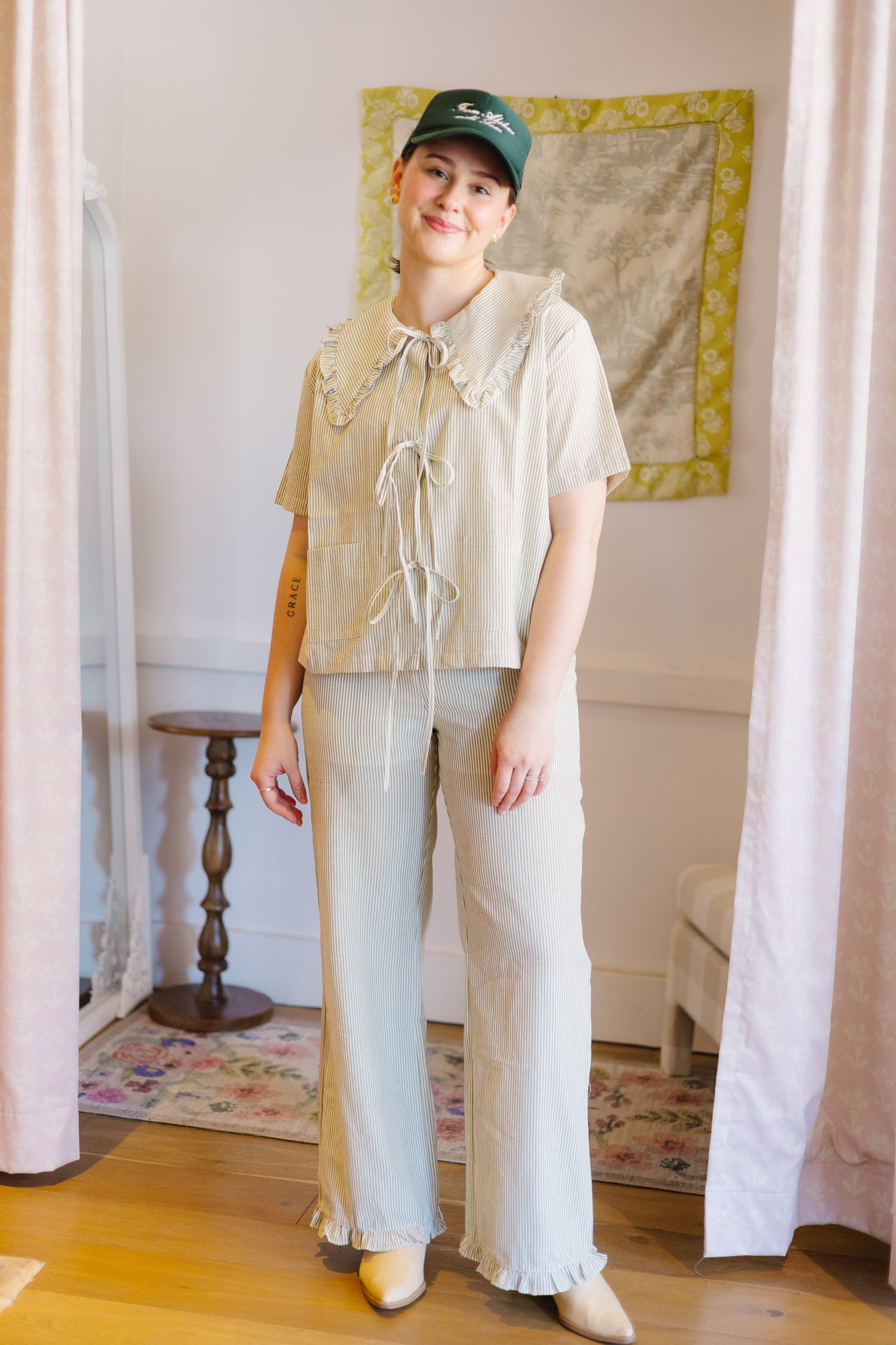The Chan Set is a sage green striped top and pant set with functioning buttons and ties. I love how easy this set is to throw on for the office or for a fun weekend look! I sized up to a medium in this one!