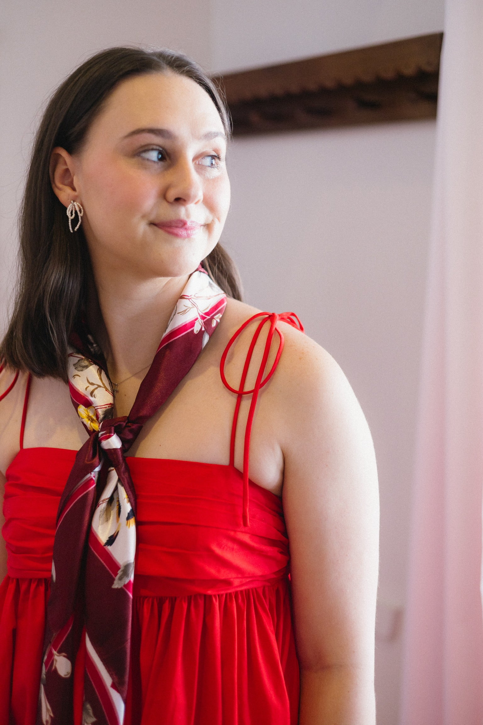 The Jackie dress is a vibrant red maxi dress with tie sleeves and an empire style cut. Zipper back closure with elastic for a comfortable fit. I'm in an XS but can wear a small as well!
