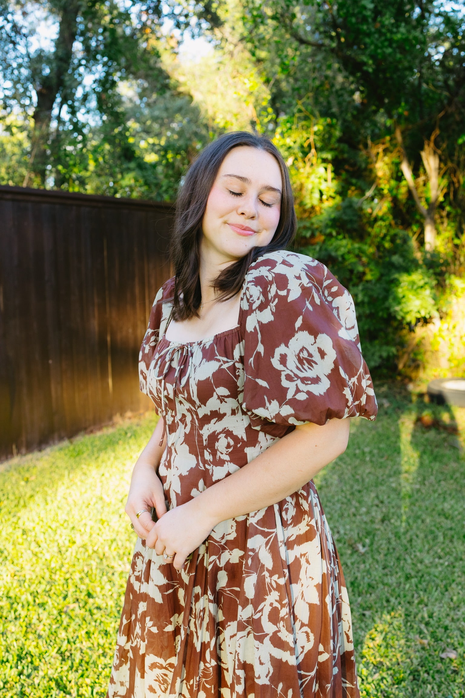 The Quenell dress is the cutest little brown midi dress with light sage flowers throughout and a slightly fitted bodice. Flowy, feminine & super fun — fit is true to size!
