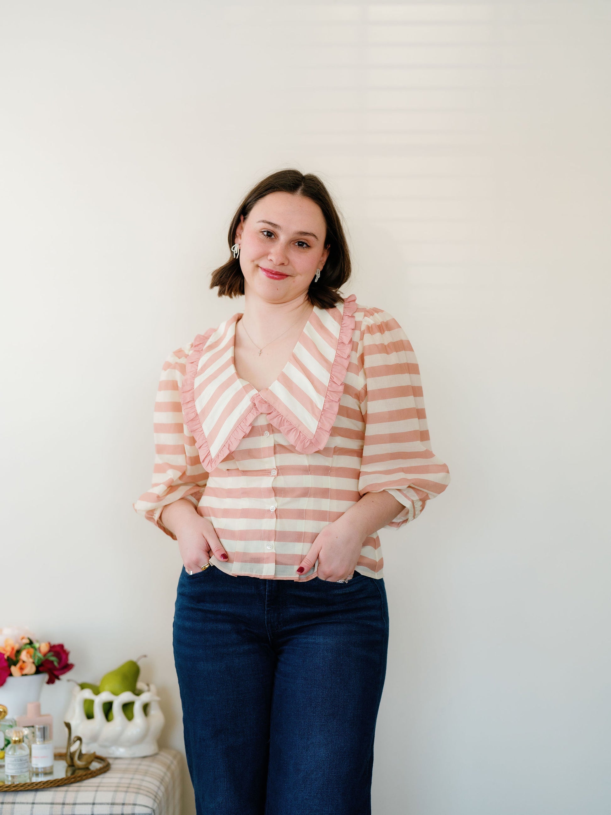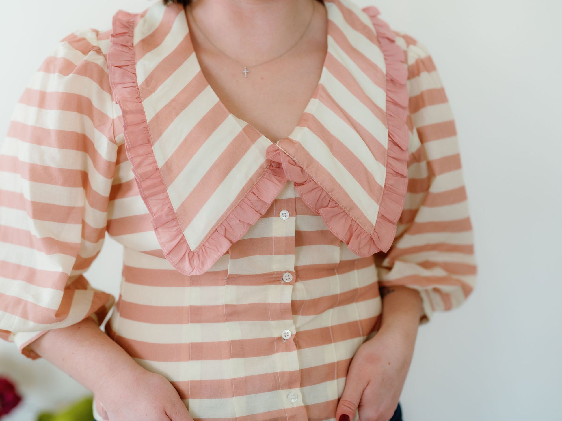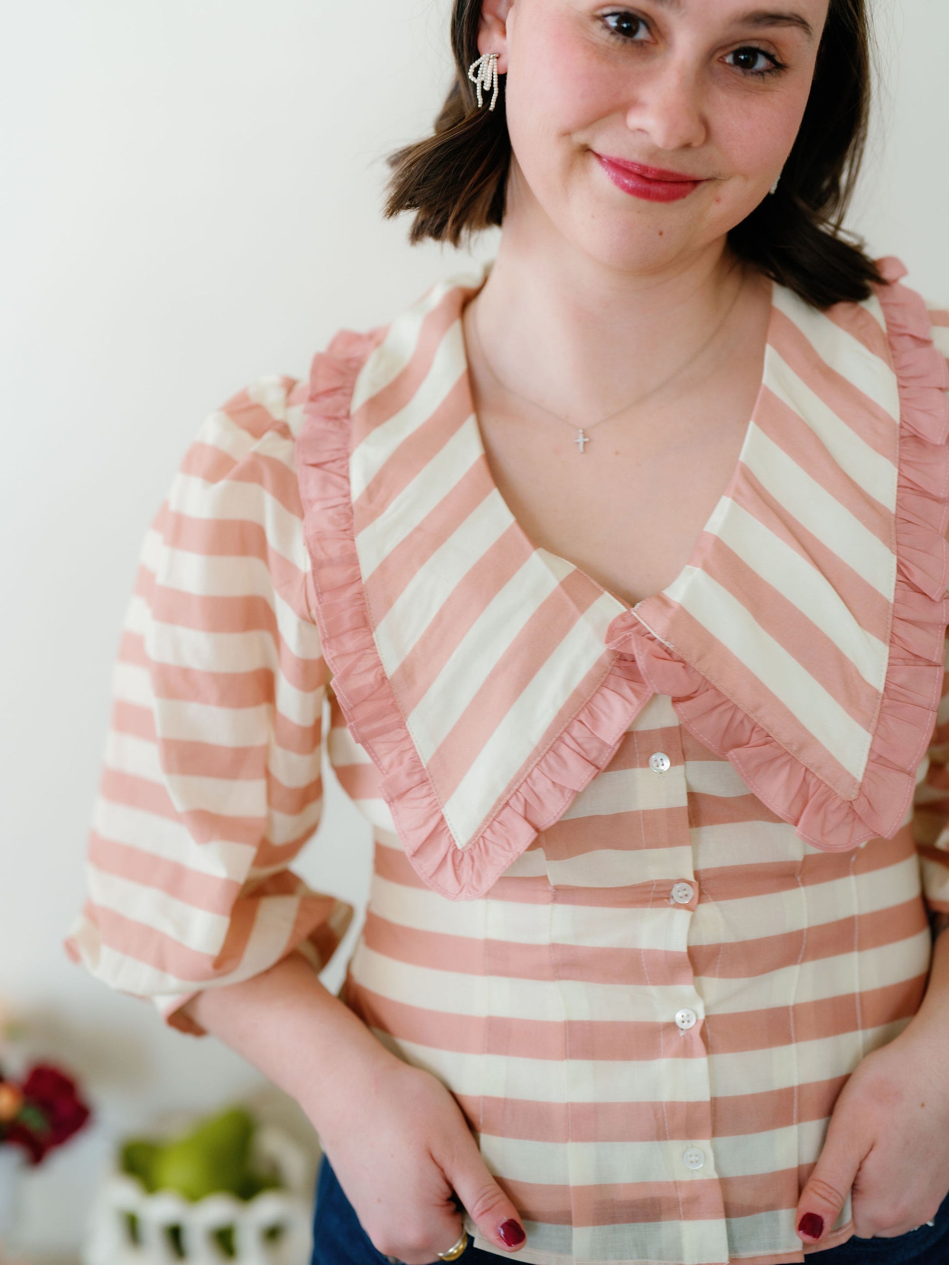 The Anson top would be such a sweet addition to your closet! I love the stripe details, the collar & ruffle, the puff sleeves and the cinching through the waist that is so flattering! Size up if you have a wider rib cage or are in between sizes.