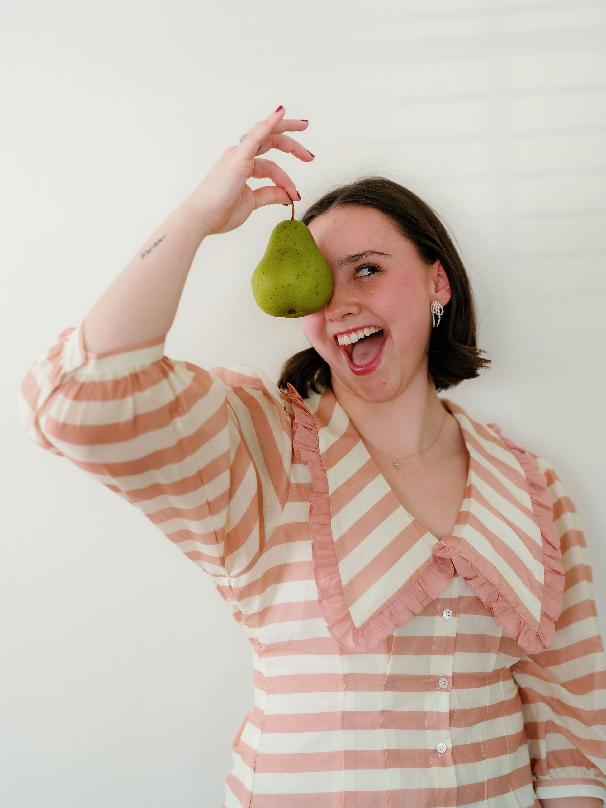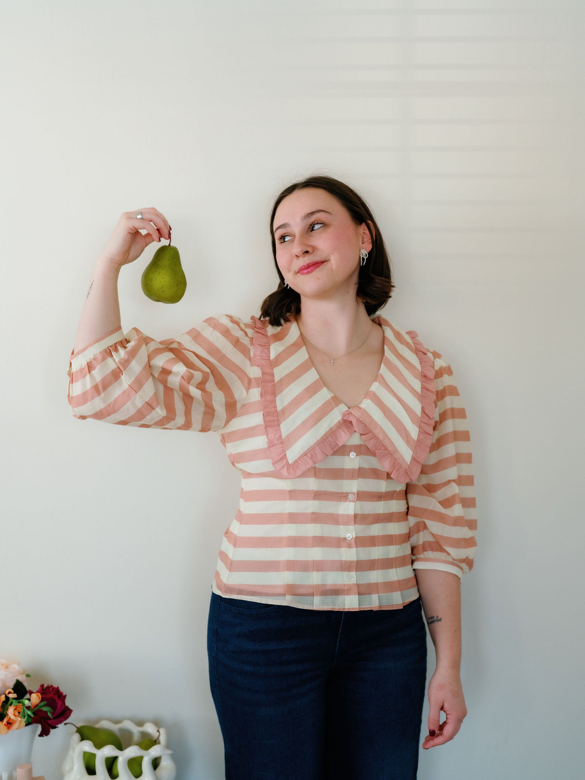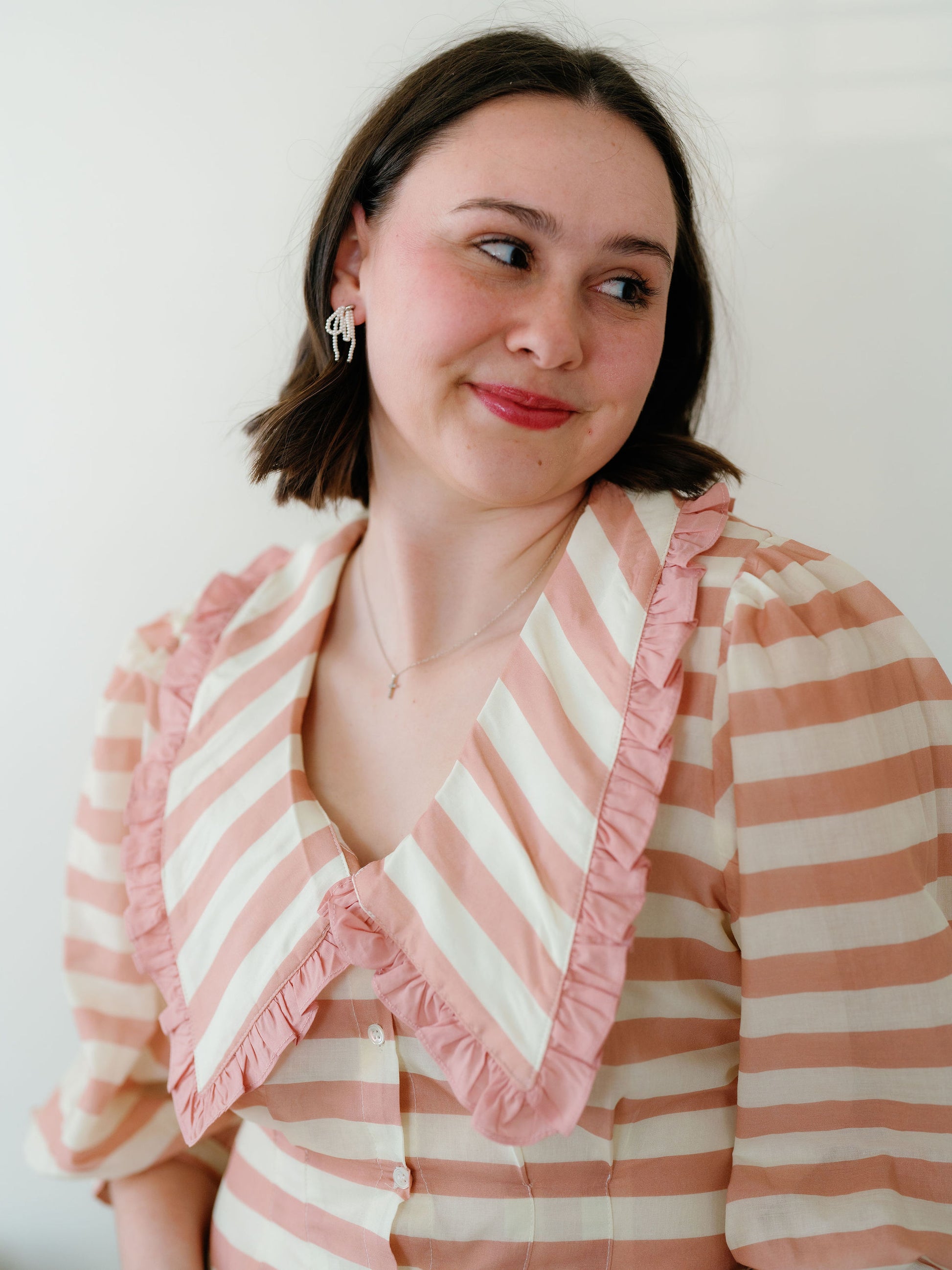 The Anson top would be such a sweet addition to your closet! I love the stripe details, the collar & ruffle, the puff sleeves and the cinching through the waist that is so flattering! Size up if you have a wider rib cage or are in between sizes.