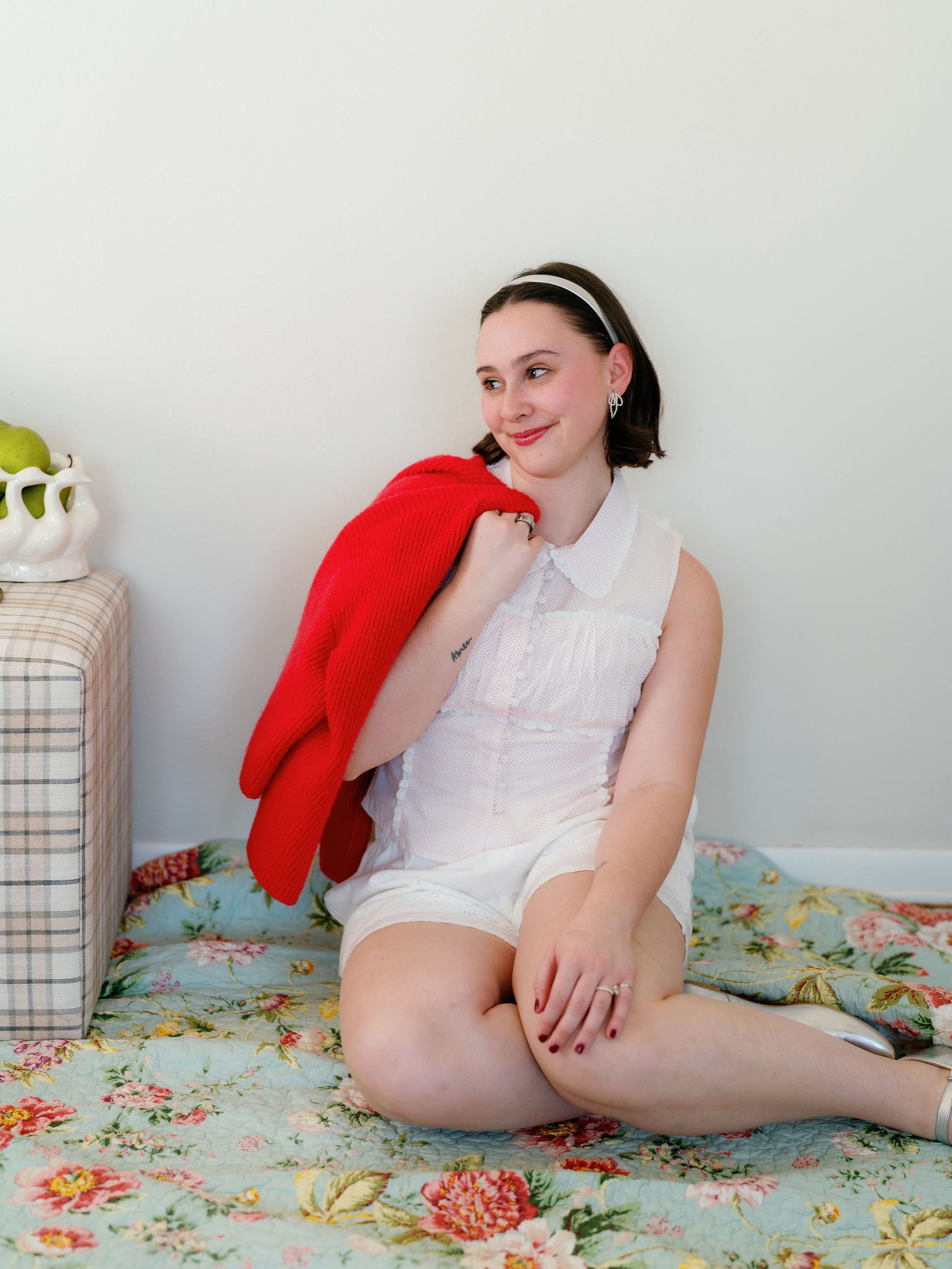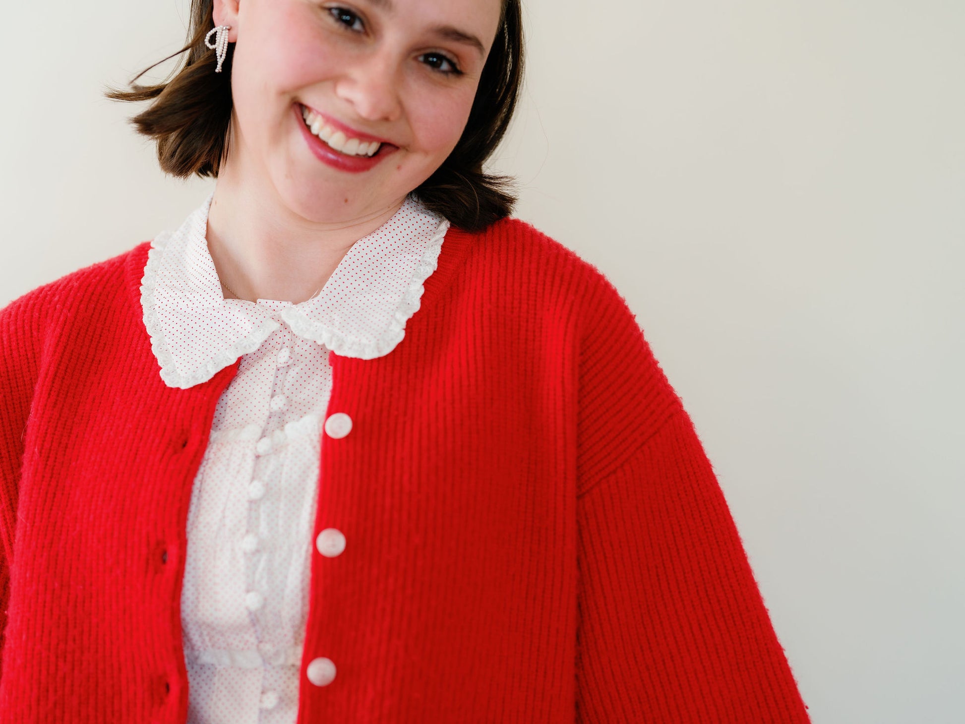 Delia has the cutest little details! Button front, tiny collar and a tie back for extra cinching if needed. Straighter cut so if you’re in between, size up.