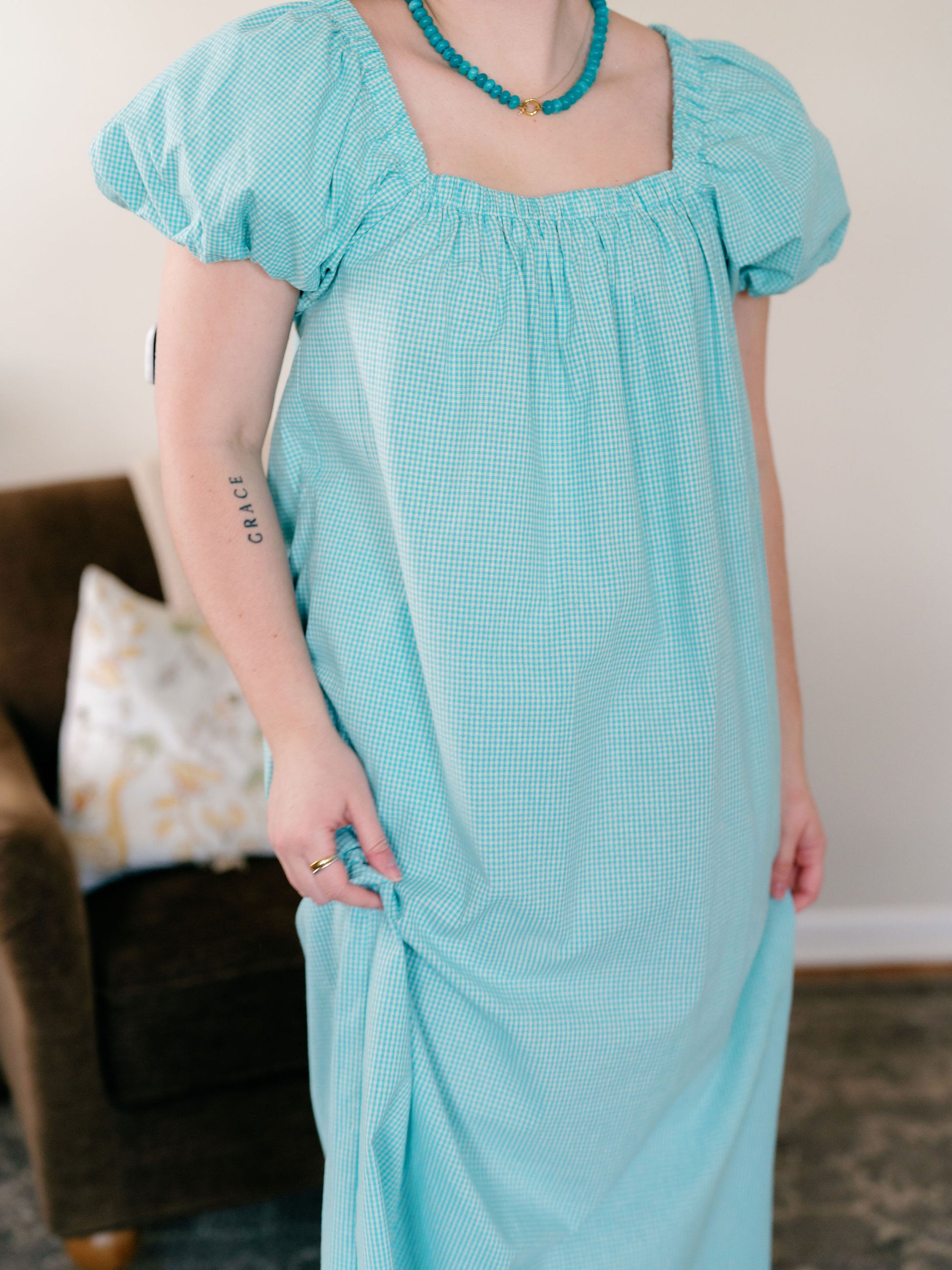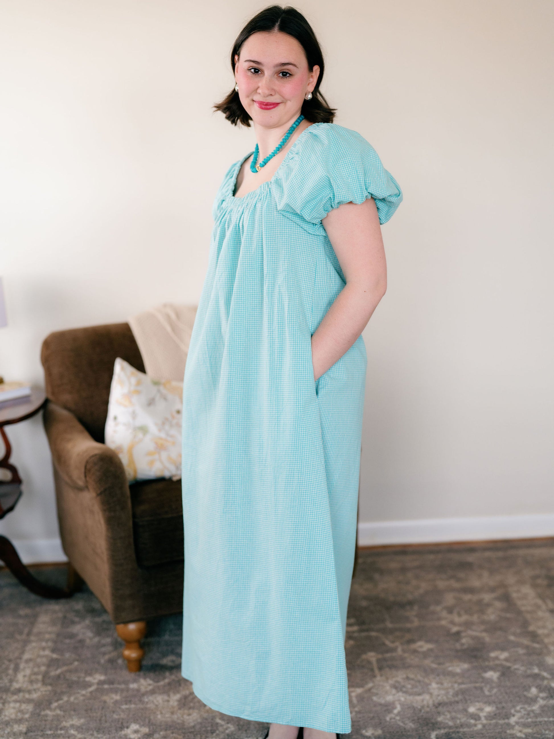 The Parker dress is a lovely square neck, puffy sleeve maxi dress that has pockets & a straighter cut through the body. The fit is slightly oversized especially around the neck so if you’re in between I would recommend sizing down.